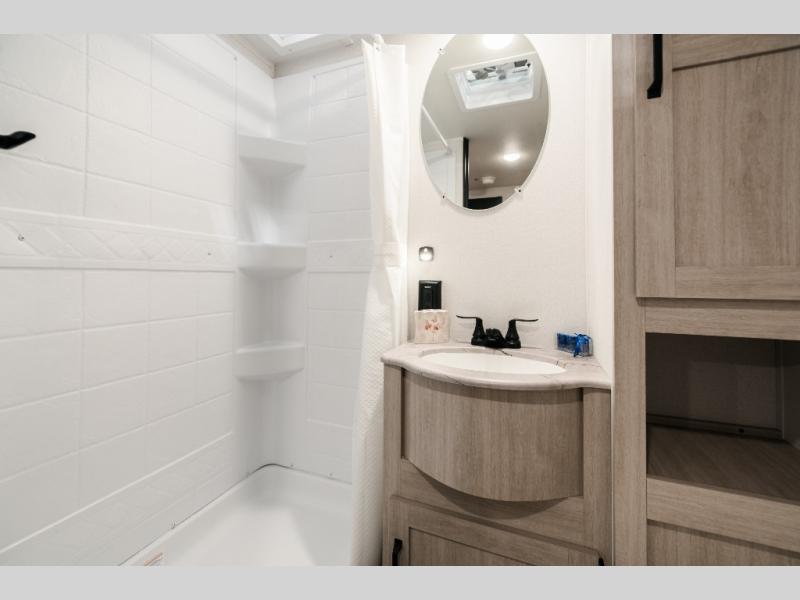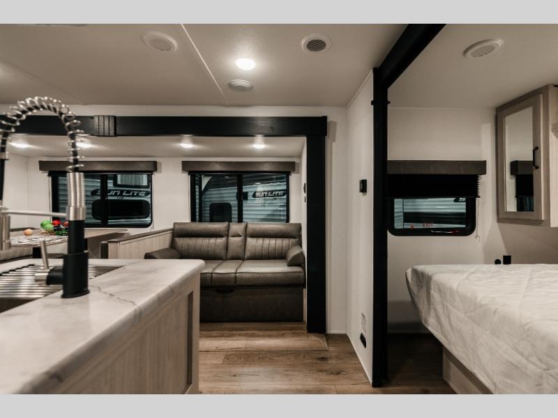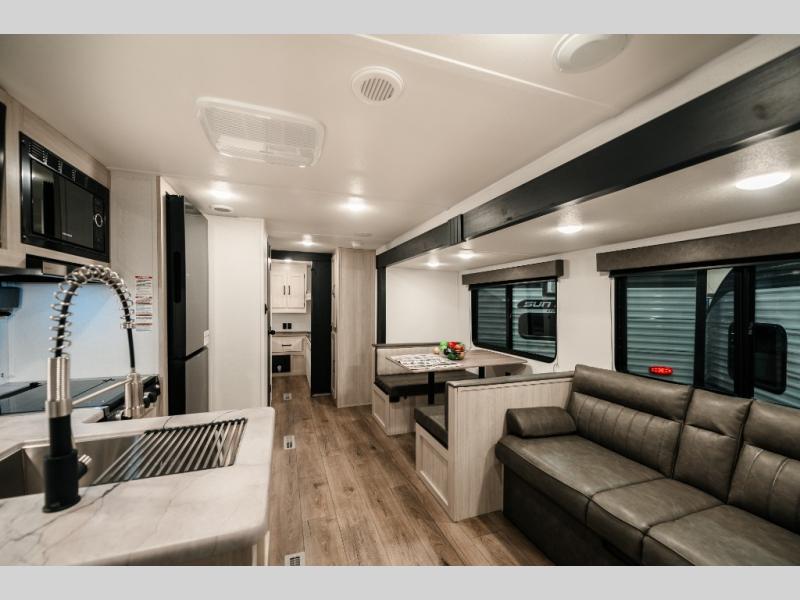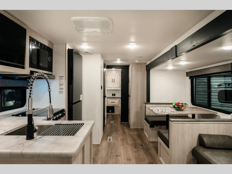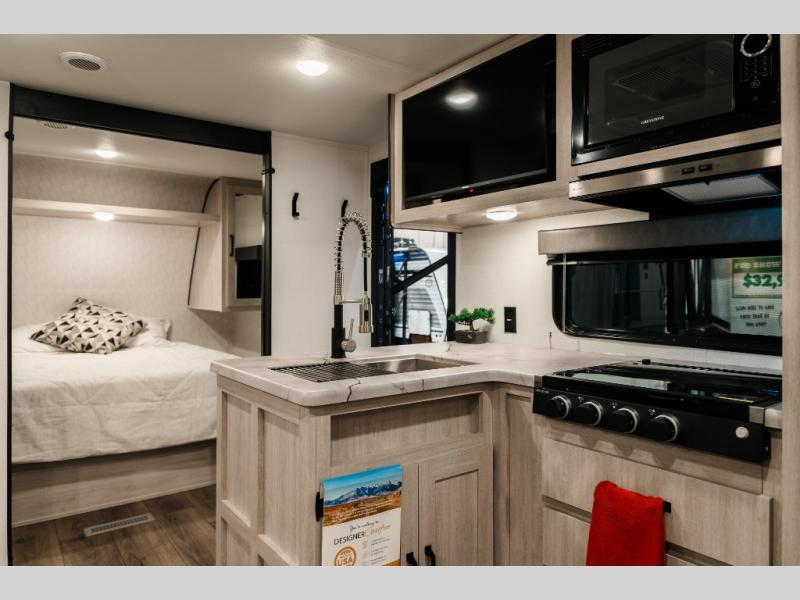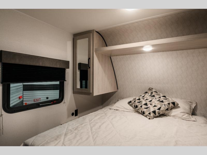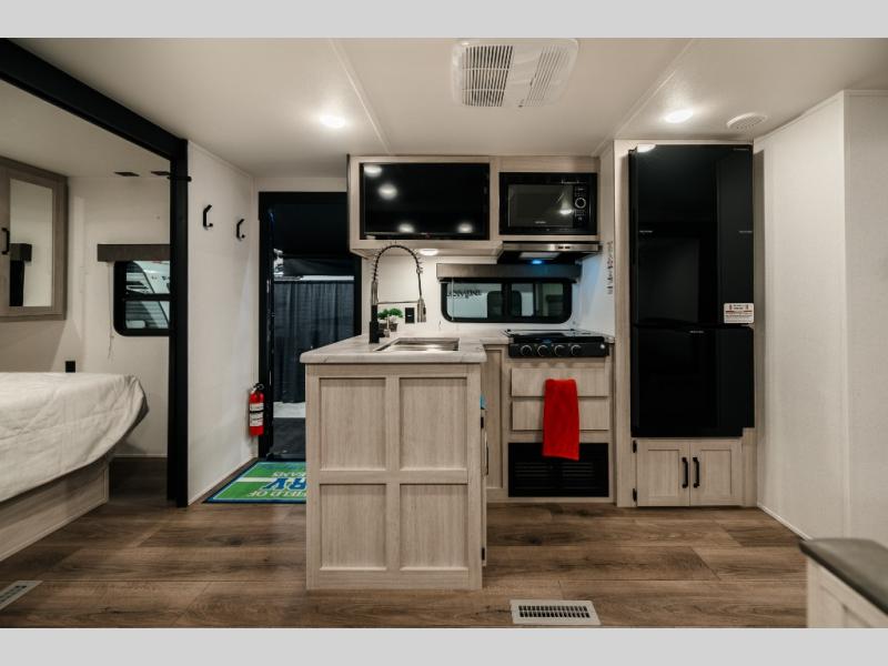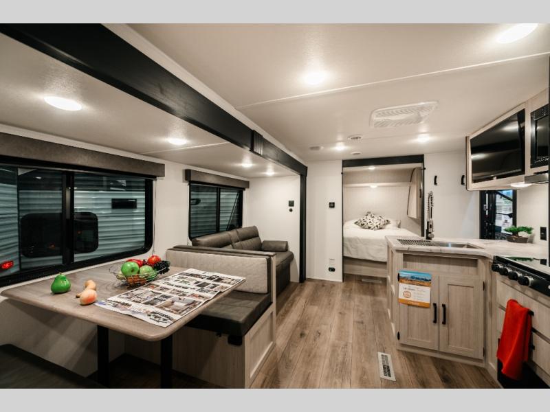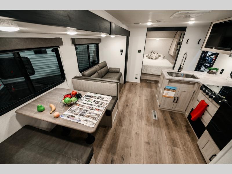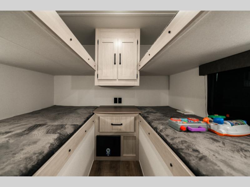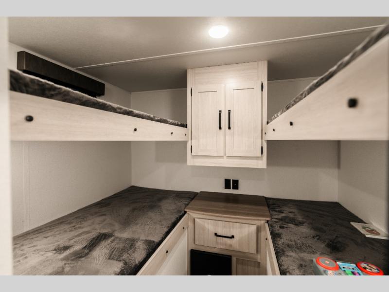 If you're looking for more space, this double axle unit features a large slide so you can walk about freely. Here, you'll find the booth dinette and sofa, which sit across from the optional TV if you want to enjoy movie nights. The full kitchen includes a stainless microwave and three burner cooktop to make meals, plus a pantry and 12V refrigerator for food storage. And an optional outside kitchen with a griddle can be added if you enjoy cooking outdoors! Your guests or littles are sure to enjoy the rear private bunkhouse with four bunk beds and a wardrobe for their things!