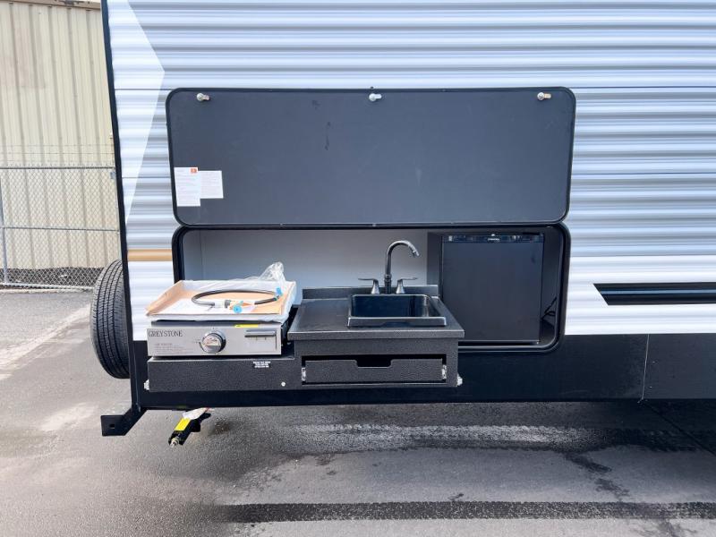 If you're looking for more space, this double axle unit features a large slide so you can walk about freely. Here, you'll find the booth dinette and sofa, which sit across from the optional TV if you want to enjoy movie nights. The full kitchen includes a stainless microwave and three burner cooktop to make meals, plus a pantry and 12V refrigerator for food storage. And an optional outside kitchen with a griddle can be added if you enjoy cooking outdoors! Your guests or littles are sure to enjoy the rear private bunkhouse with four bunk beds and a wardrobe for their things!