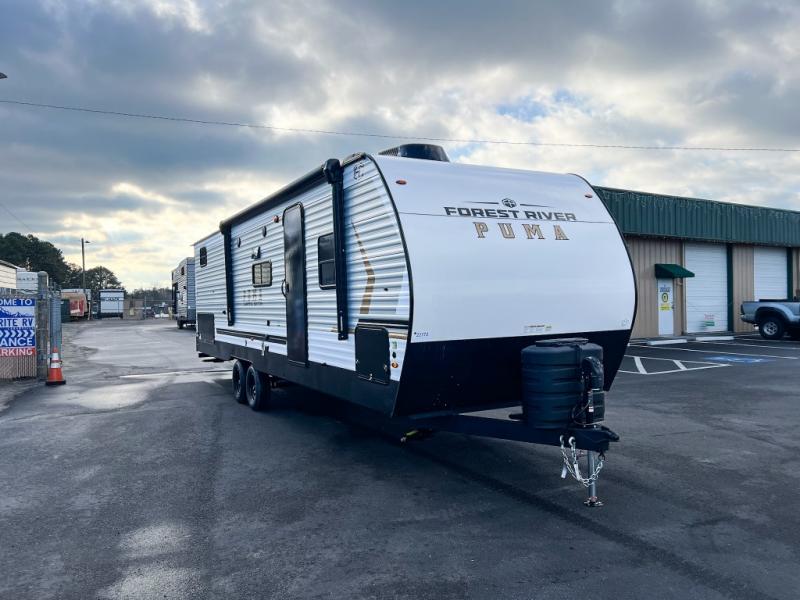 The Puma Camping Edition by Palomino offer an affordable travel trailer for rookie campers or seasoned RVers! They are built with 5/8" tongue and groove plywood flooring and a front diamond plate for added protection. There are also exterior clamp style door latches, back up camera prep, and 20 lb. LP bottles. Head inside to find Thermofoil countertops with a smooth drop edge, bedroom USB ports and outlets, and a GE appliance and kitchen package.