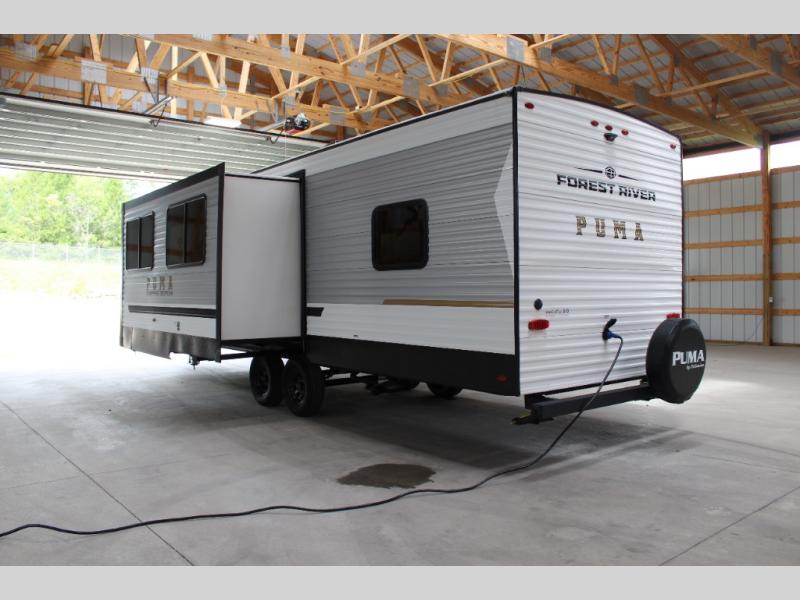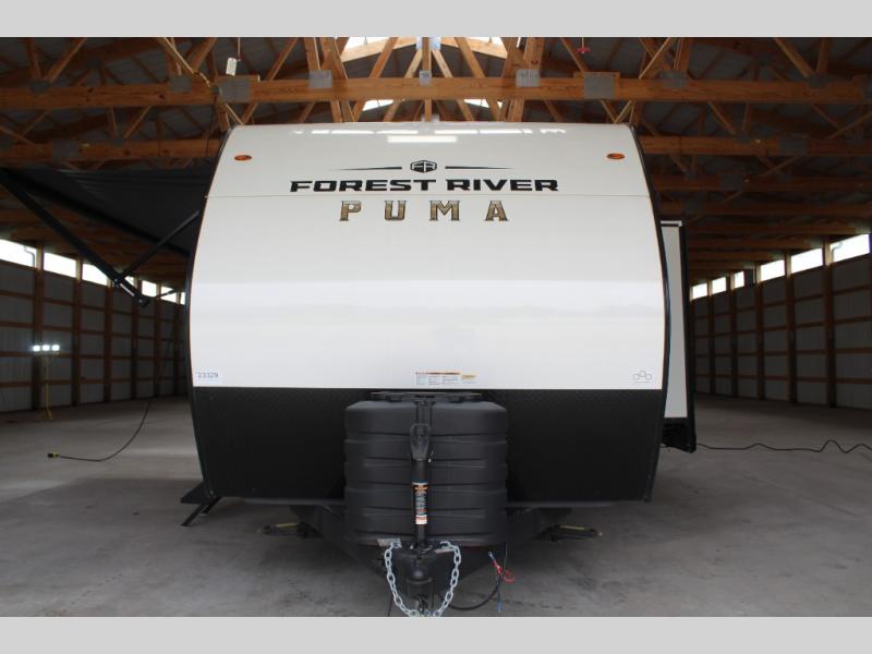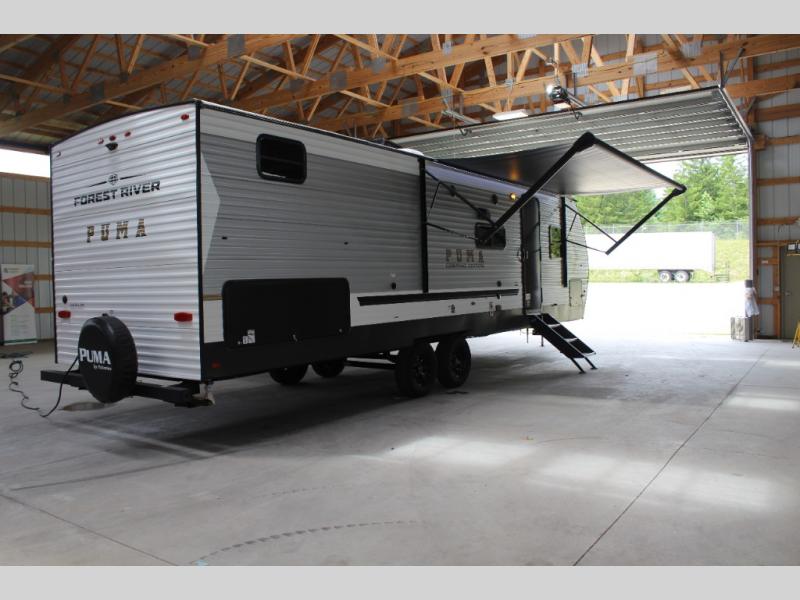 The Puma Camping Edition by Palomino offer an affordable travel trailer for rookie campers or seasoned RVers! They are built with 5/8" tongue and groove plywood flooring and a front diamond plate for added protection. There are also exterior clamp style door latches, back up camera prep, and 20 lb. LP bottles. Head inside to find Thermofoil countertops with a smooth drop edge, bedroom USB ports and outlets, and a GE appliance and kitchen package.
