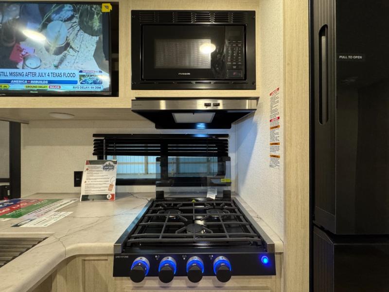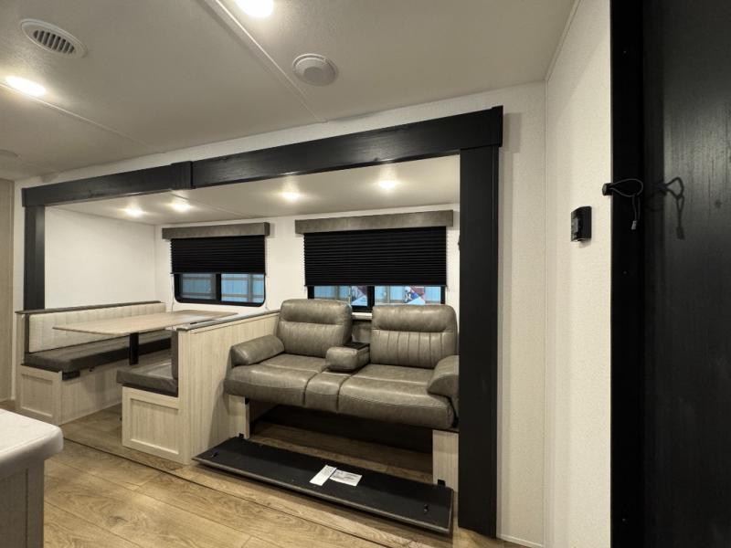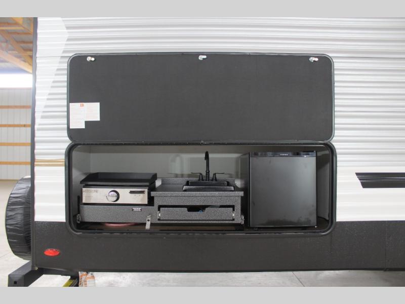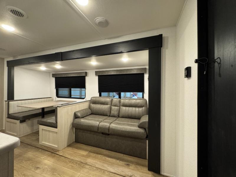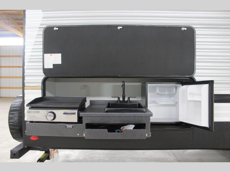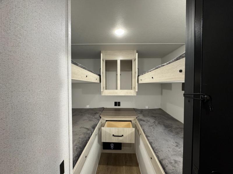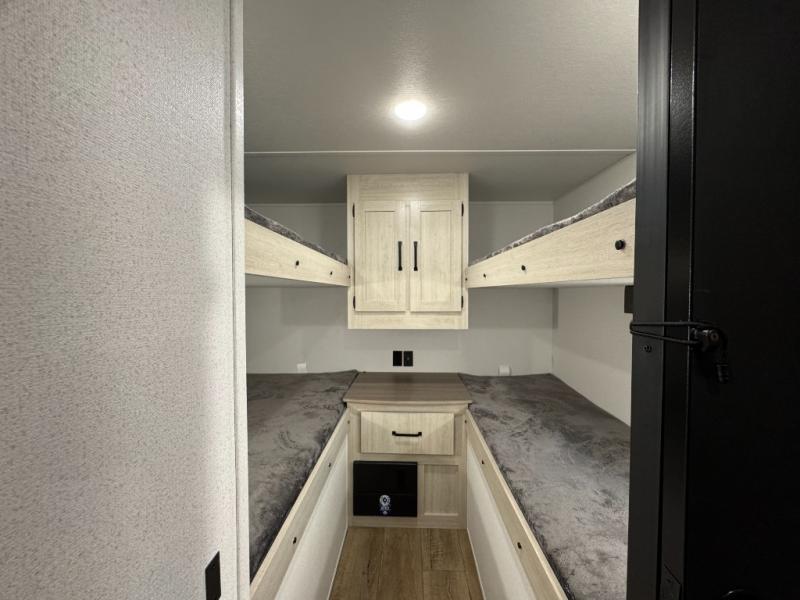 If you're looking for more space, this double axle unit features a large slide so you can walk about freely. Here, you'll find the booth dinette and sofa, which sit across from the optional TV if you want to enjoy movie nights. The full kitchen includes a stainless microwave and three burner cooktop to make meals, plus a pantry and 12V refrigerator for food storage. And an optional outside kitchen with a griddle can be added if you enjoy cooking outdoors! Your guests or littles are sure to enjoy the rear private bunkhouse with four bunk beds and a wardrobe for their things!