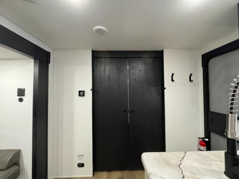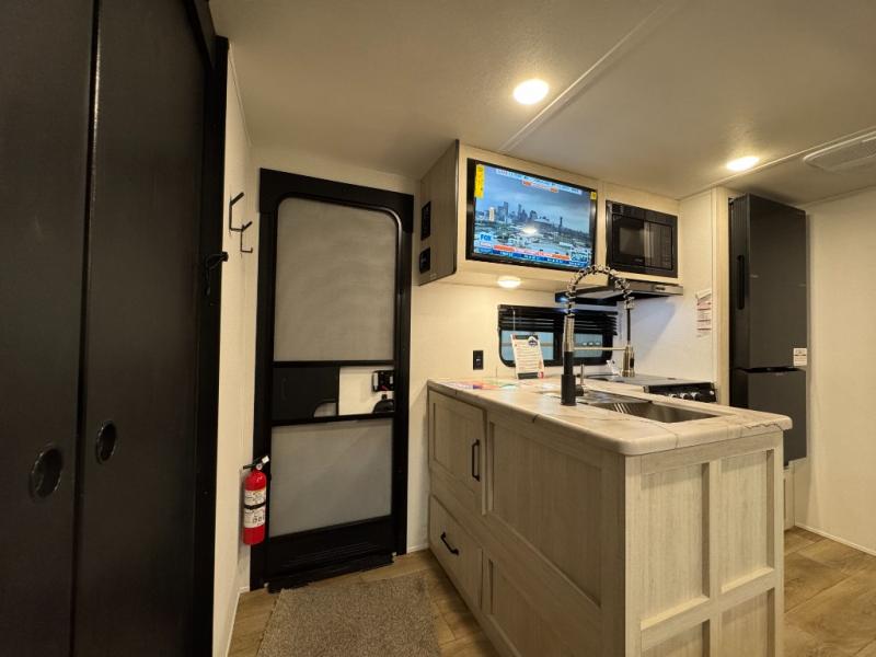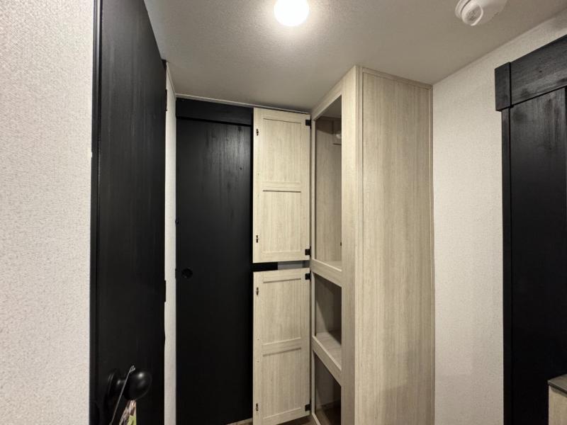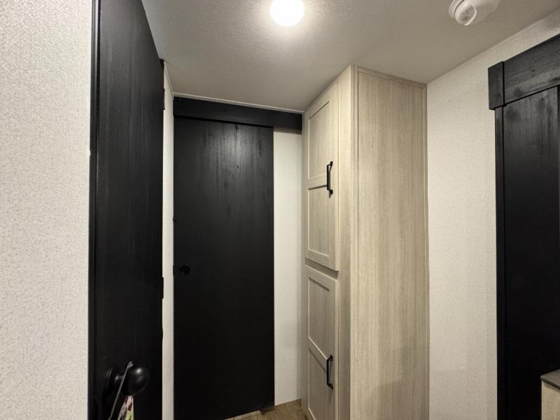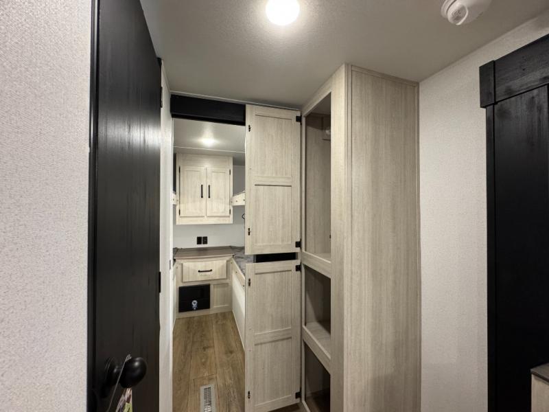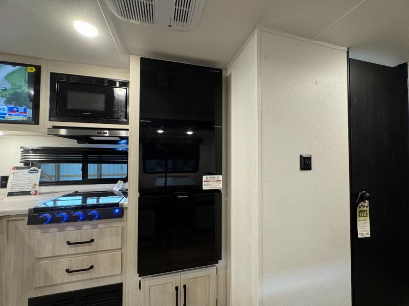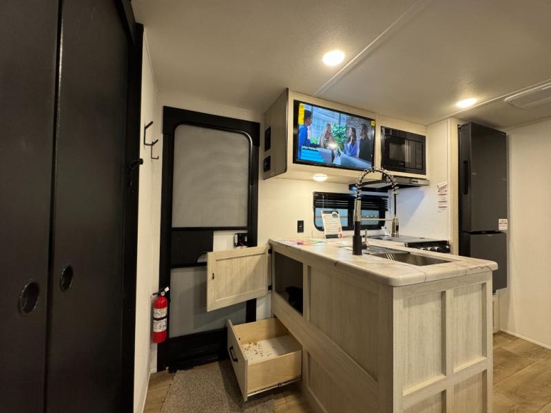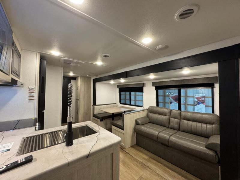 If you're looking for more space, this double axle unit features a large slide so you can walk about freely. Here, you'll find the booth dinette and sofa, which sit across from the optional TV if you want to enjoy movie nights. The full kitchen includes a stainless microwave and three burner cooktop to make meals, plus a pantry and 12V refrigerator for food storage. And an optional outside kitchen with a griddle can be added if you enjoy cooking outdoors! Your guests or littles are sure to enjoy the rear private bunkhouse with four bunk beds and a wardrobe for their things!