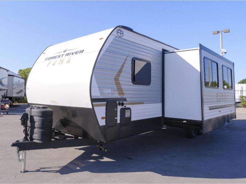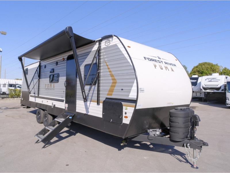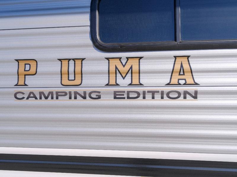 The Puma Camping Edition by Palomino offer an affordable travel trailer for rookie campers or seasoned RVers! They are built with 5/8" tongue and groove plywood flooring and a front diamond plate for added protection. There are also exterior clamp style door latches, back up camera prep, and 20 lb. LP bottles. Head inside to find Thermofoil countertops with a smooth drop edge, bedroom USB ports and outlets, and a GE appliance and kitchen package.