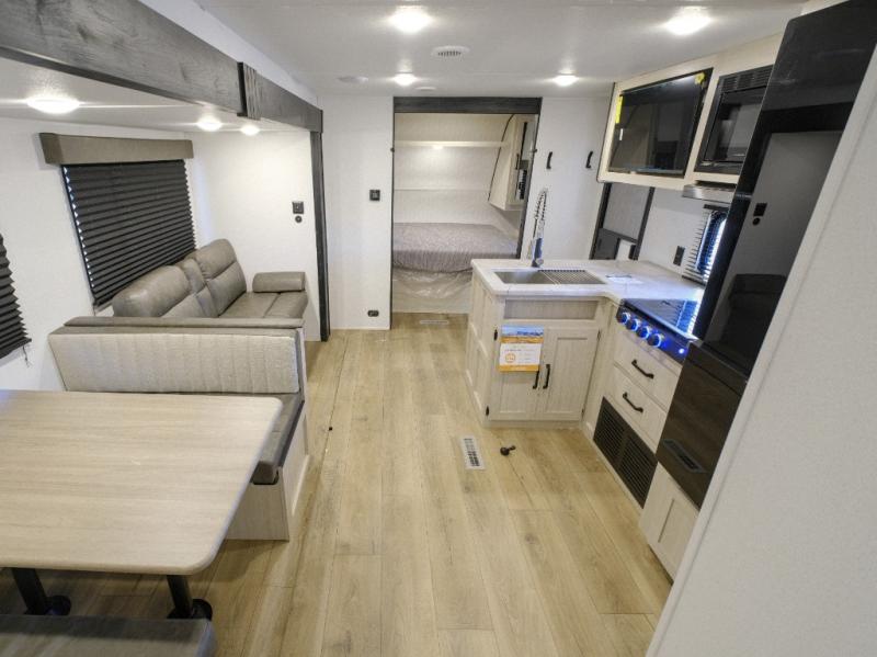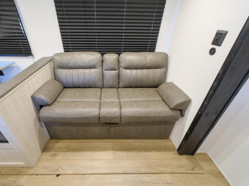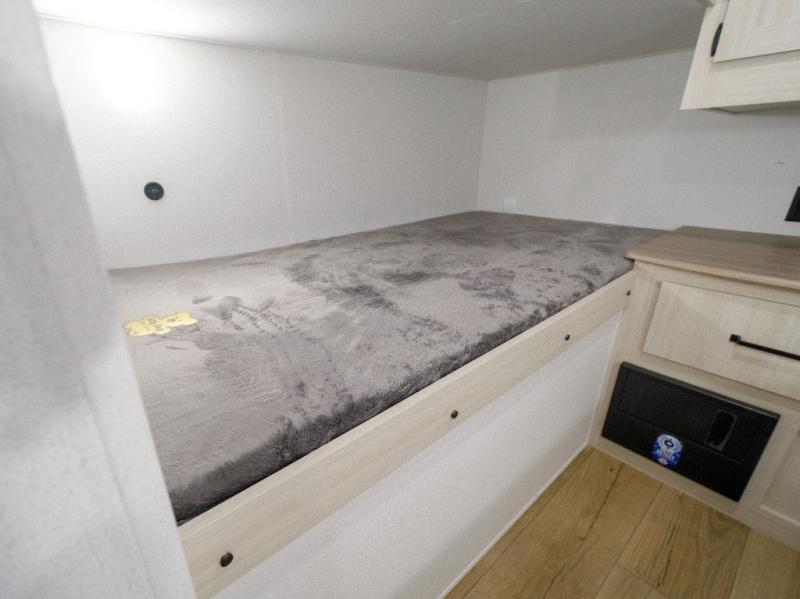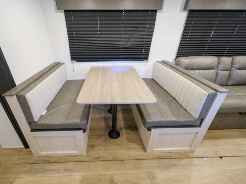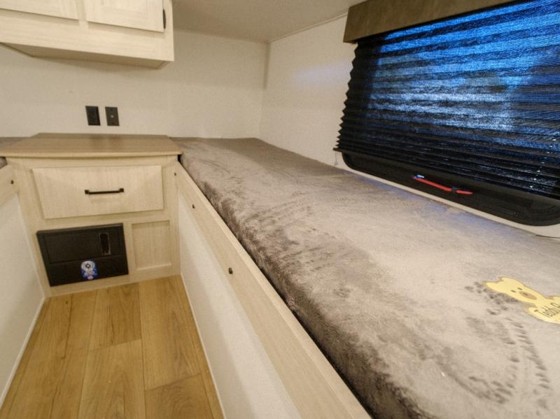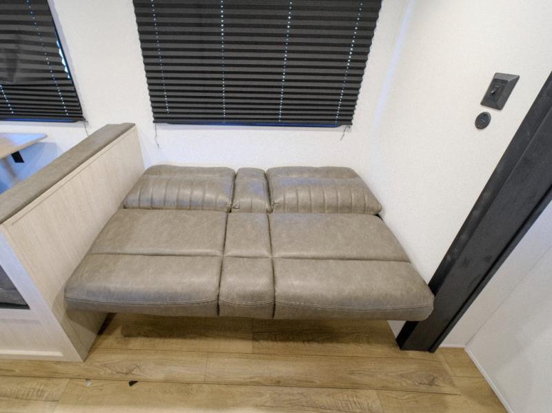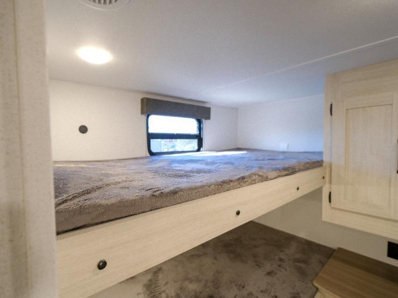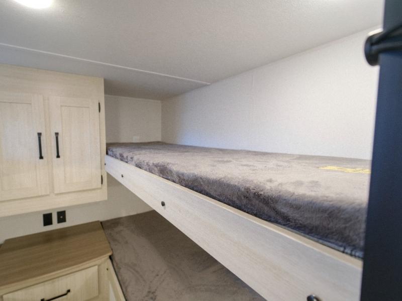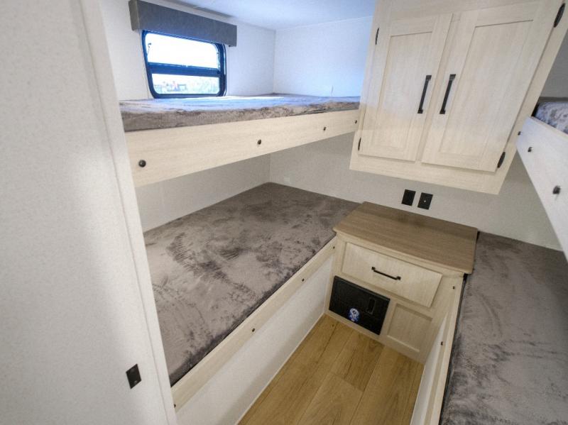 If you're looking for more space, this double axle unit features a large slide so you can walk about freely. Here, you'll find the booth dinette and sofa, which sit across from the entertainment center if you want to enjoy movie nights. The full kitchen includes a stainless microwave and three burner cooktop to make meals, plus a pantry and 12V refrigerator for food storage. Your guests or littles are sure to enjoy the rear private bunkhouse with four bunk beds and a wardrobe for their things!