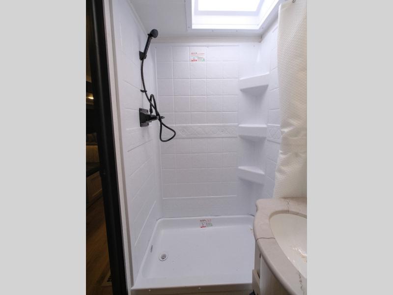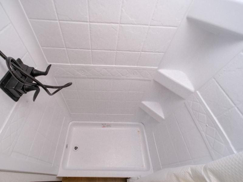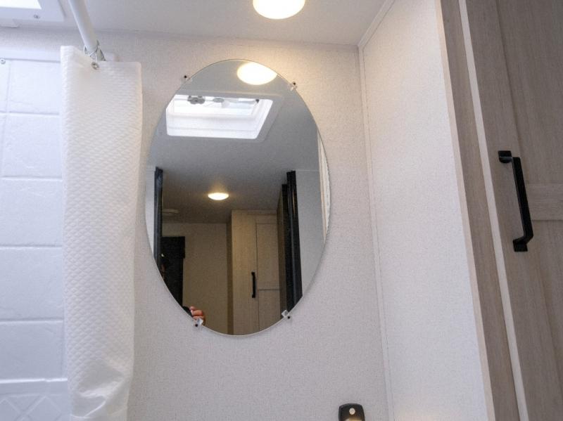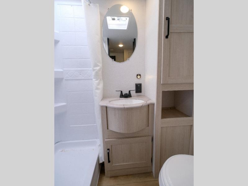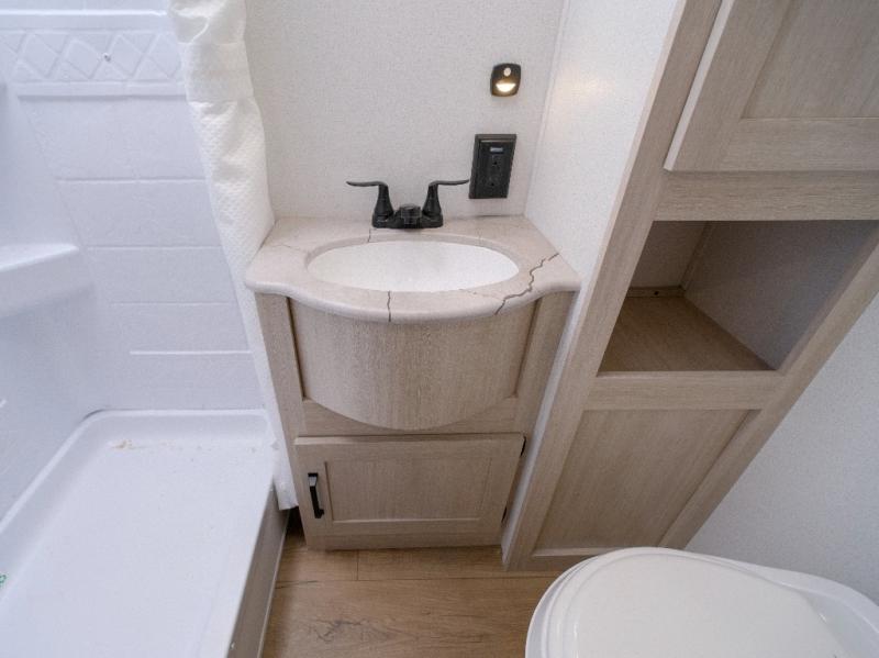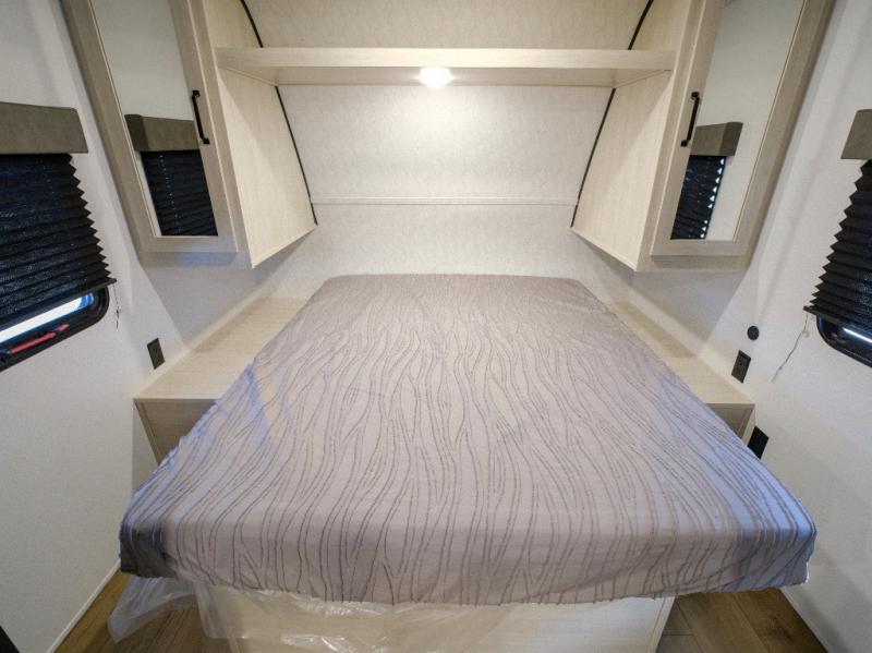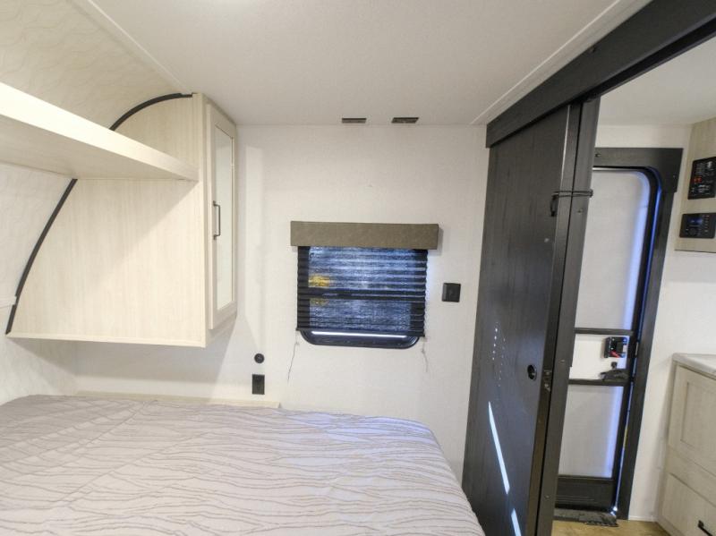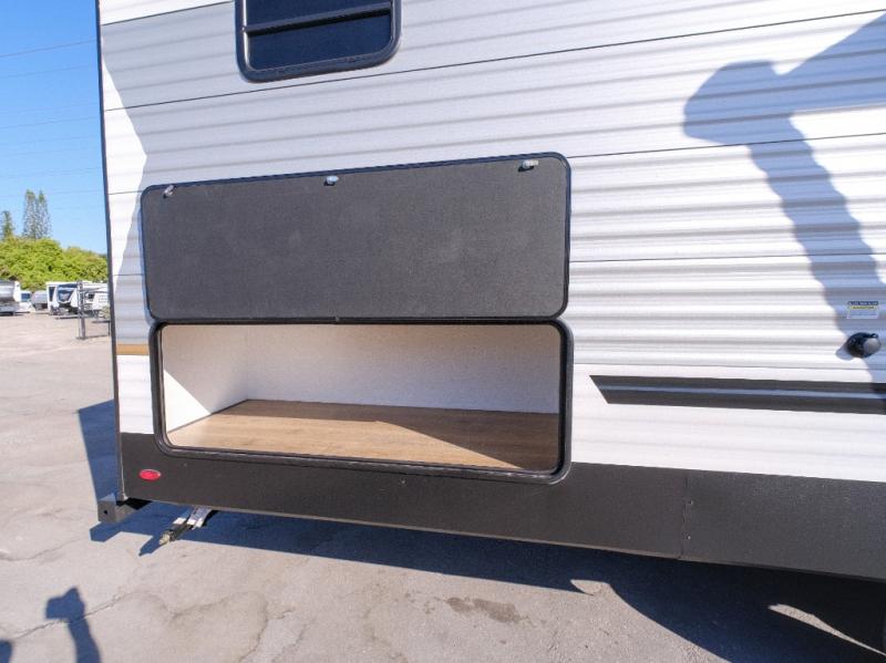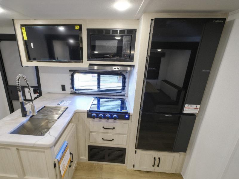 If you're looking for more space, this double axle unit features a large slide so you can walk about freely. Here, you'll find the booth dinette and sofa, which sit across from the entertainment center if you want to enjoy movie nights. The full kitchen includes a stainless microwave and three burner cooktop to make meals, plus a pantry and 12V refrigerator for food storage. Your guests or littles are sure to enjoy the rear private bunkhouse with four bunk beds and a wardrobe for their things!