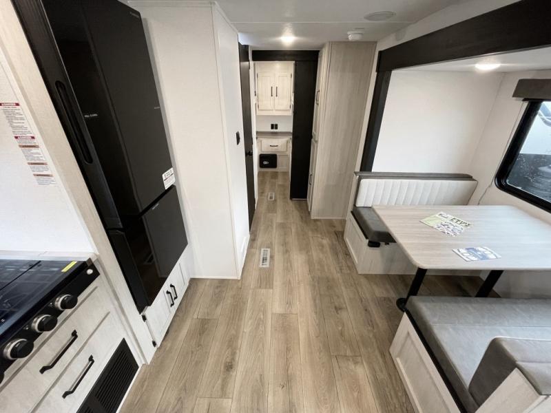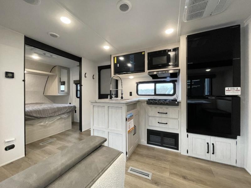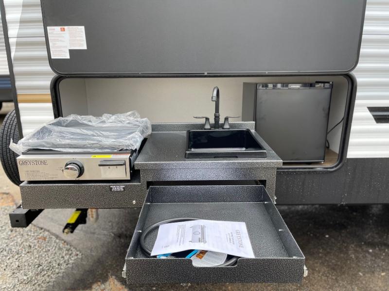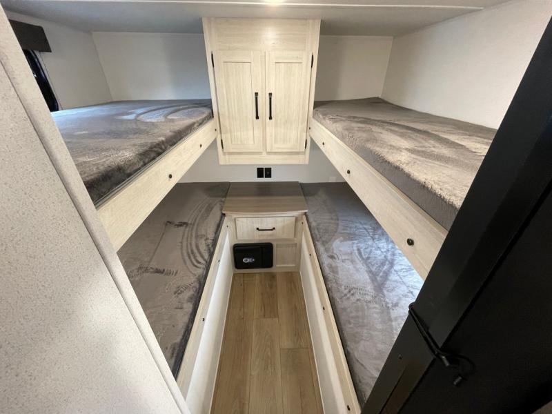 If you're looking for more space, this double axle unit features a large slide so you can walk about freely. Here, you'll find the booth dinette and sofa, which sit across from the optional TV if you want to enjoy movie nights. The full kitchen includes a stainless microwave and three burner cooktop to make meals, plus a pantry and 12V refrigerator for food storage. And an optional outside kitchen with a griddle can be added if you enjoy cooking outdoors! Your guests or littles are sure to enjoy the rear private bunkhouse with four bunk beds and a wardrobe for their things!