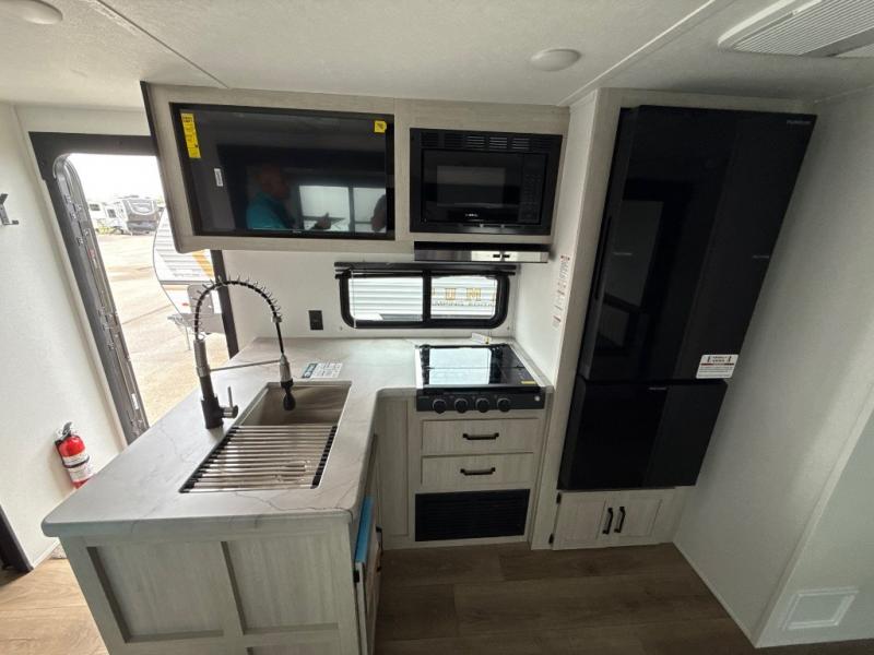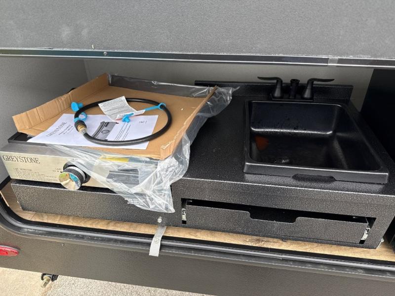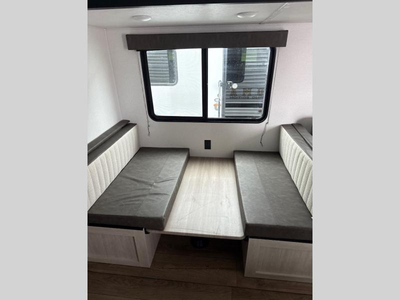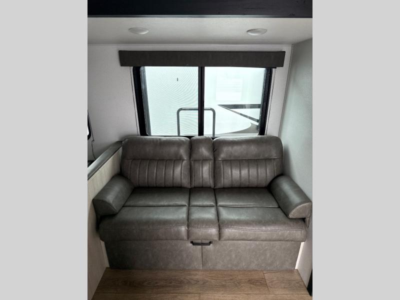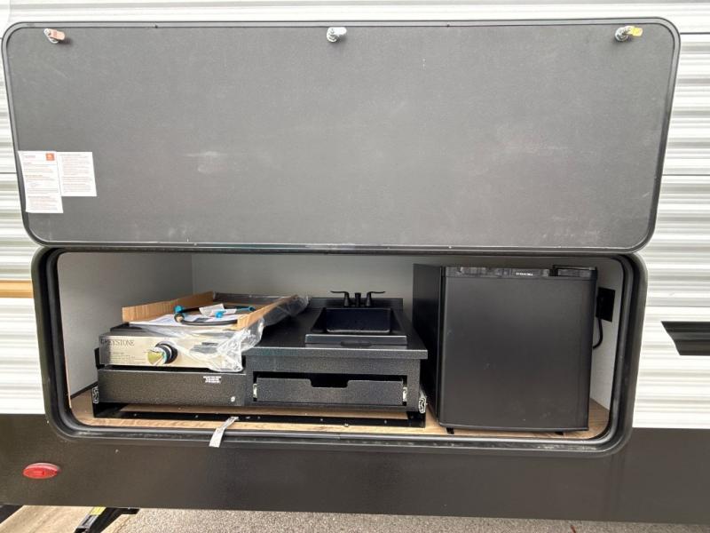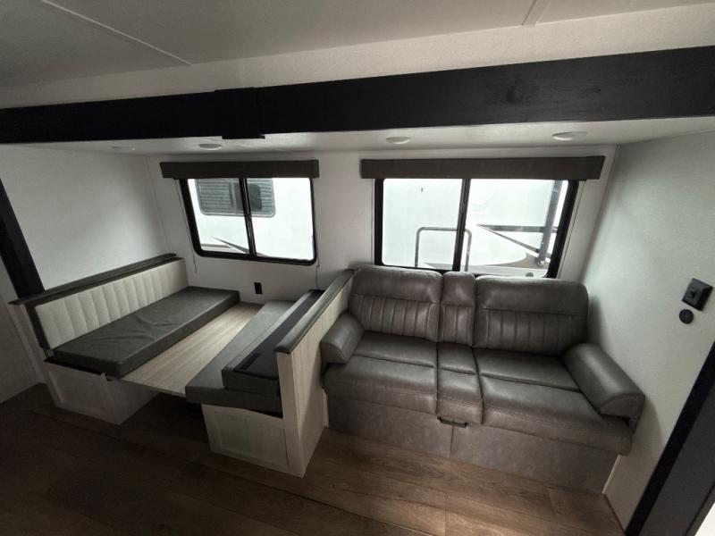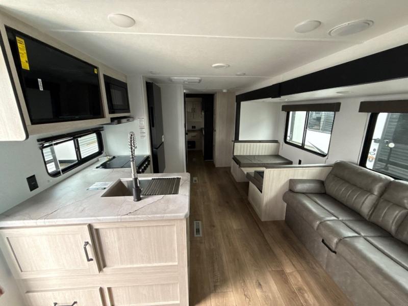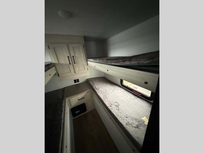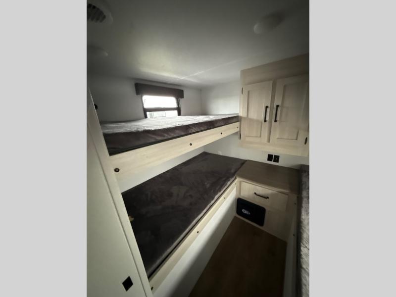 If you're looking for more space, this double axle unit features a large slide so you can walk about freely. Here, you'll find the booth dinette and sofa, which sit across from the optional TV if you want to enjoy movie nights. The full kitchen includes a stainless microwave and three burner cooktop to make meals, plus a pantry and 12V refrigerator for food storage. And an optional outside kitchen with a griddle can be added if you enjoy cooking outdoors! Your guests or littles are sure to enjoy the rear private bunkhouse with four bunk beds and a wardrobe for their things!