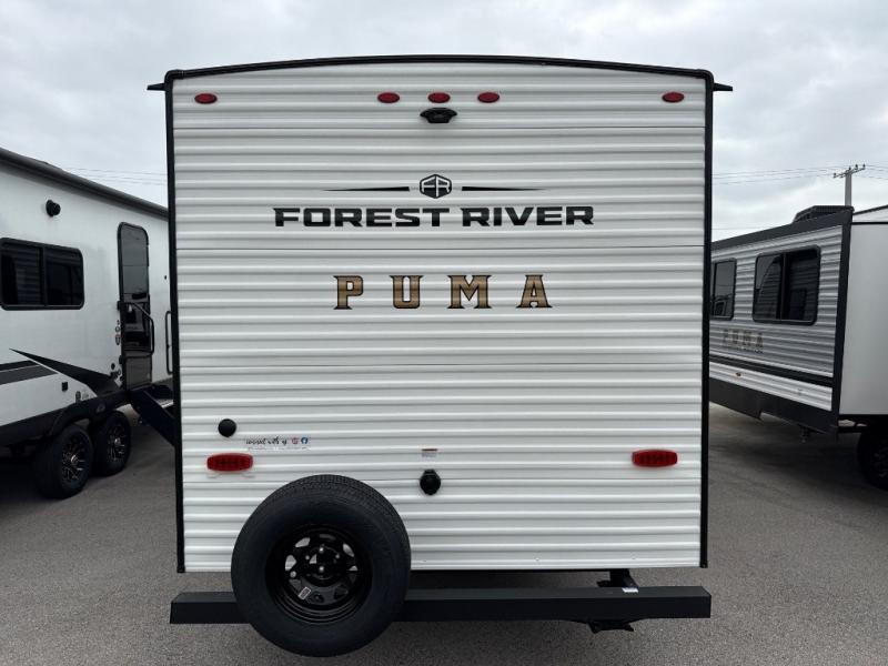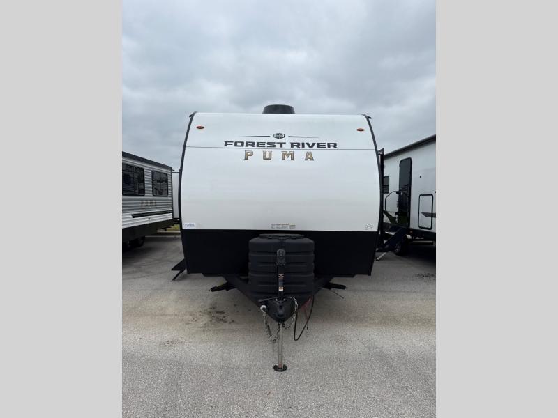 The Puma Camping Edition by Palomino offer an affordable travel trailer for rookie campers or seasoned RVers! They are built with 5/8" tongue and groove plywood flooring and a front diamond plate for added protection. There are also exterior clamp style door latches, back up camera prep, and 20 lb. LP bottles. Head inside to find Thermofoil countertops with a smooth drop edge, bedroom USB ports and outlets, and a GE appliance and kitchen package.