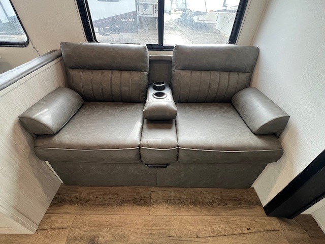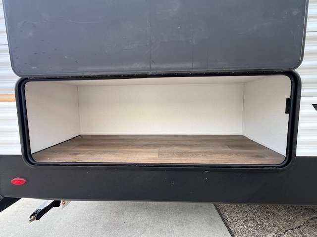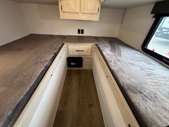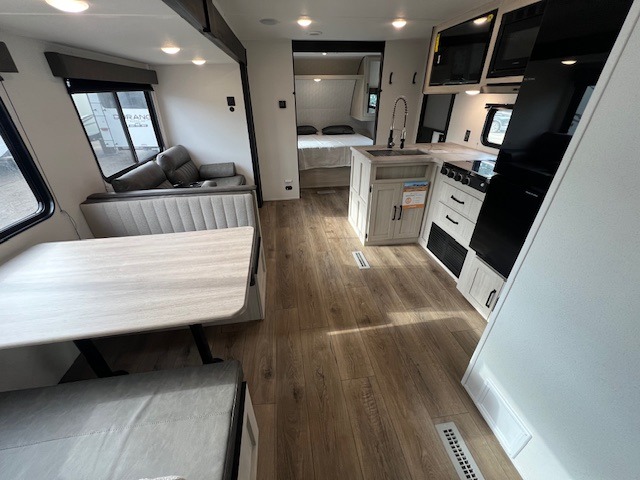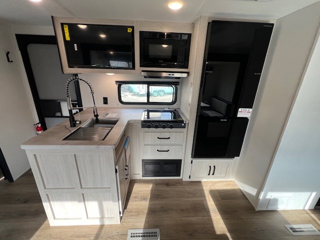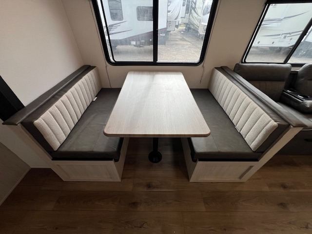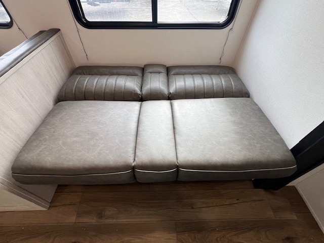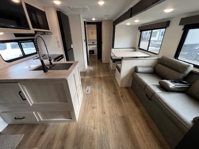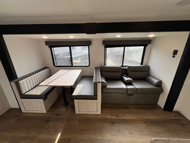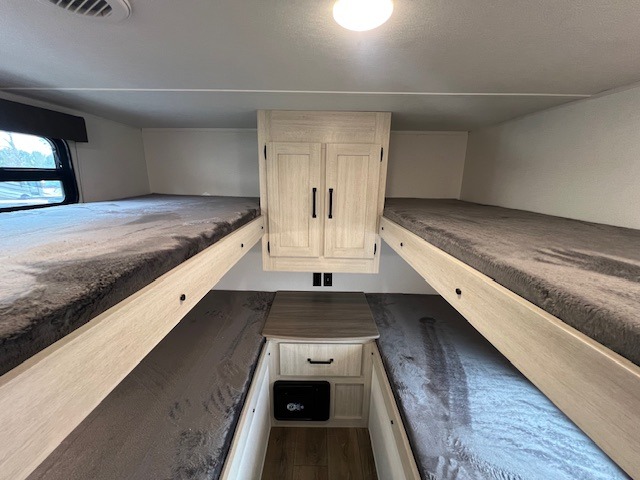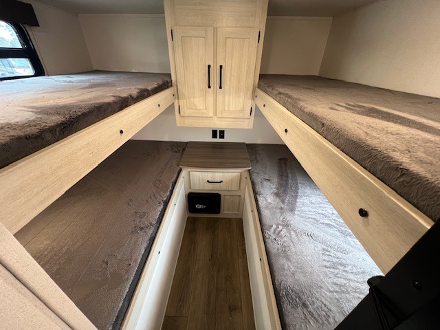 If you're looking for more space, this double axle unit features a large slide so you can walk about freely. Here, you'll find the booth dinette and sofa, which sit across from the optional TV if you want to enjoy movie nights. The full kitchen includes a stainless microwave and three burner cooktop to make meals, plus a pantry and 12V refrigerator for food storage. And an optional outside kitchen with a griddle can be added if you enjoy cooking outdoors! Your guests or littles are sure to enjoy the rear private bunkhouse with four bunk beds and a wardrobe for their things!