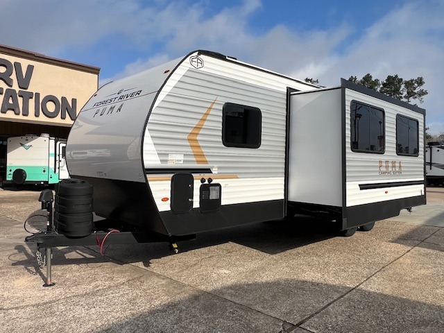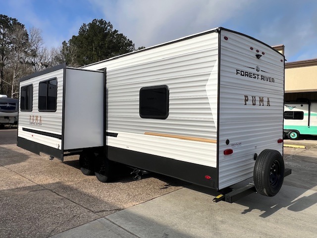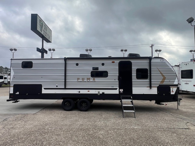 The Puma Camping Edition by Palomino offer an affordable travel trailer for rookie campers or seasoned RVers! They are built with 5/8" tongue and groove plywood flooring and a front diamond plate for added protection. There are also exterior clamp style door latches, back up camera prep, and 20 lb. LP bottles. Head inside to find Thermofoil countertops with a smooth drop edge, bedroom USB ports and outlets, and a GE appliance and kitchen package.