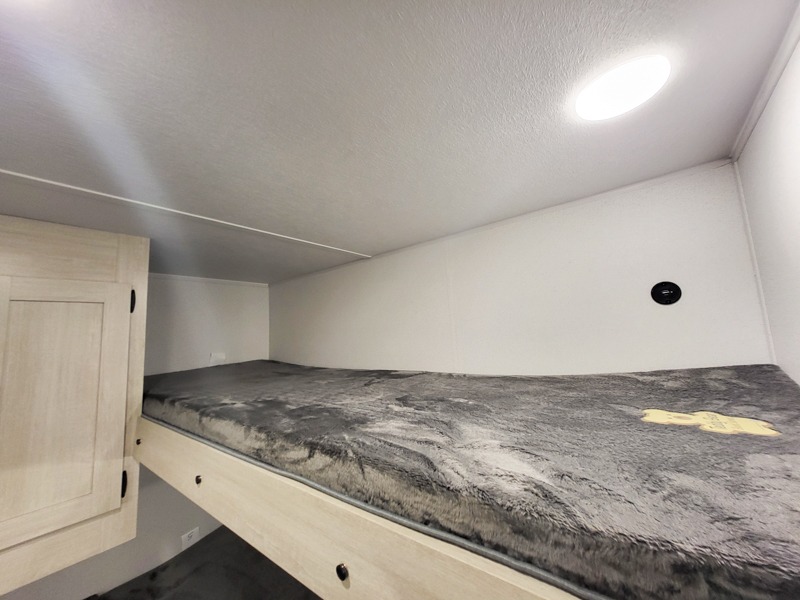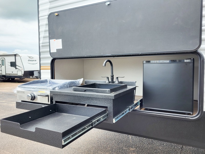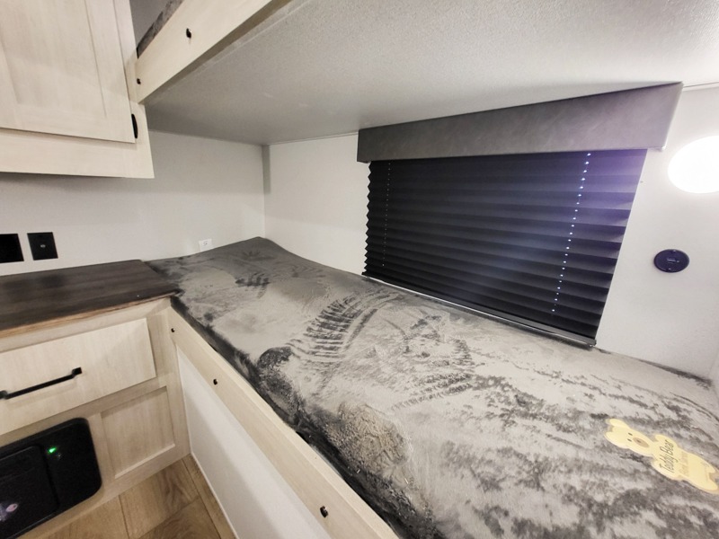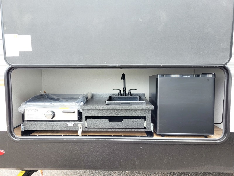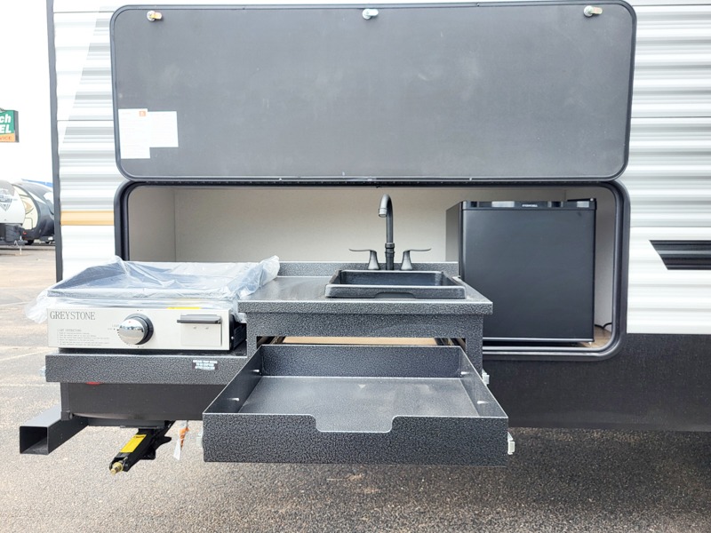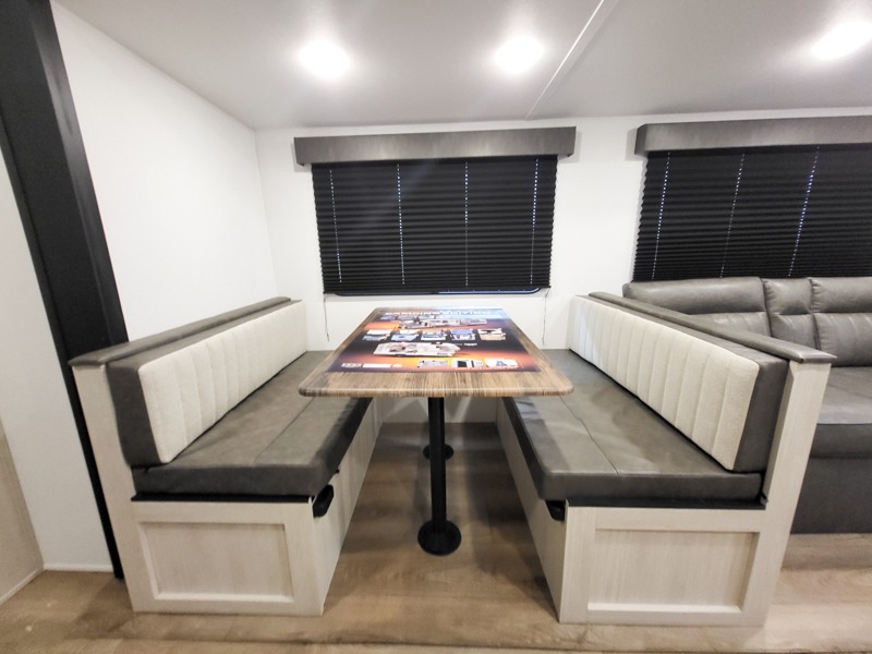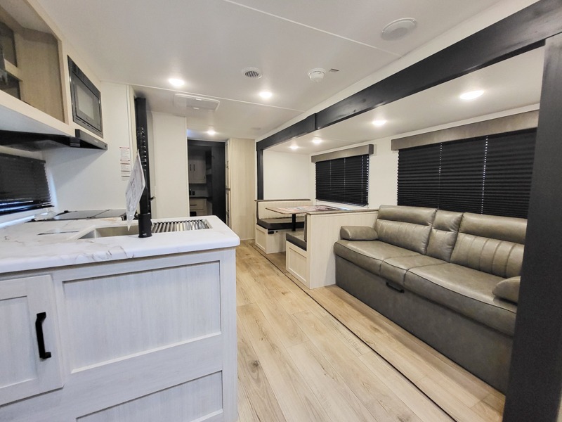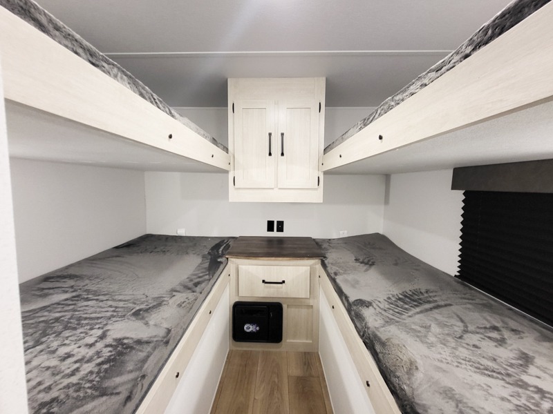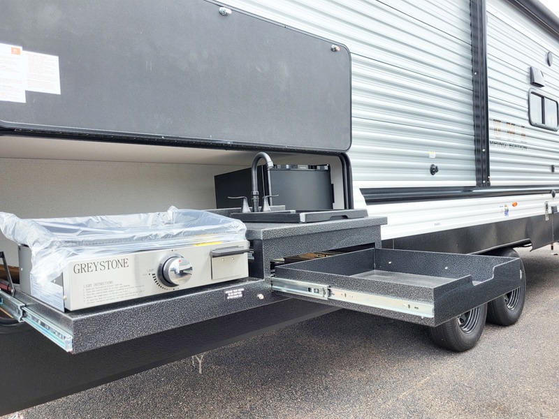 If you're looking for more space, this double axle unit features a large slide so you can walk about freely. Here, you'll find the booth dinette and sofa, which sit across from the optional TV if you want to enjoy movie nights. The full kitchen includes a stainless microwave and three burner cooktop to make meals, plus a pantry and 12V refrigerator for food storage. And an optional outside kitchen with a griddle can be added if you enjoy cooking outdoors! Your guests or littles are sure to enjoy the rear private bunkhouse with four bunk beds and a wardrobe for their things!