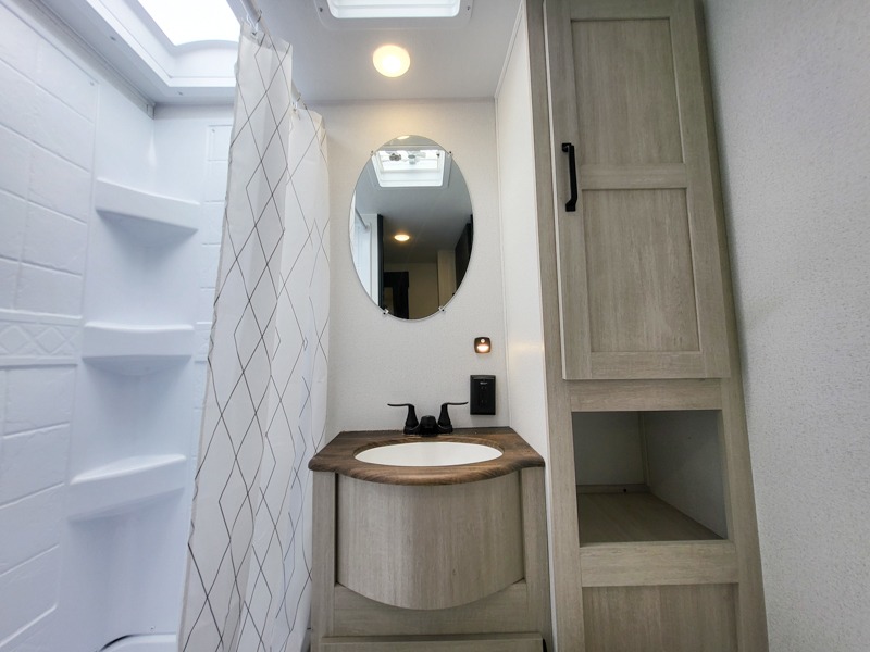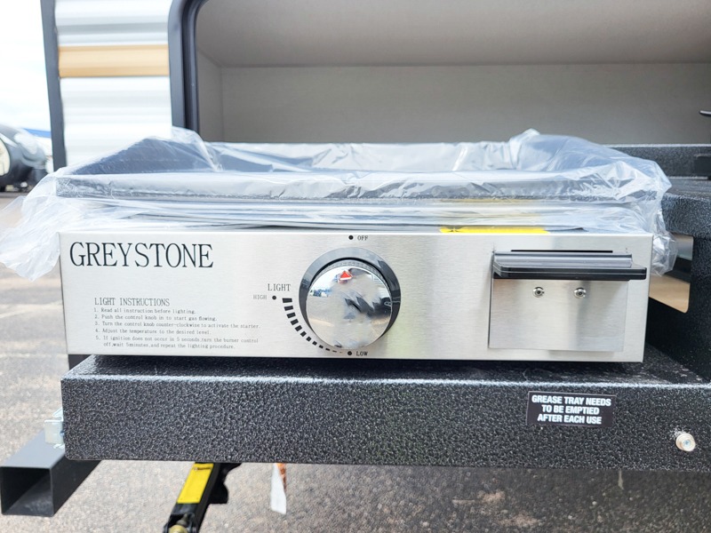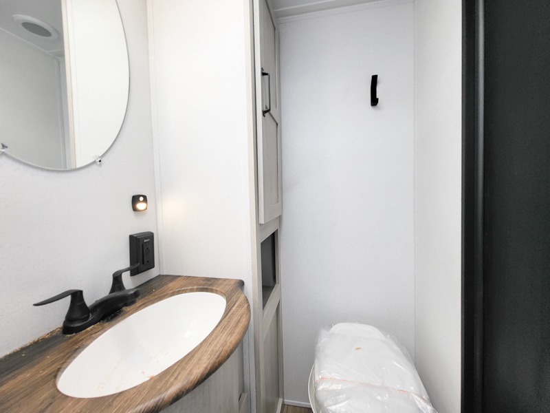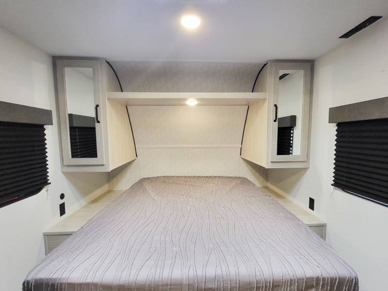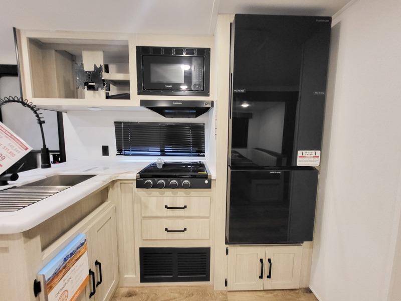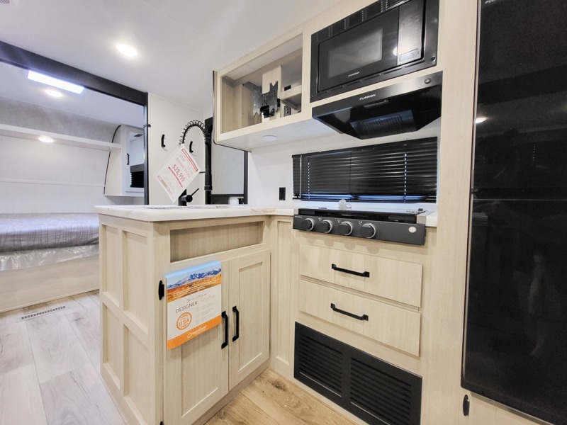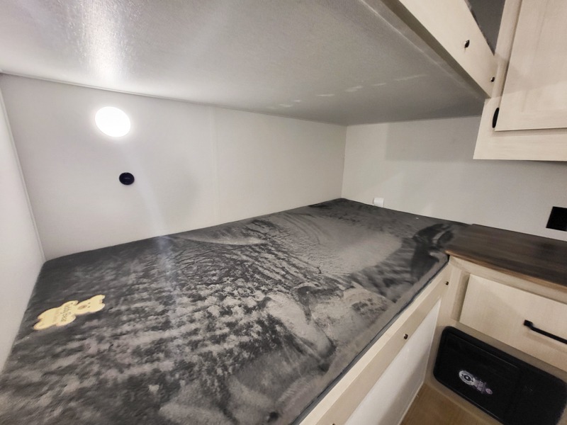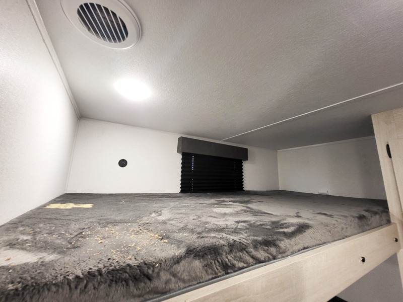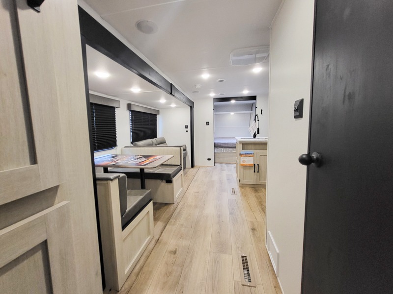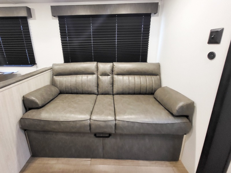 If you're looking for more space, this double axle unit features a large slide so you can walk about freely. Here, you'll find the booth dinette and sofa, which sit across from the optional TV if you want to enjoy movie nights. The full kitchen includes a stainless microwave and three burner cooktop to make meals, plus a pantry and 12V refrigerator for food storage. And an optional outside kitchen with a griddle can be added if you enjoy cooking outdoors! Your guests or littles are sure to enjoy the rear private bunkhouse with four bunk beds and a wardrobe for their things!
