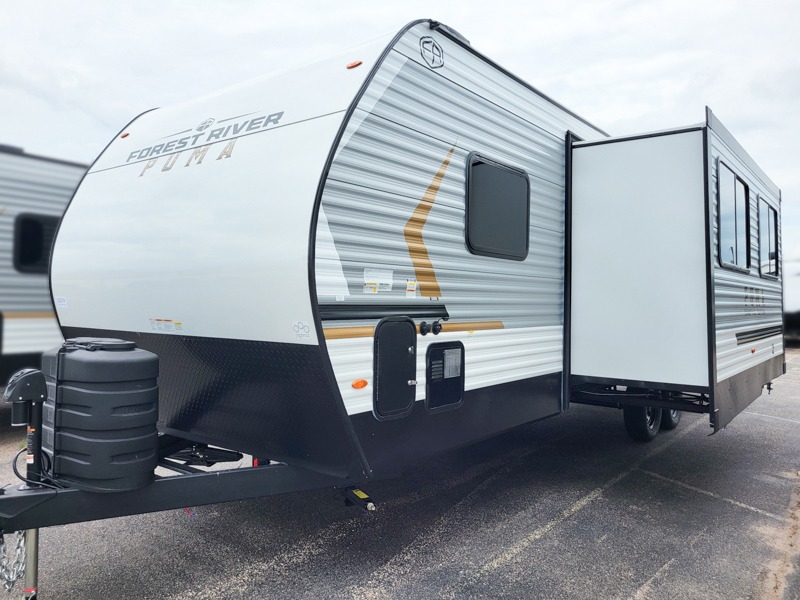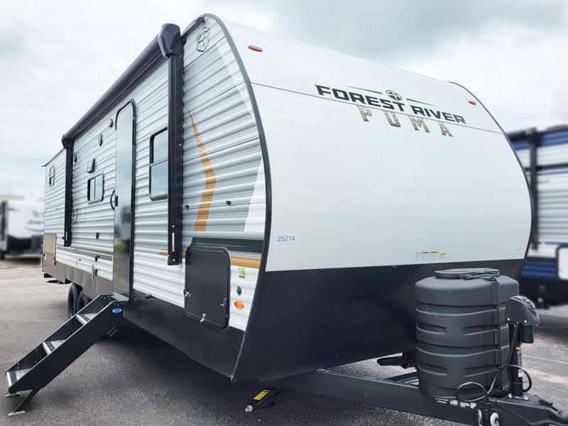 The Puma Camping Edition by Palomino offer an affordable travel trailer for rookie campers or seasoned RVers! They are built with 5/8" tongue and groove plywood flooring and a front diamond plate for added protection. There are also exterior clamp style door latches, back up camera prep, and 20 lb. LP bottles. Head inside to find Thermofoil countertops with a smooth drop edge, bedroom USB ports and outlets, and a GE appliance and kitchen package.