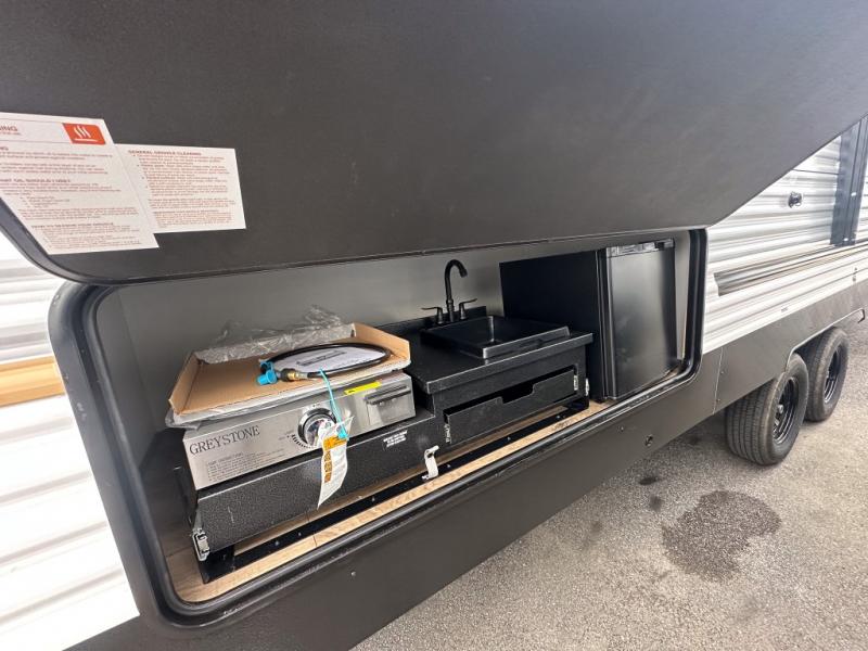 If you're looking for more space, this double axle, double slide out unit is perfect for your group of eight. Within the large slide in the living room, you'll find the booth dinette and sofa, which sit across from the optional TV if you want to enjoy movie nights. The full kitchen includes a stainless microwave and three burner cooktop to make meals, plus a pantry and 12V refrigerator for food storage. And an optional outside kitchen with a griddle can be added if you enjoy cooking outdoors! Your guests or littles are sure to enjoy the rear private bunkhouse that features a set of 38" x 76" bunks across from the third bunk and jiffy sofa within a slide out!