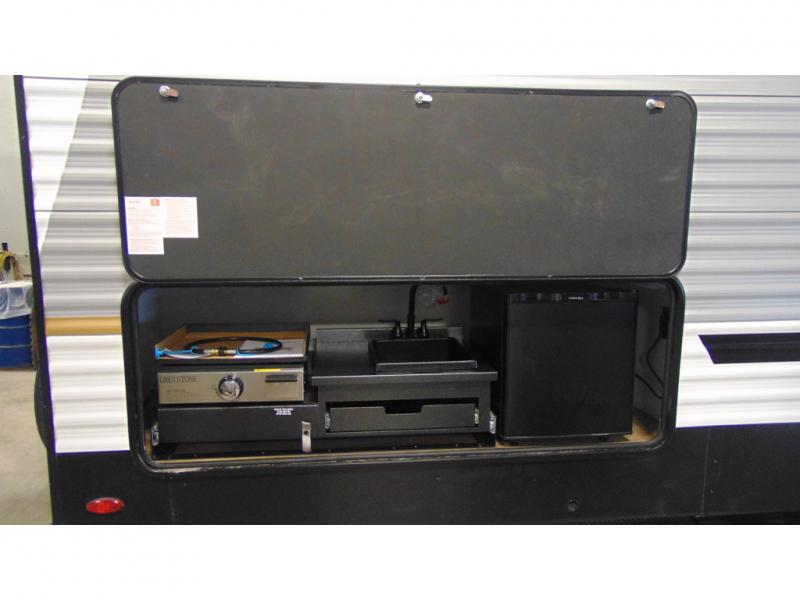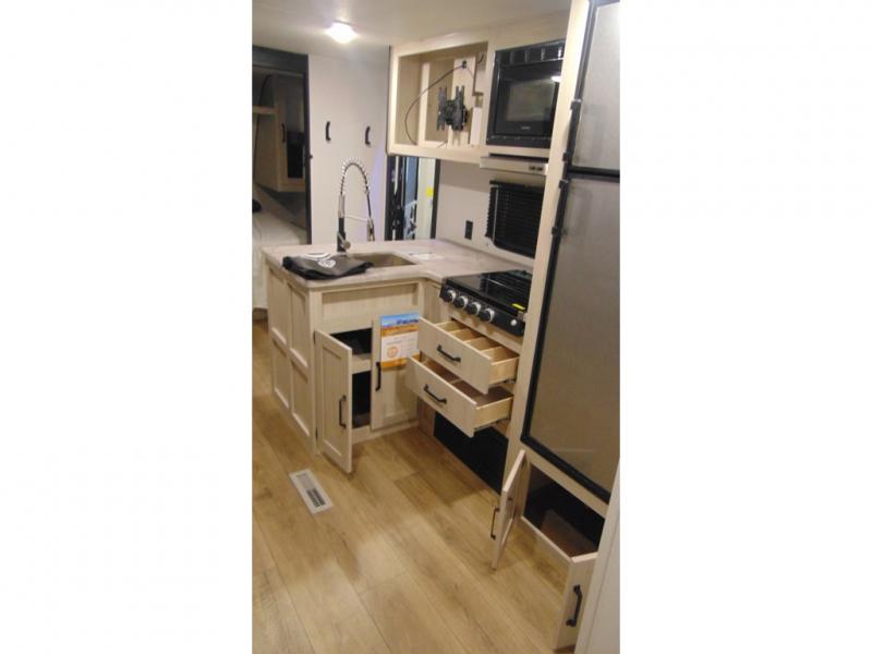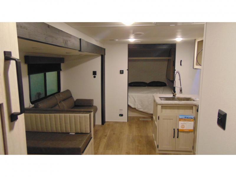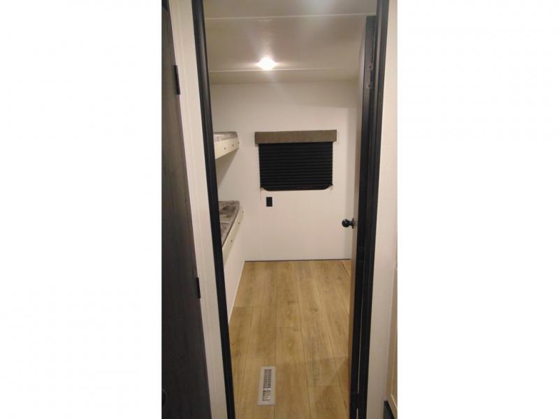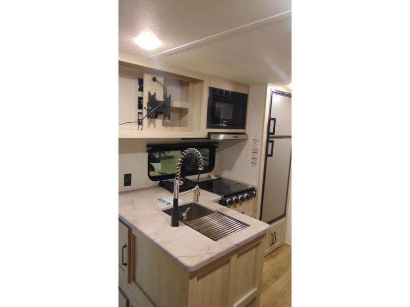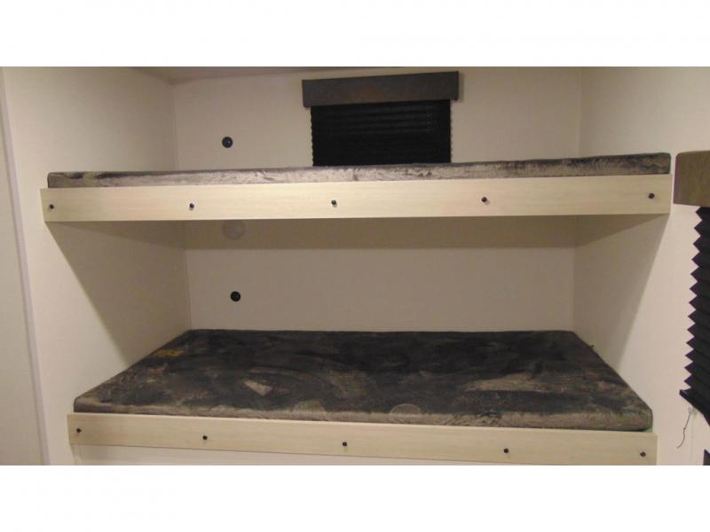 If you're looking for more space, this double axle, double slide out unit is perfect for your group of eight. Within the large slide in the living room, you'll find the booth dinette and sofa, which sit across from the optional TV if you want to enjoy movie nights. The full kitchen includes a stainless microwave and three burner cooktop to make meals, plus a pantry and 12V refrigerator for food storage. And an optional outside kitchen with a griddle can be added if you enjoy cooking outdoors! Your guests or littles are sure to enjoy the rear private bunkhouse that features a set of 38" x 76" bunks across from the third bunk and jiffy sofa within a slide out!