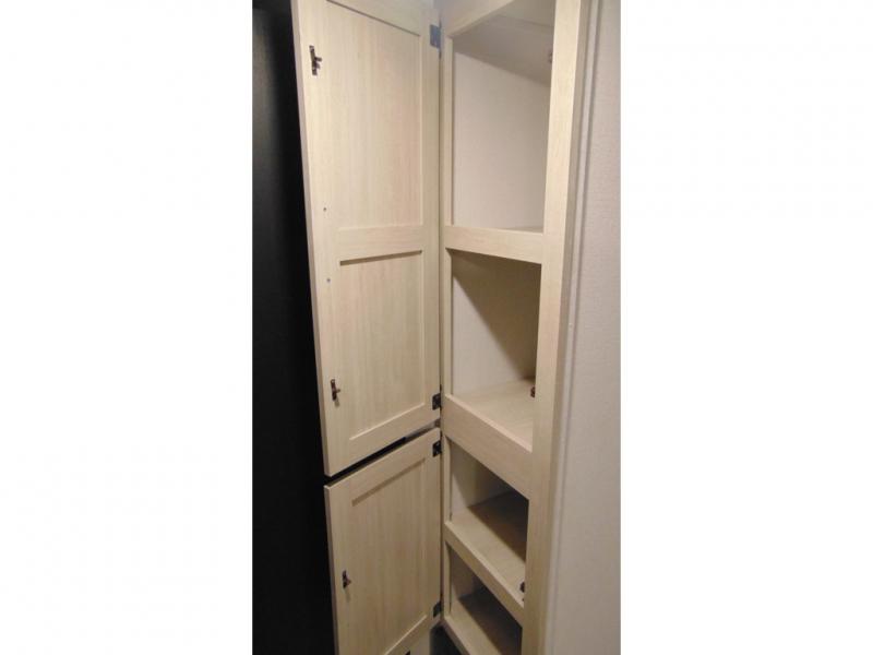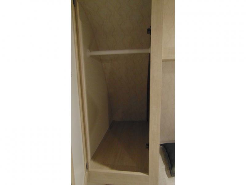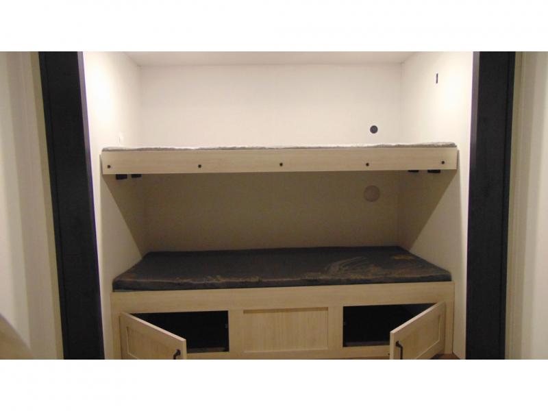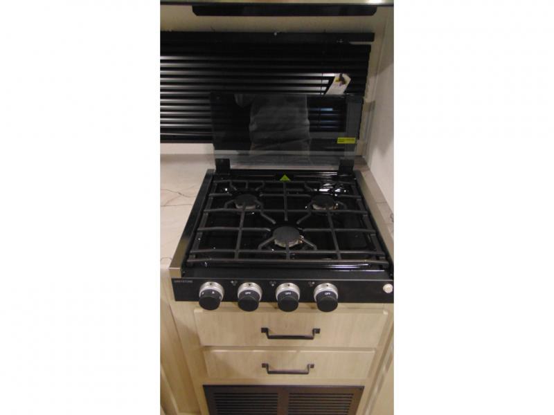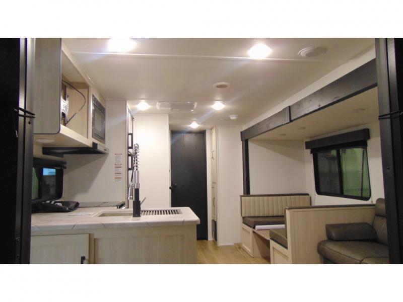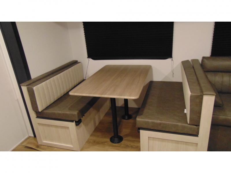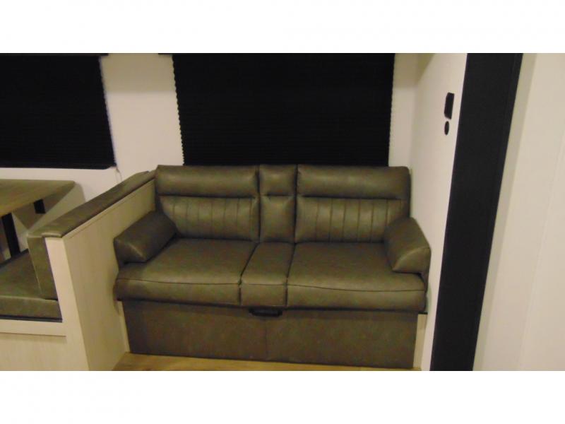 If you're looking for more space, this double axle, double slide out unit is perfect for your group of eight. Within the large slide in the living room, you'll find the booth dinette and sofa, which sit across from the optional TV if you want to enjoy movie nights. The full kitchen includes a stainless microwave and three burner cooktop to make meals, plus a pantry and 12V refrigerator for food storage. And an optional outside kitchen with a griddle can be added if you enjoy cooking outdoors! Your guests or littles are sure to enjoy the rear private bunkhouse that features a set of 38" x 76" bunks across from the third bunk and jiffy sofa within a slide out!