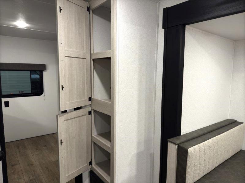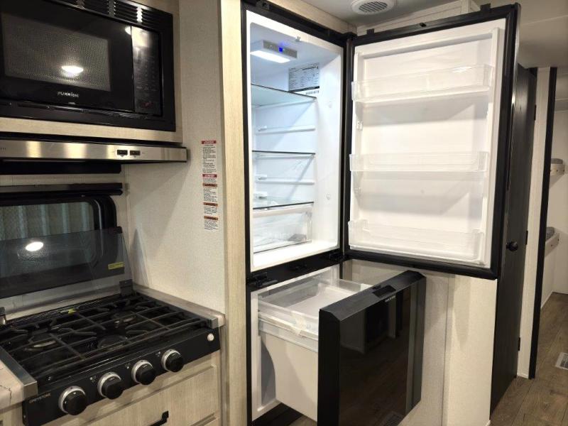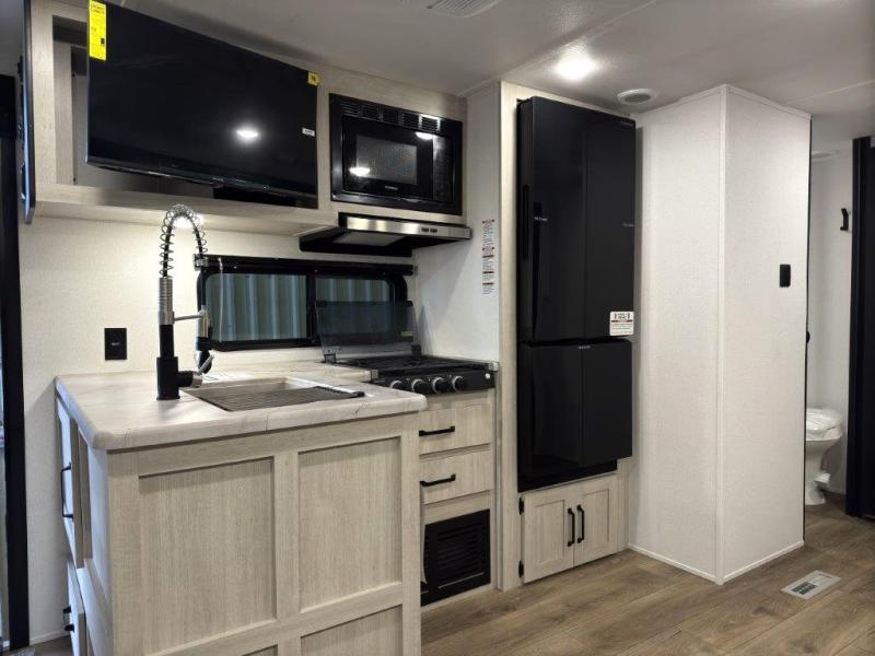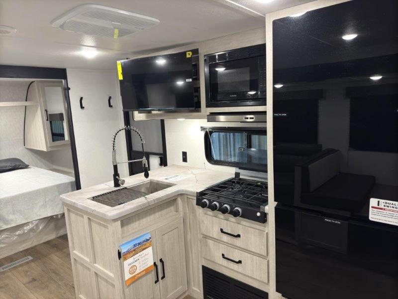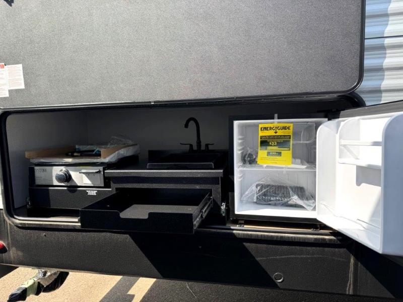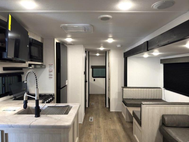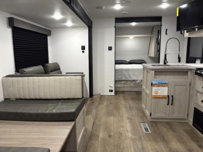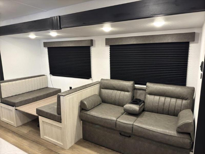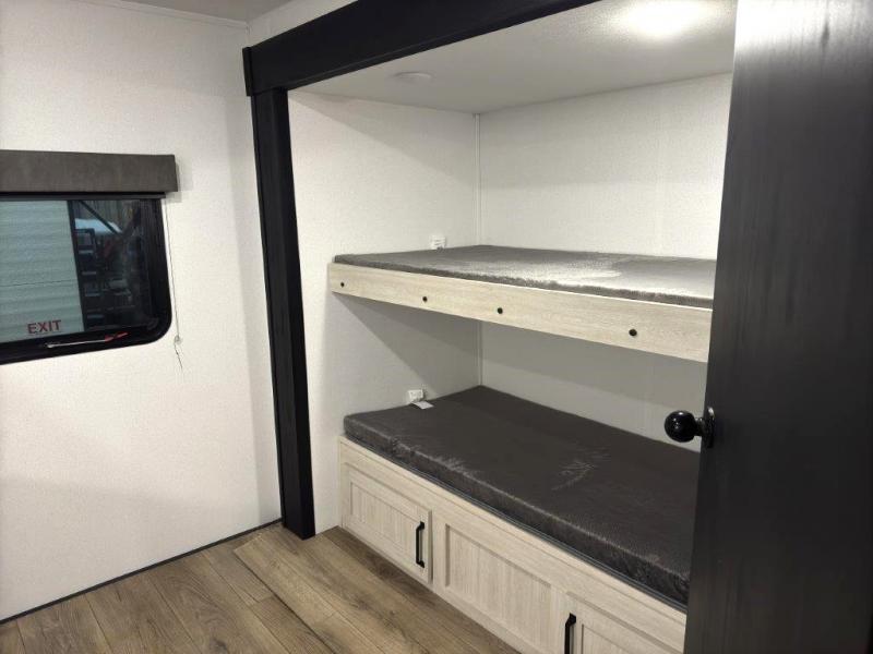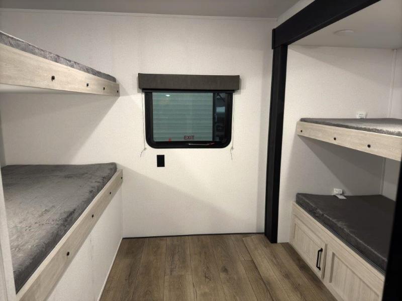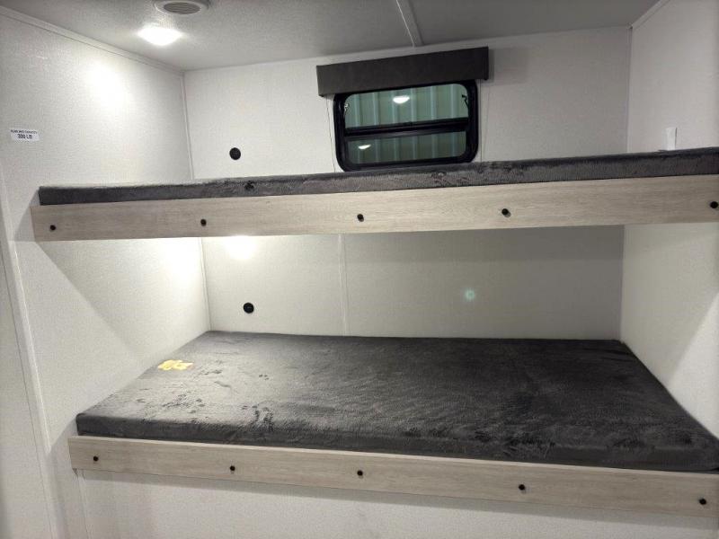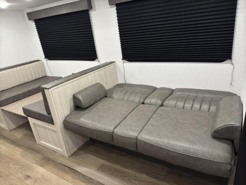 If you're looking for more space, this double axle, double slide out unit is perfect for your group of eight. Within the large slide in the living room, you'll find the booth dinette and sofa, which sit across from the optional TV if you want to enjoy movie nights. The full kitchen includes a stainless microwave and three burner cooktop to make meals, plus a pantry and 12V refrigerator for food storage. And an optional outside kitchen with a griddle can be added if you enjoy cooking outdoors! Your guests or littles are sure to enjoy the rear private bunkhouse that features a set of 38" x 76" bunks across from the third bunk and jiffy sofa within a slide out!