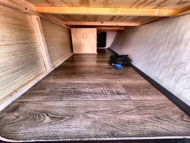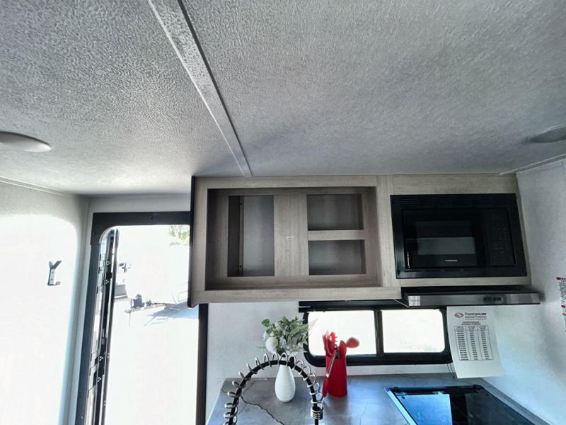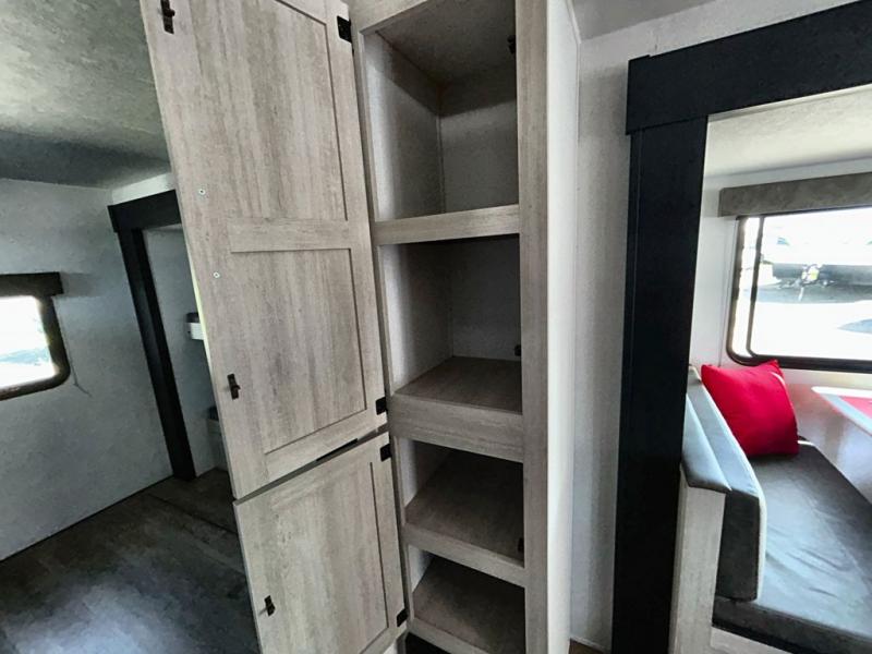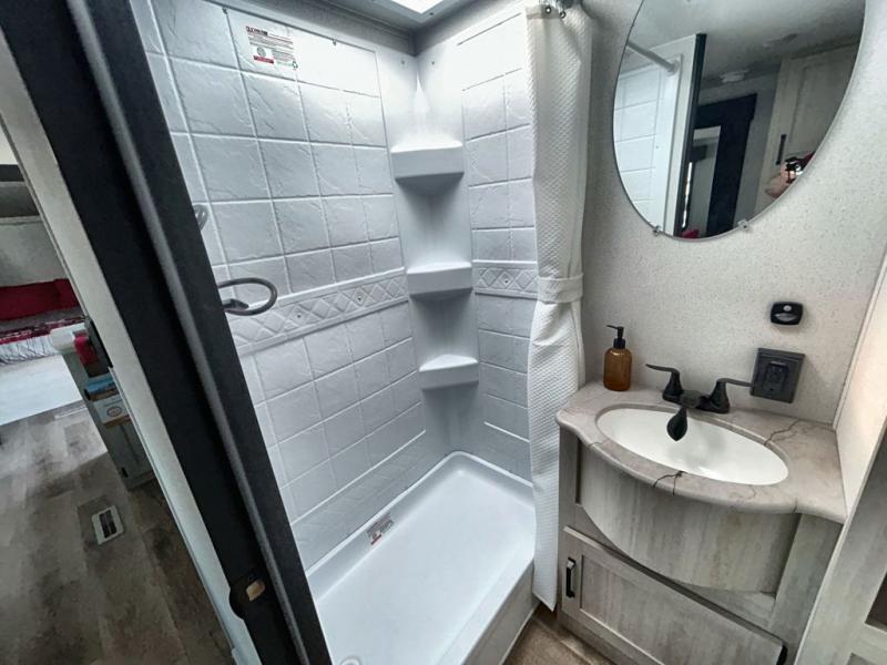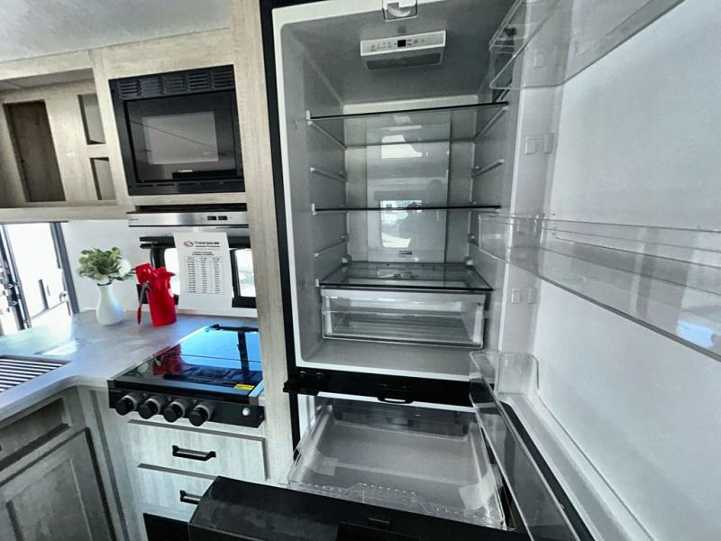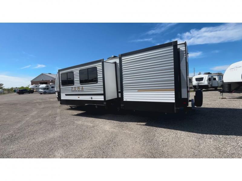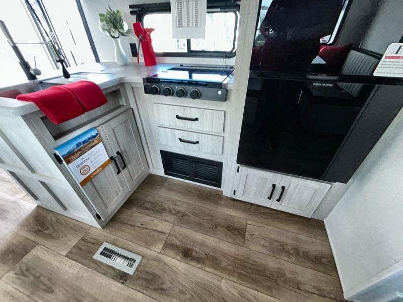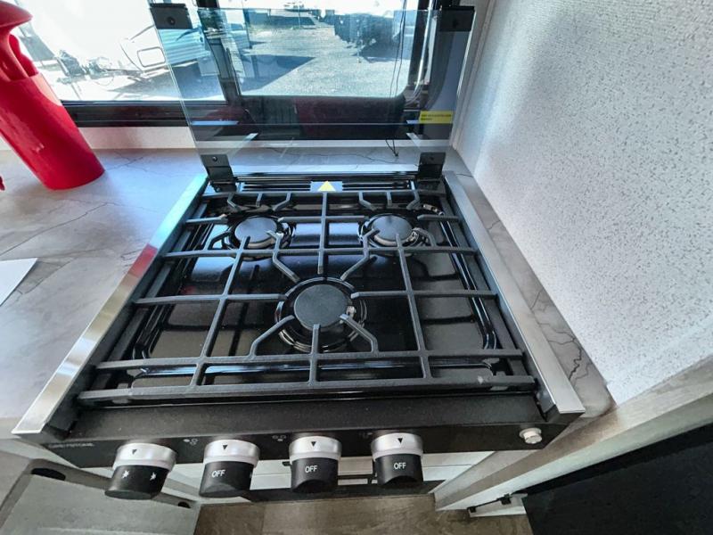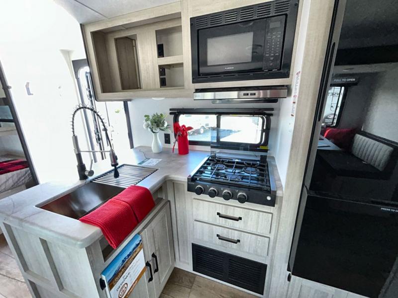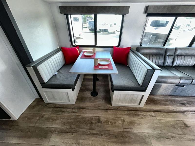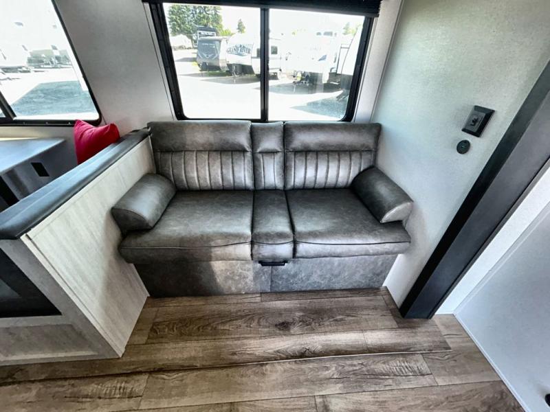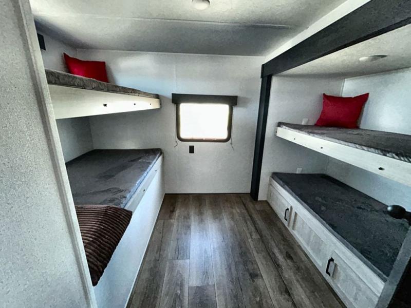 If you're looking for more space, this double axle, double slide out unit is perfect for your group of eight. Within the large slide in the living room, you'll find the booth dinette and sofa, which sit across from the optional TV if you want to enjoy movie nights. The full kitchen includes a stainless microwave and three burner cooktop to make meals, plus a pantry and 12V refrigerator for food storage. And an optional outside kitchen with a griddle can be added if you enjoy cooking outdoors! Your guests or littles are sure to enjoy the rear private bunkhouse that features a set of 38" x 76" bunks across from the third bunk and jiffy sofa within a slide out!