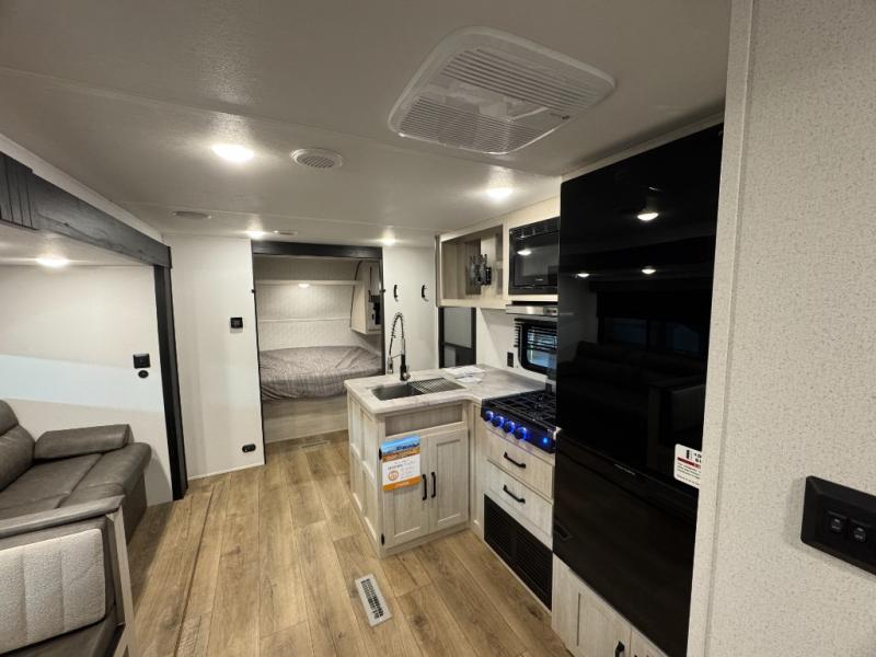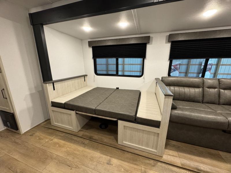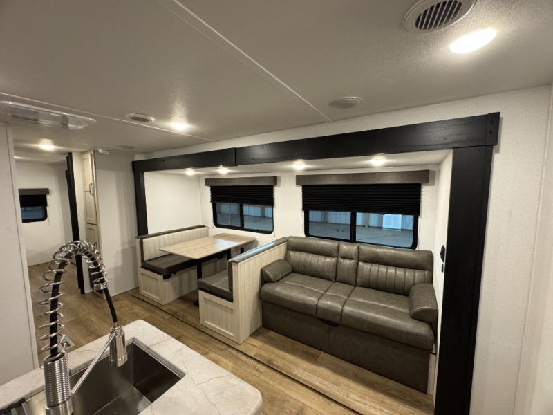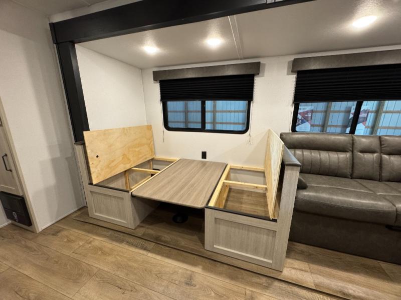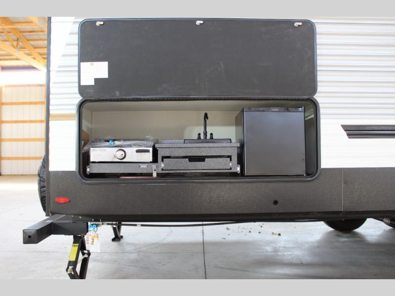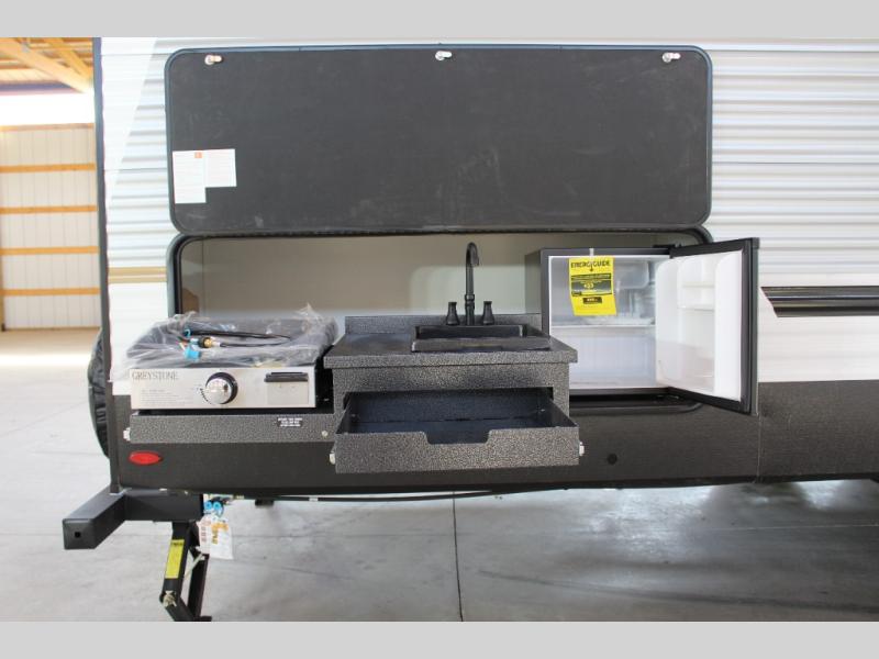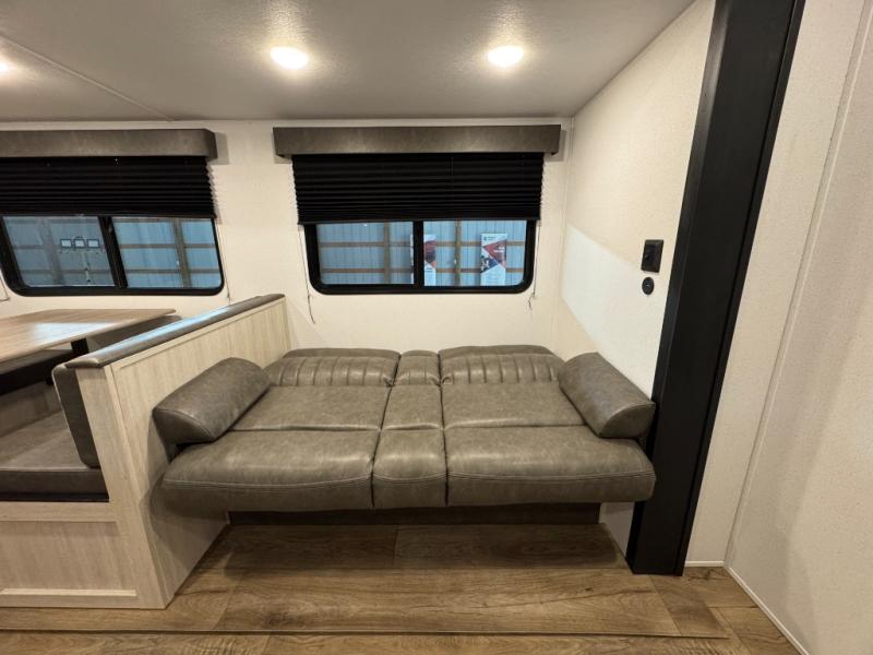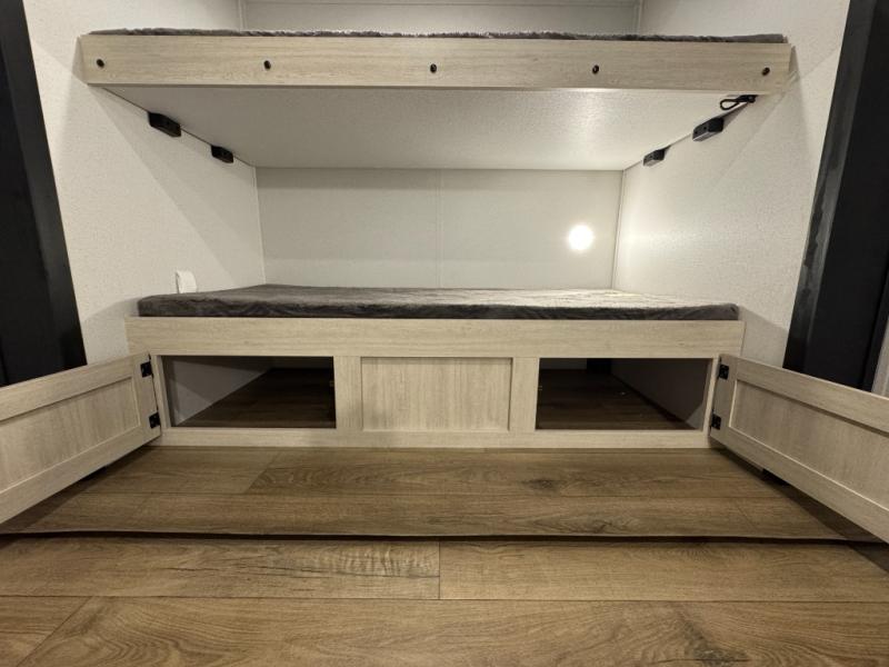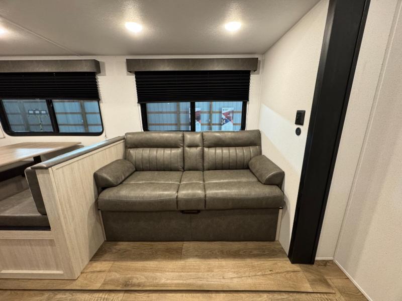 If you're looking for more space, this double axle, double slide out unit is perfect for your group of eight. Within the large slide in the living room, you'll find the booth dinette and sofa, which sit across from the optional TV if you want to enjoy movie nights. The full kitchen includes a stainless microwave and three burner cooktop to make meals, plus a pantry and 12V refrigerator for food storage. And an optional outside kitchen with a griddle can be added if you enjoy cooking outdoors! Your guests or littles are sure to enjoy the rear private bunkhouse that features a set of 38" x 76" bunks across from the third bunk and jiffy sofa within a slide out!