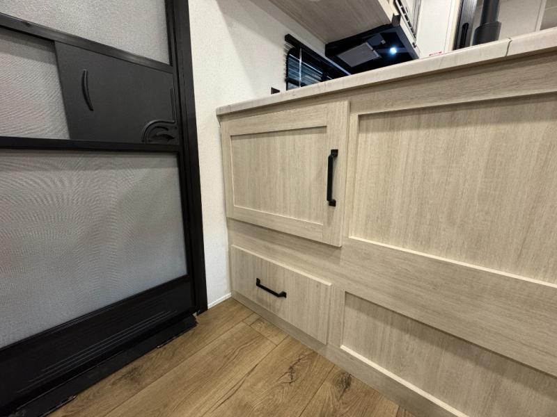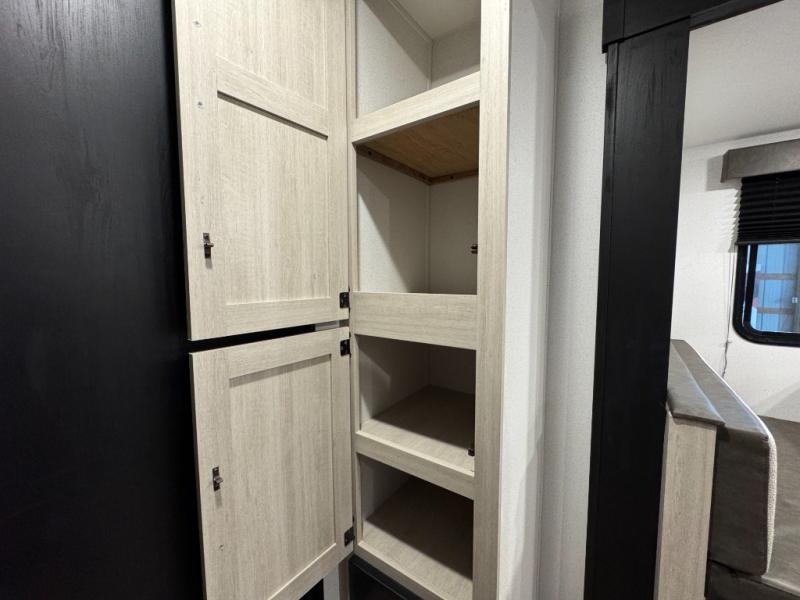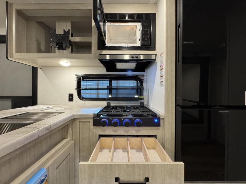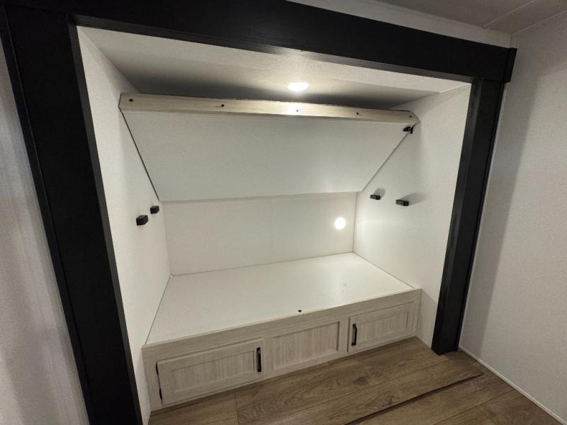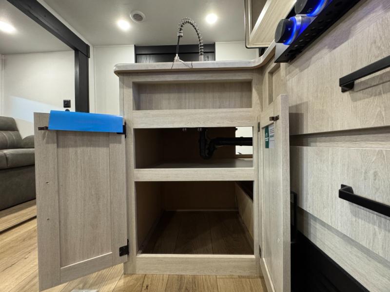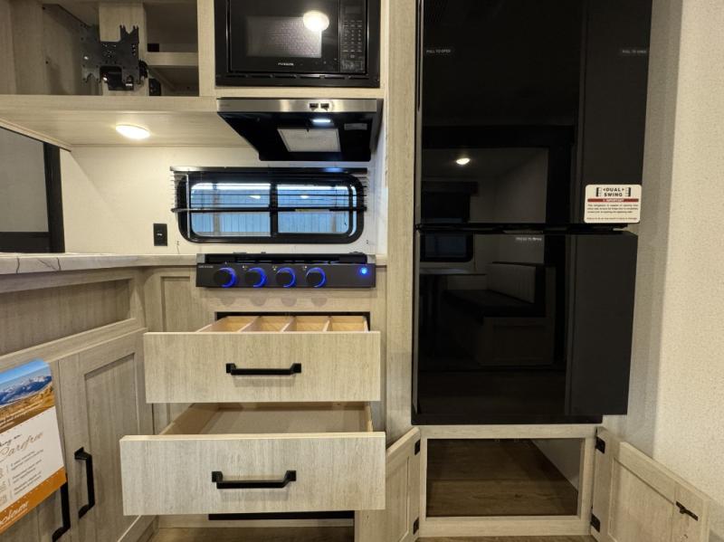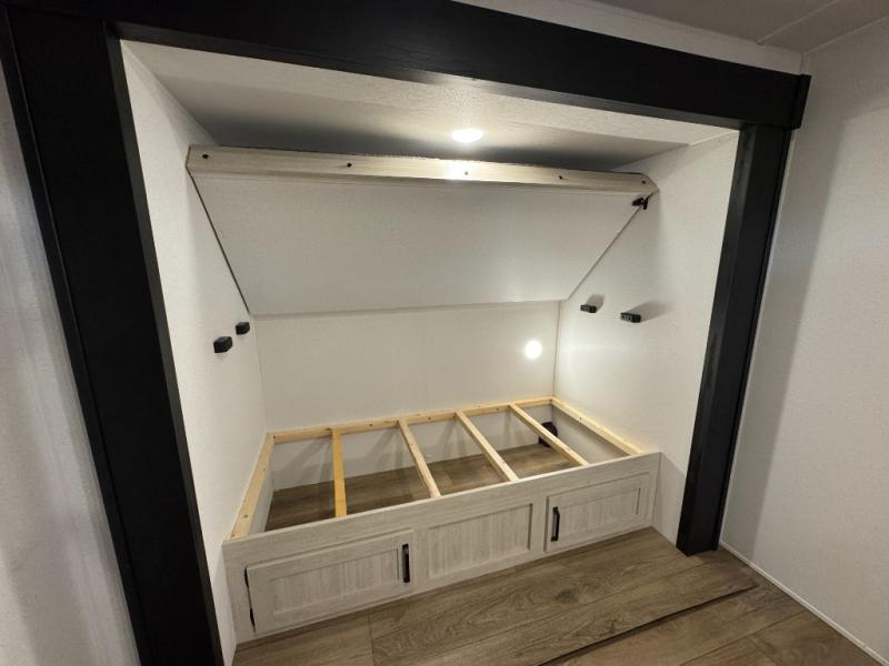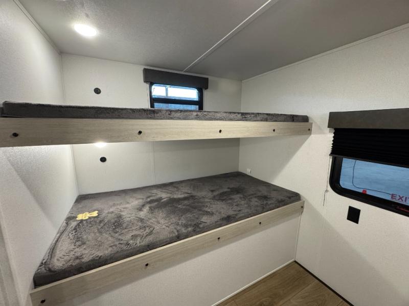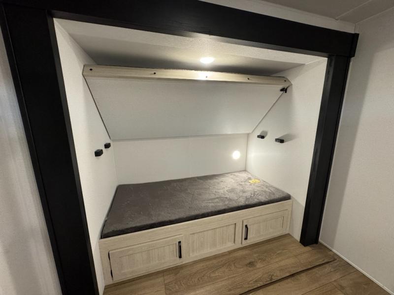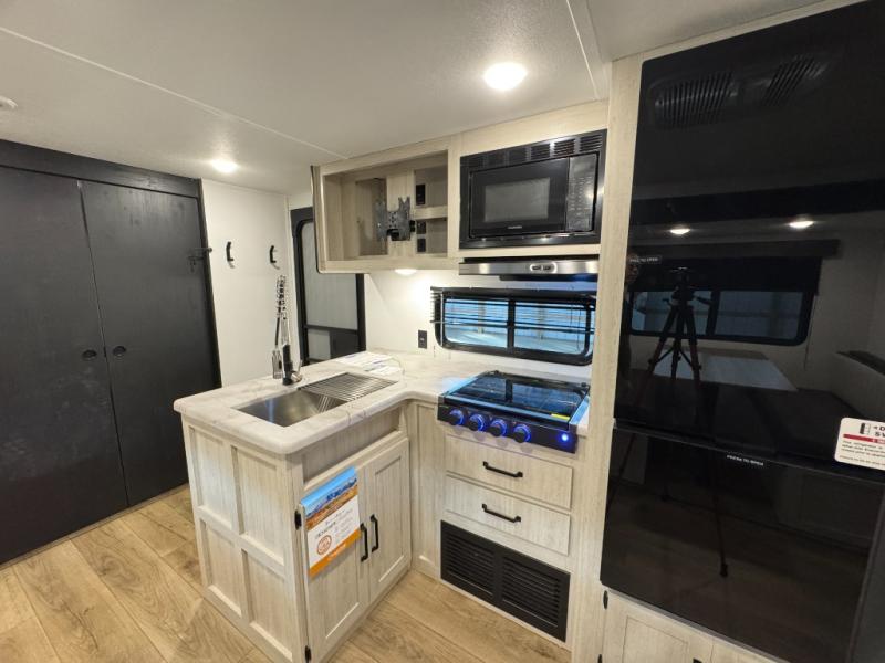 If you're looking for more space, this double axle, double slide out unit is perfect for your group of eight. Within the large slide in the living room, you'll find the booth dinette and sofa, which sit across from the optional TV if you want to enjoy movie nights. The full kitchen includes a stainless microwave and three burner cooktop to make meals, plus a pantry and 12V refrigerator for food storage. And an optional outside kitchen with a griddle can be added if you enjoy cooking outdoors! Your guests or littles are sure to enjoy the rear private bunkhouse that features a set of 38" x 76" bunks across from the third bunk and jiffy sofa within a slide out!