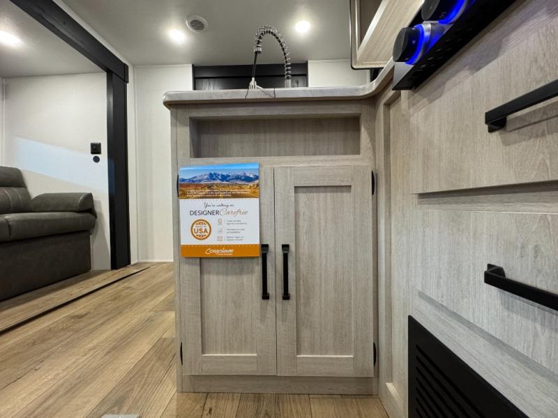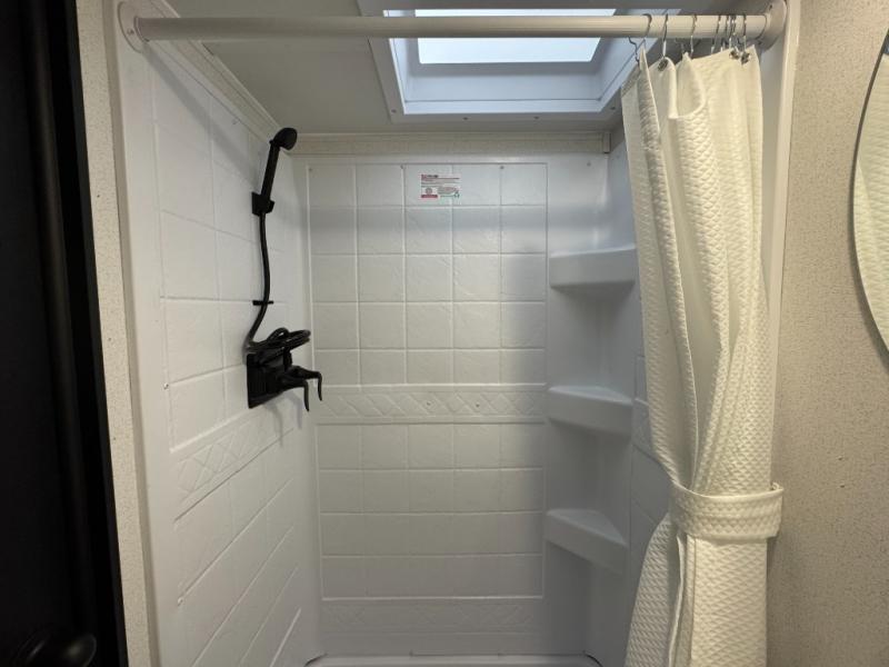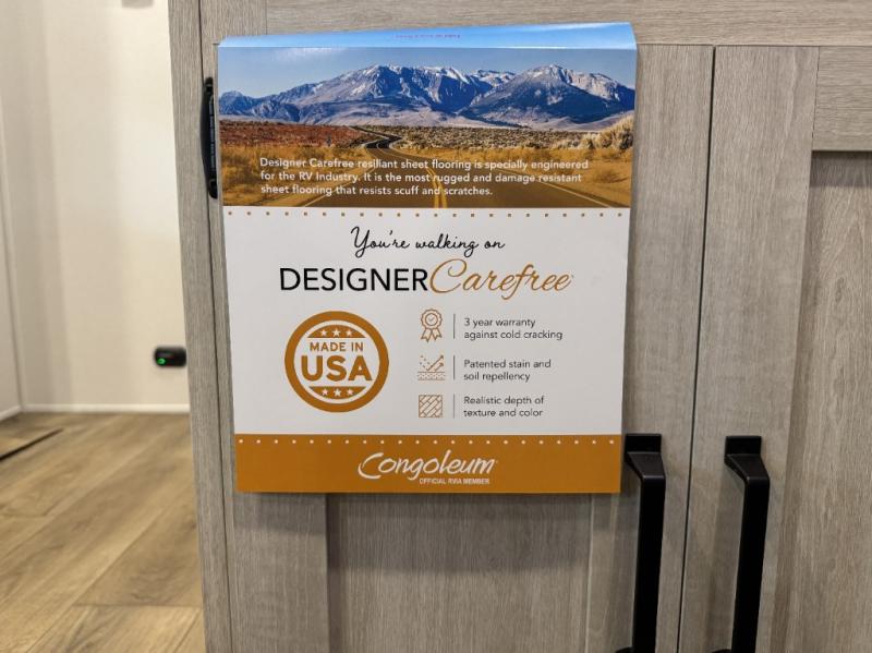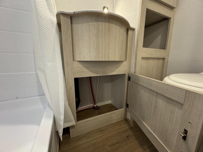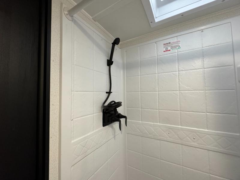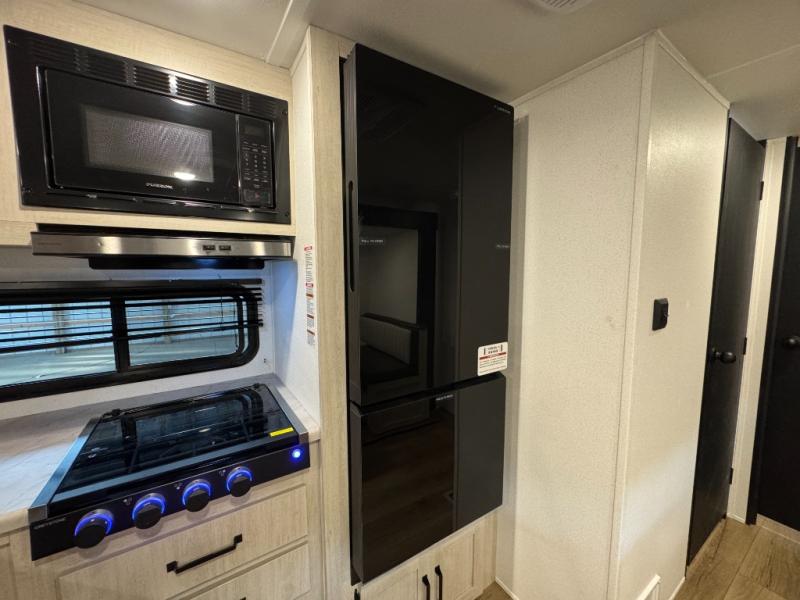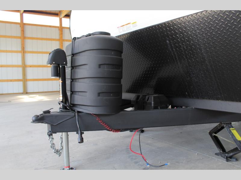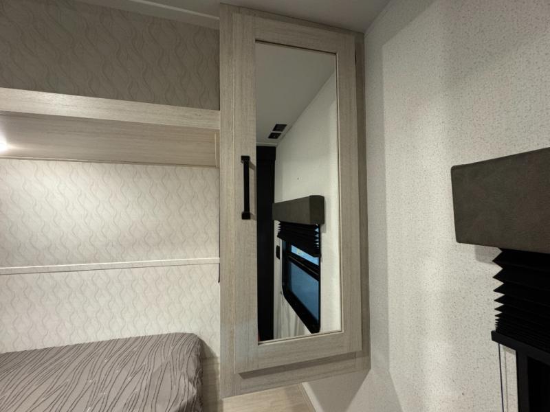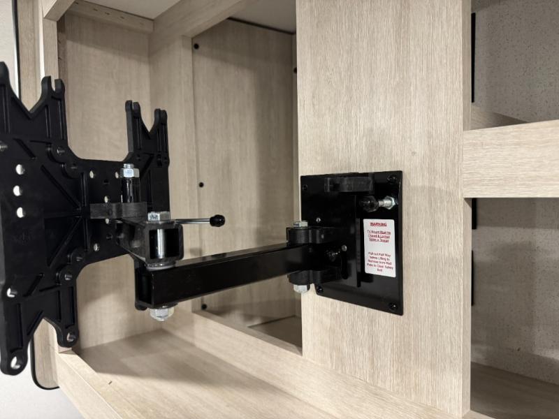 If you're looking for more space, this double axle, double slide out unit is perfect for your group of eight. Within the large slide in the living room, you'll find the booth dinette and sofa, which sit across from the optional TV if you want to enjoy movie nights. The full kitchen includes a stainless microwave and three burner cooktop to make meals, plus a pantry and 12V refrigerator for food storage. And an optional outside kitchen with a griddle can be added if you enjoy cooking outdoors! Your guests or littles are sure to enjoy the rear private bunkhouse that features a set of 38" x 76" bunks across from the third bunk and jiffy sofa within a slide out!