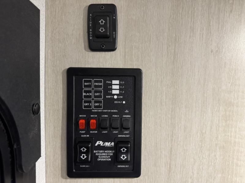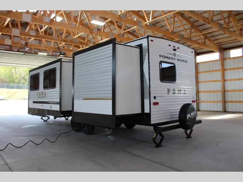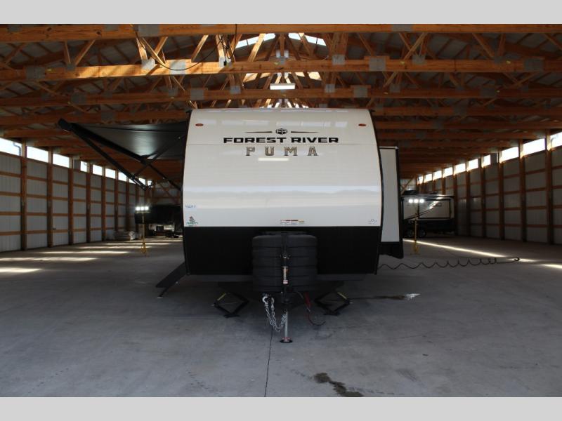 The Puma Camping Edition by Palomino offer an affordable travel trailer for rookie campers or seasoned RVers! They are built with 5/8" tongue and groove plywood flooring and a front diamond plate for added protection. There are also exterior clamp style door latches, back up camera prep, and 20 lb. LP bottles. Head inside to find Thermofoil countertops with a smooth drop edge, bedroom USB ports and outlets, and a GE appliance and kitchen package.