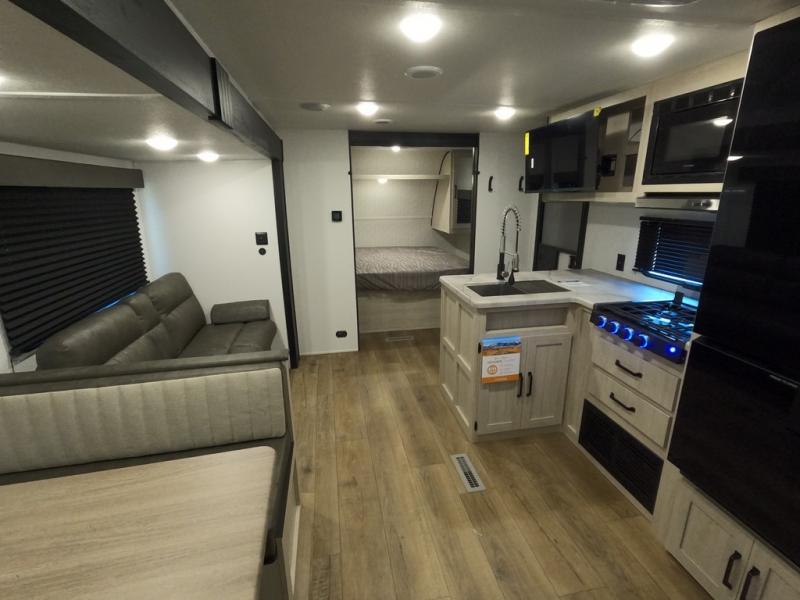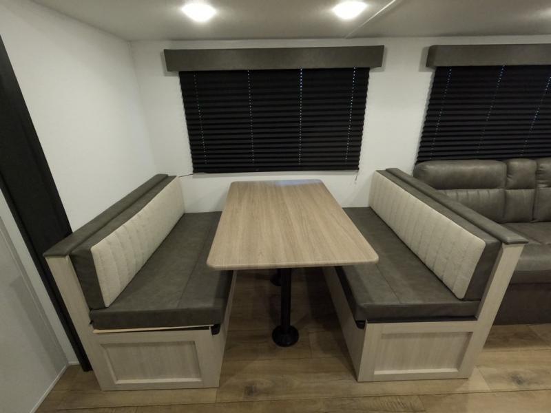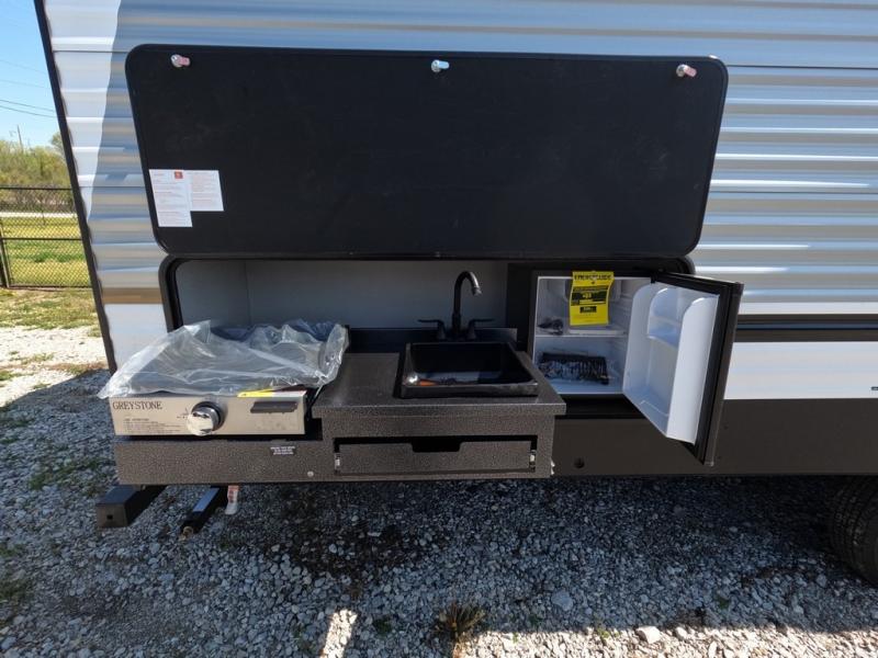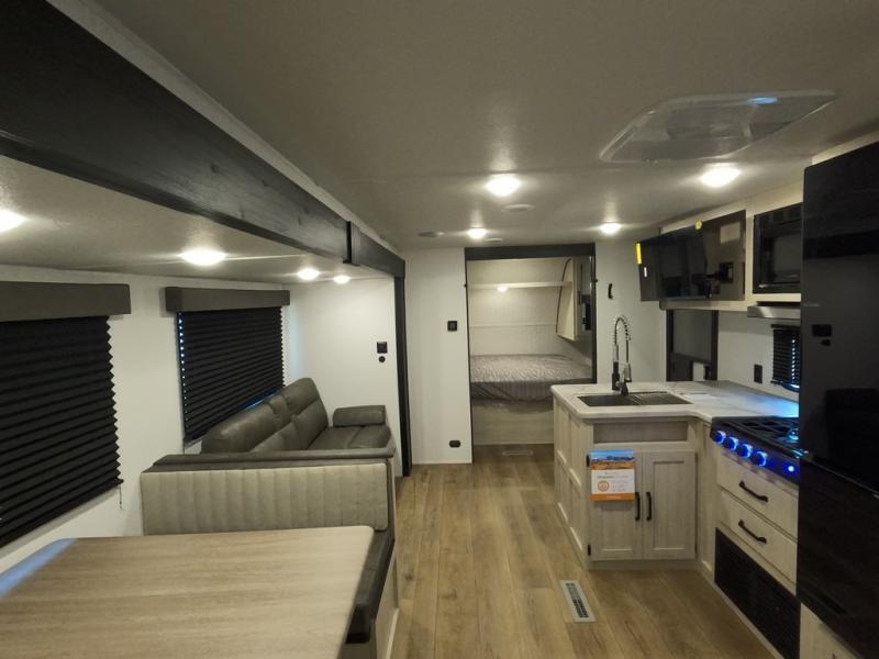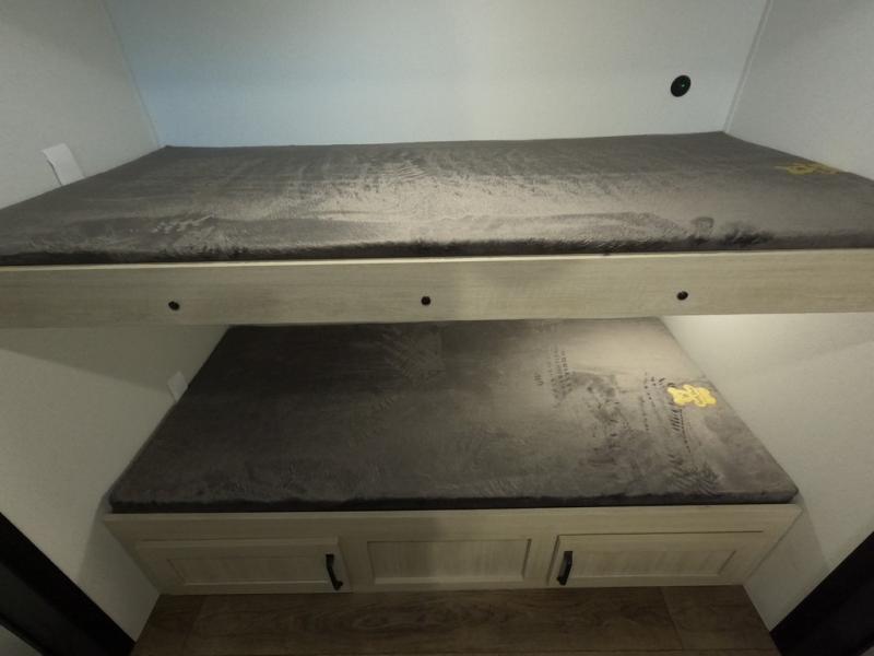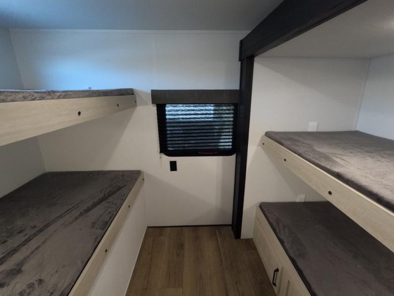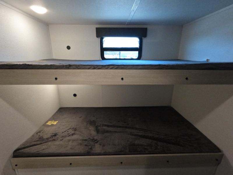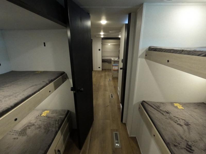If you're looking for more space, this double axle, double slide out unit is perfect for your group of eight. Within the large slide in the living room, you'll find the booth dinette and sofa, which sit across from the optional TV if you want to enjoy movie nights. The full kitchen includes a stainless microwave and three burner cooktop to make meals, plus a pantry and 12V refrigerator for food storage. And an optional outside kitchen with a griddle can be added if you enjoy cooking outdoors! Your guests or littles are sure to enjoy the rear private bunkhouse that features a set of 38" x 76" bunks across from the third bunk and jiffy sofa within a slide out!