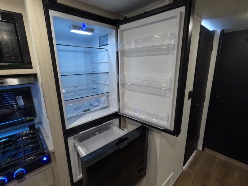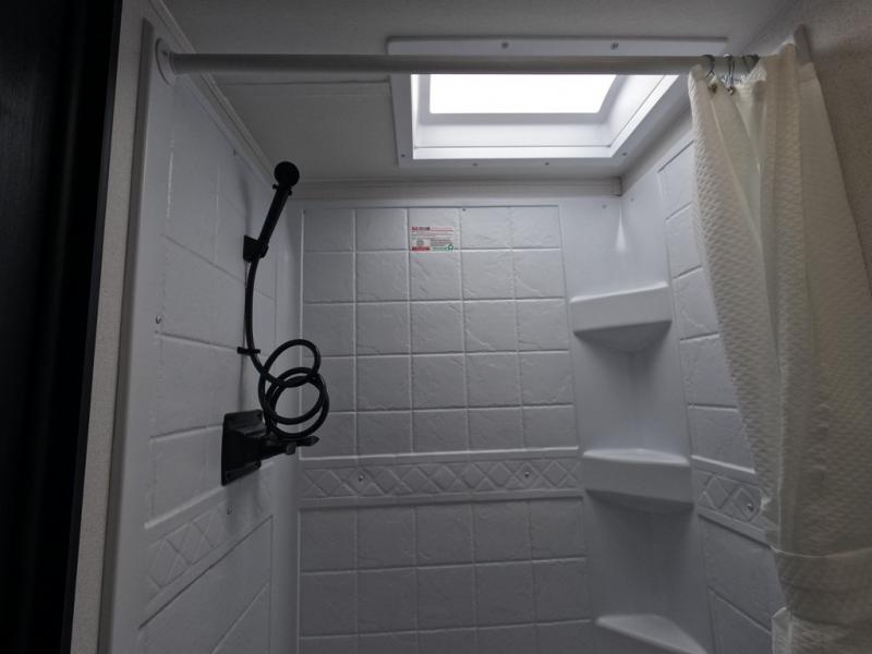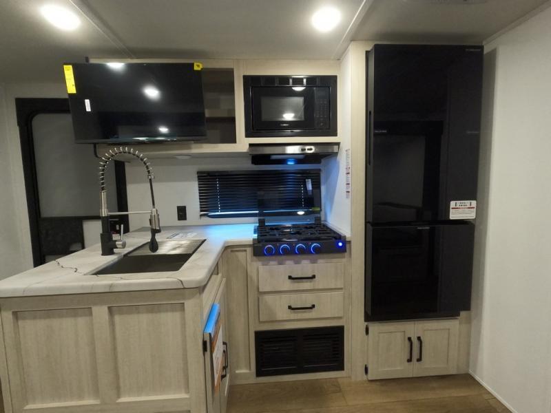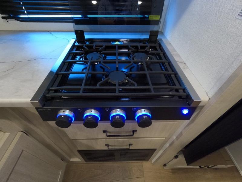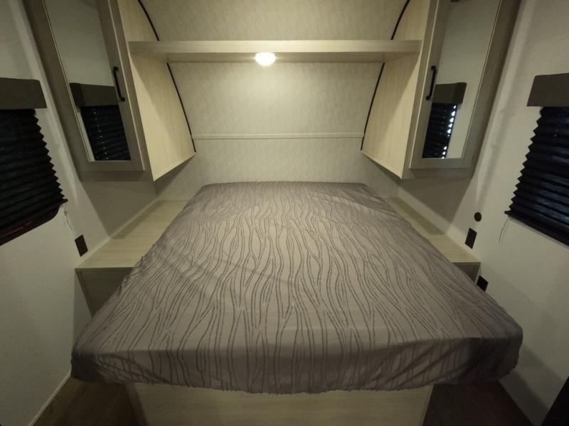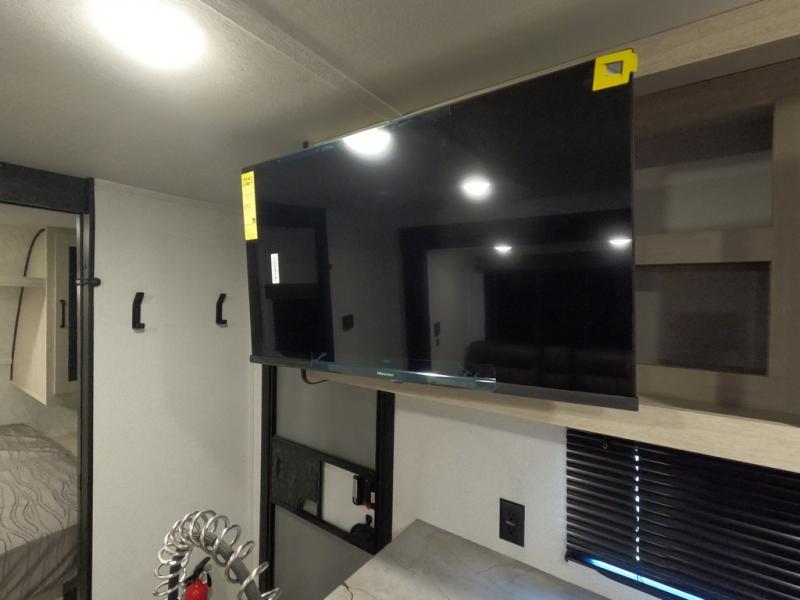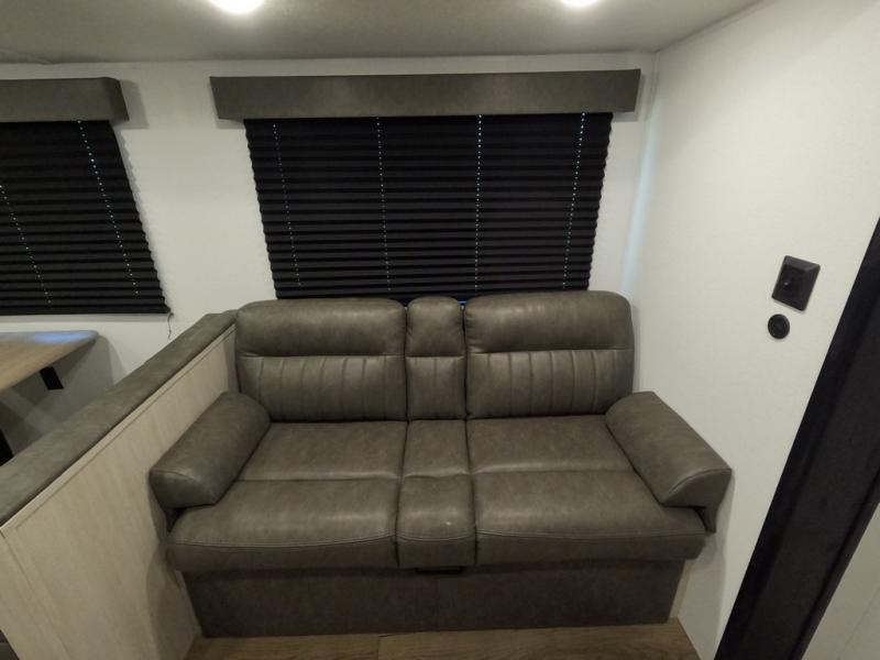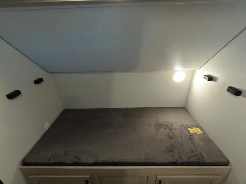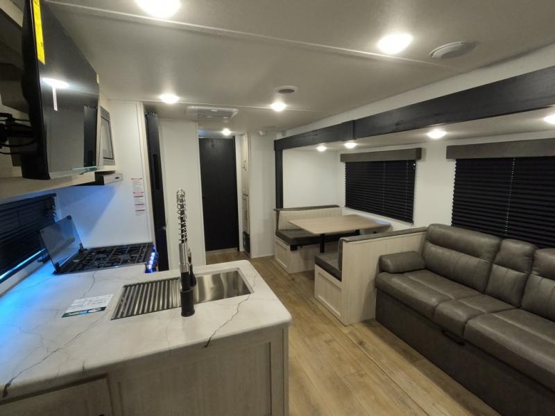 If you're looking for more space, this double axle, double slide out unit is perfect for your group of eight. Within the large slide in the living room, you'll find the booth dinette and sofa, which sit across from the optional TV if you want to enjoy movie nights. The full kitchen includes a stainless microwave and three burner cooktop to make meals, plus a pantry and 12V refrigerator for food storage. And an optional outside kitchen with a griddle can be added if you enjoy cooking outdoors! Your guests or littles are sure to enjoy the rear private bunkhouse that features a set of 38" x 76" bunks across from the third bunk and jiffy sofa within a slide out!