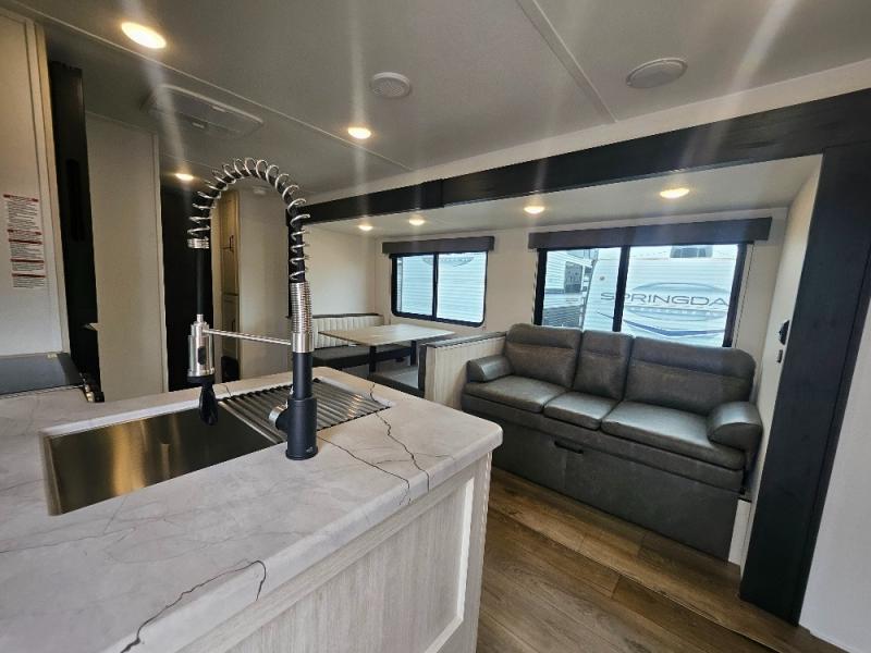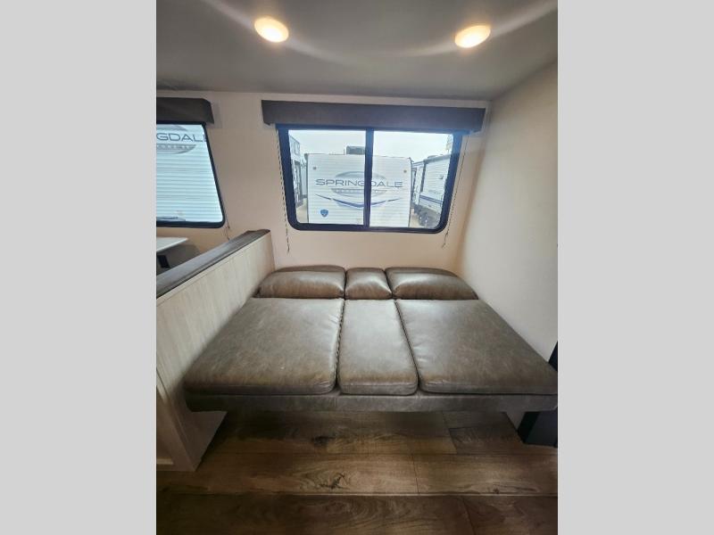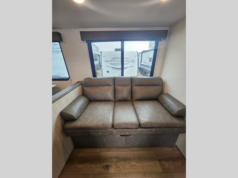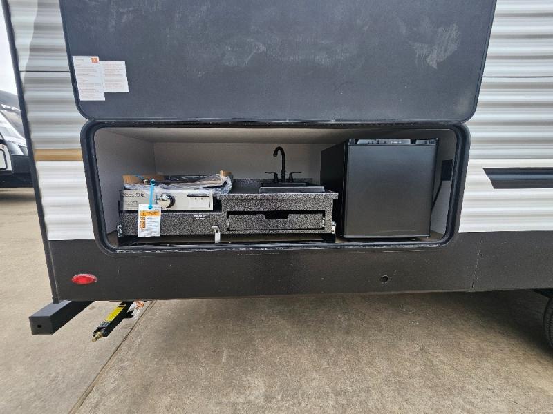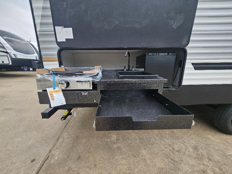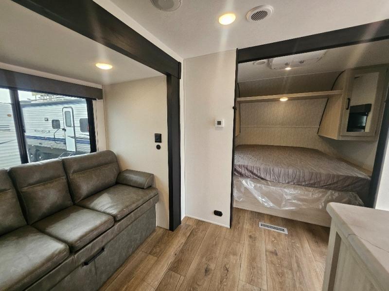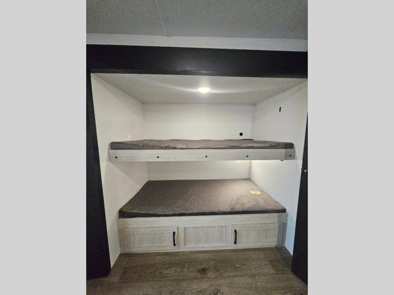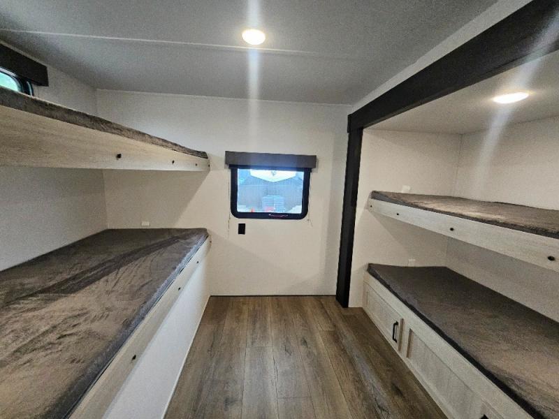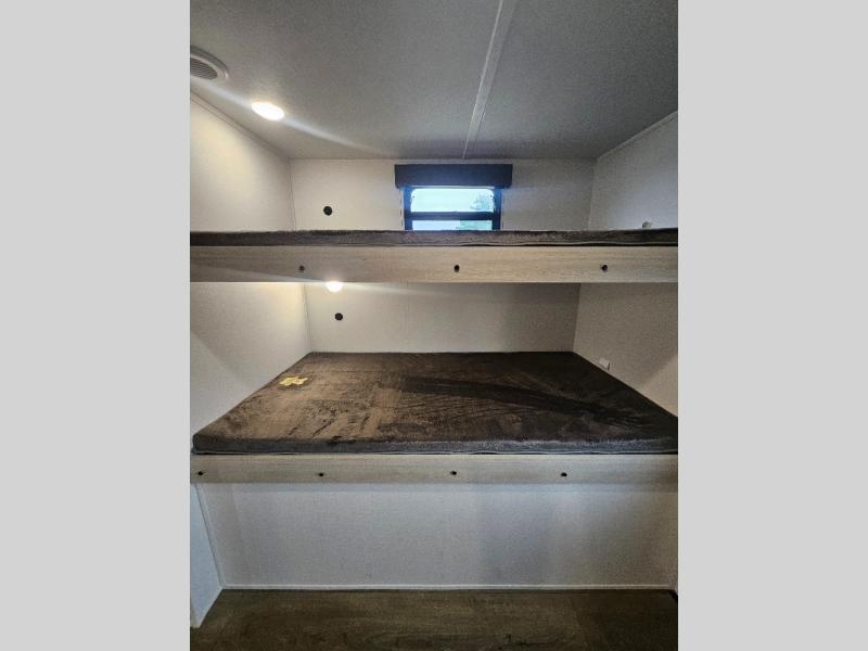 If you're looking for more space, this double axle, double slide out unit is perfect for your group of eight. Within the large slide in the living room, you'll find the booth dinette and sofa, which sit across from the optional TV if you want to enjoy movie nights. The full kitchen includes a stainless microwave and three burner cooktop to make meals, plus a pantry and 12V refrigerator for food storage. And an optional outside kitchen with a griddle can be added if you enjoy cooking outdoors! Your guests or littles are sure to enjoy the rear private bunkhouse that features a set of 38" x 76" bunks across from the third bunk and jiffy sofa within a slide out!