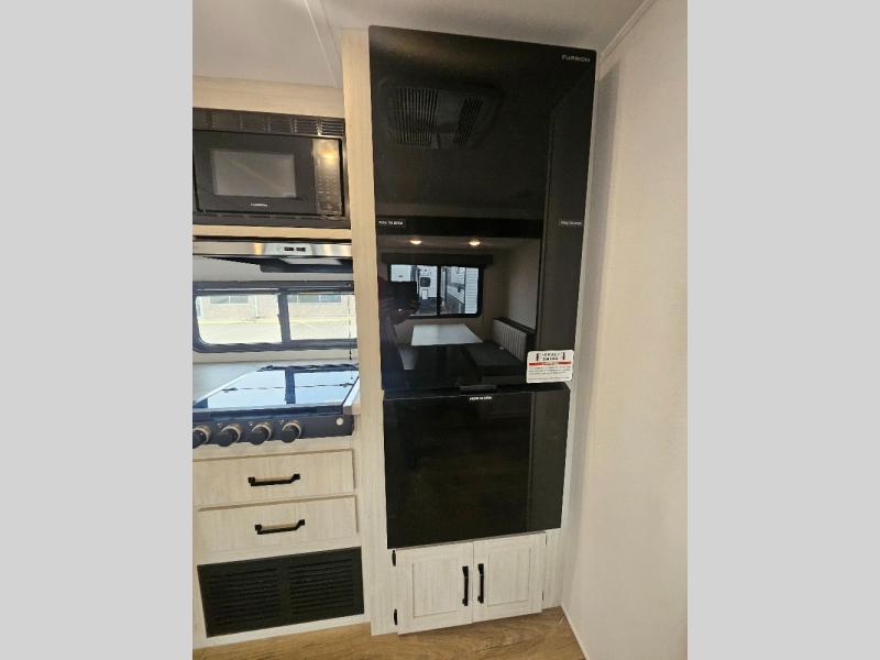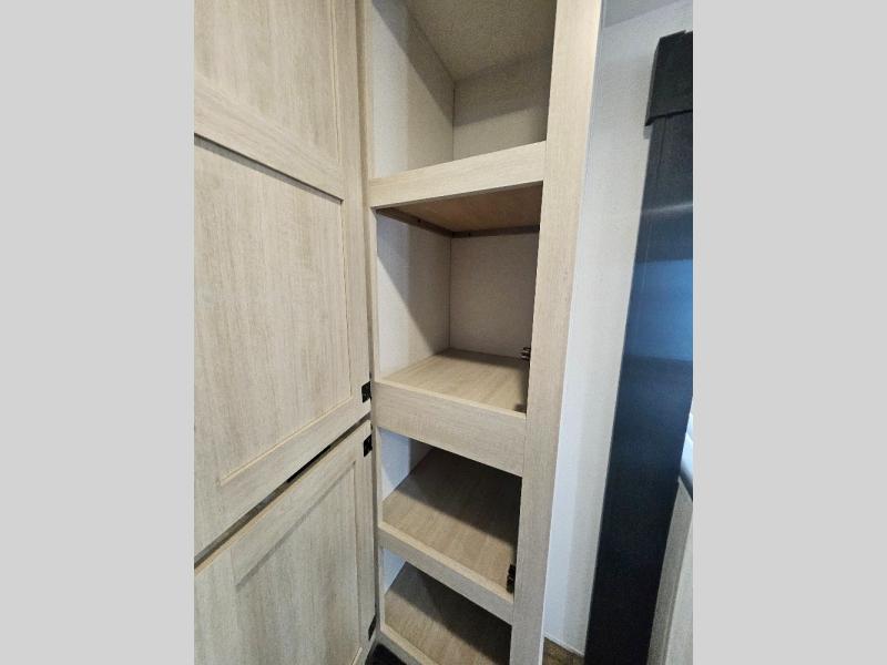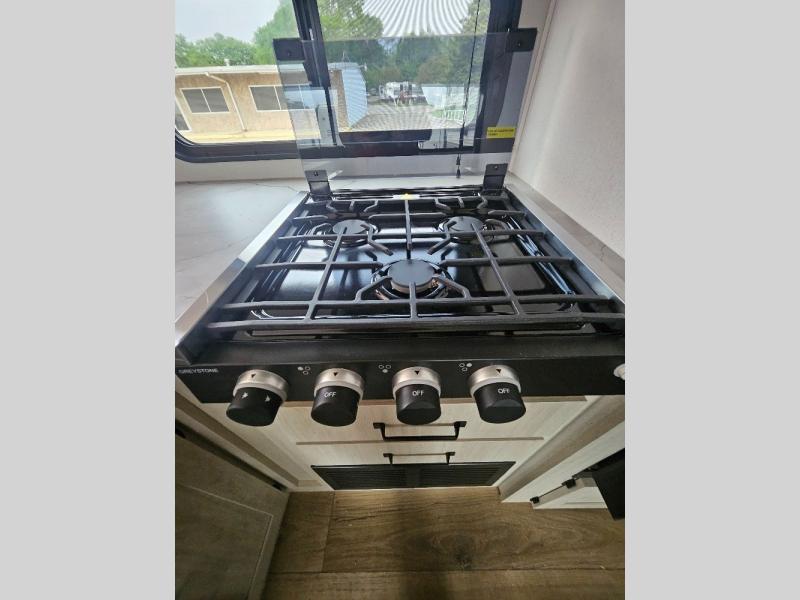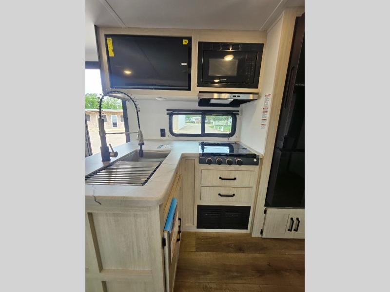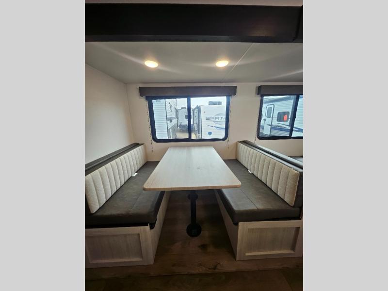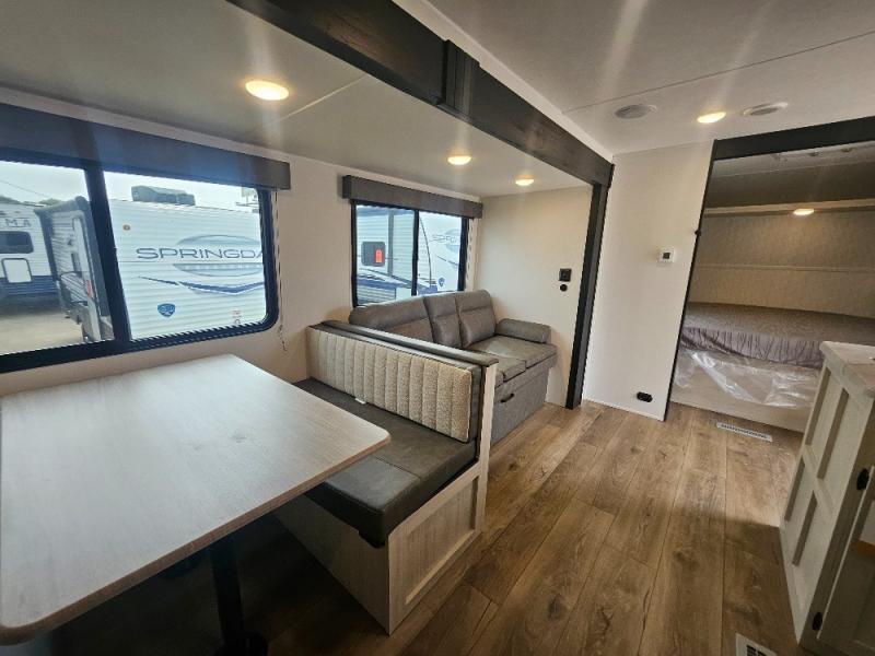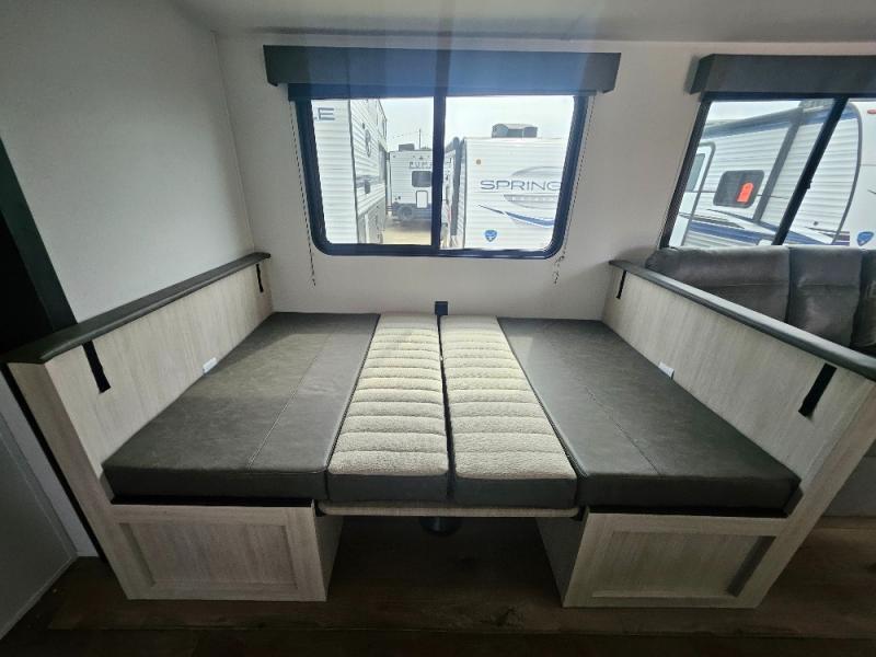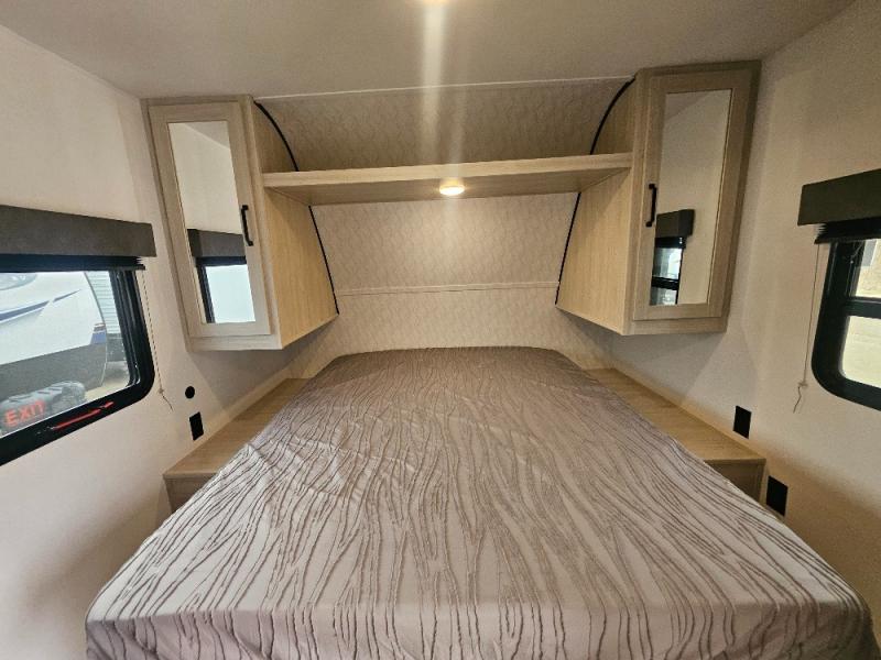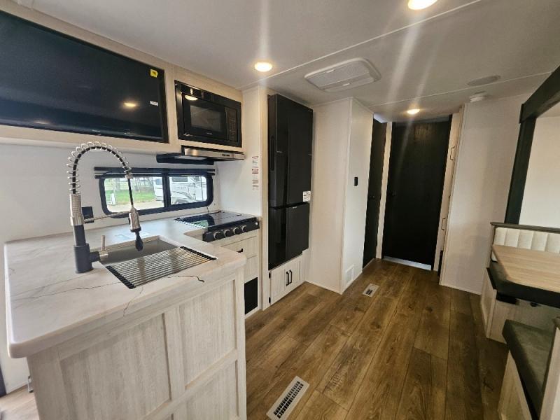 If you're looking for more space, this double axle, double slide out unit is perfect for your group of eight. Within the large slide in the living room, you'll find the booth dinette and sofa, which sit across from the optional TV if you want to enjoy movie nights. The full kitchen includes a stainless microwave and three burner cooktop to make meals, plus a pantry and 12V refrigerator for food storage. And an optional outside kitchen with a griddle can be added if you enjoy cooking outdoors! Your guests or littles are sure to enjoy the rear private bunkhouse that features a set of 38" x 76" bunks across from the third bunk and jiffy sofa within a slide out!