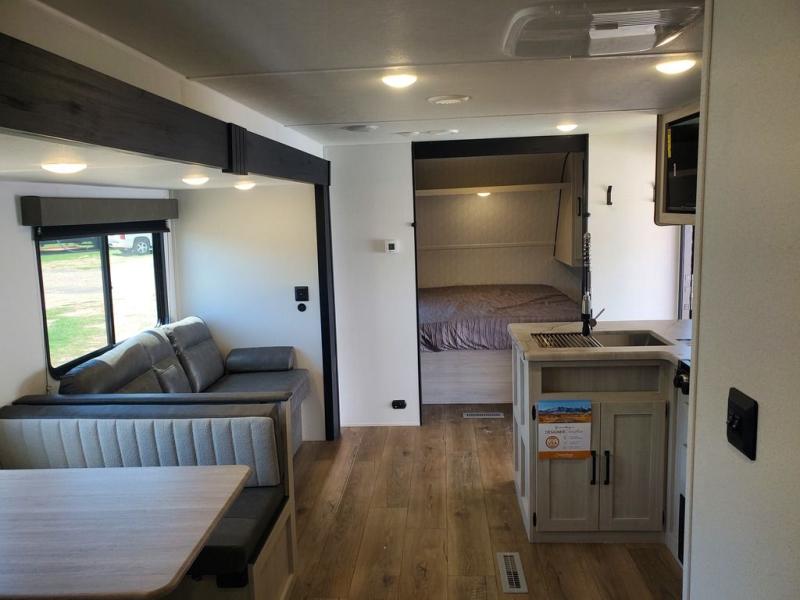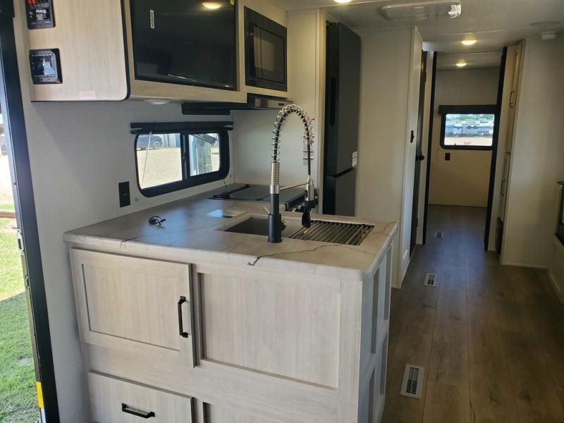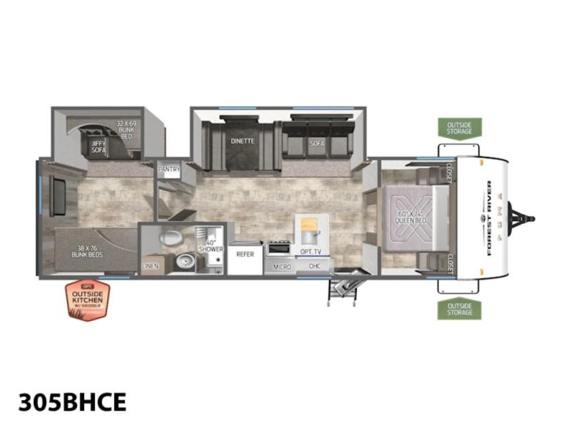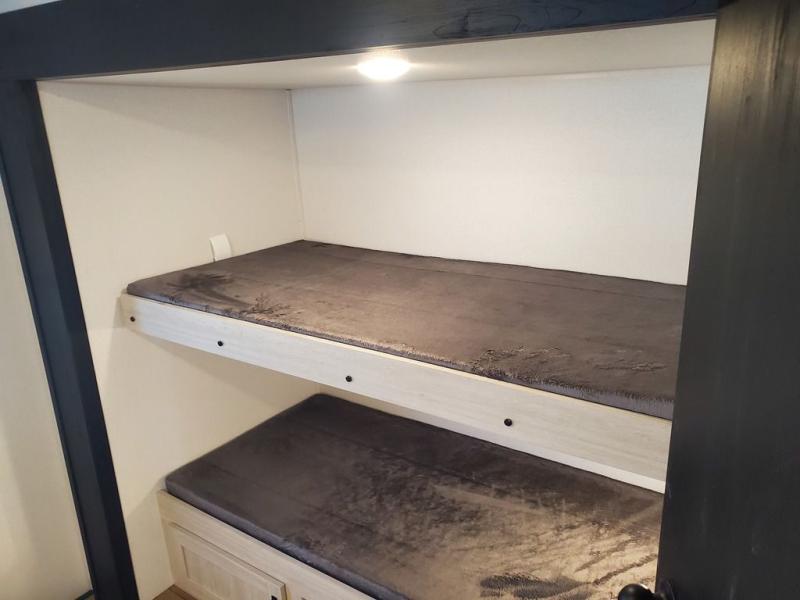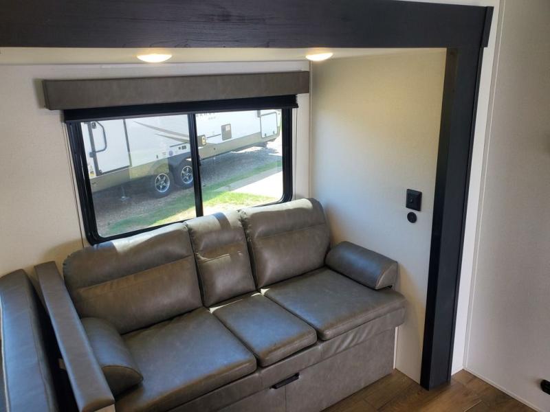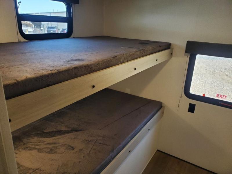 If you're looking for more space, this double axle, double slide out unit is perfect for your group of eight. Within the large slide in the living room, you'll find the booth dinette and sofa, which sit across from the optional TV if you want to enjoy movie nights. The full kitchen includes a stainless microwave and three burner cooktop to make meals, plus a pantry and 12V refrigerator for food storage. And an optional outside kitchen with a griddle can be added if you enjoy cooking outdoors! Your guests or littles are sure to enjoy the rear private bunkhouse that features a set of 38" x 76" bunks across from the third bunk and jiffy sofa within a slide out!