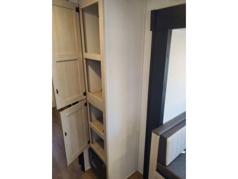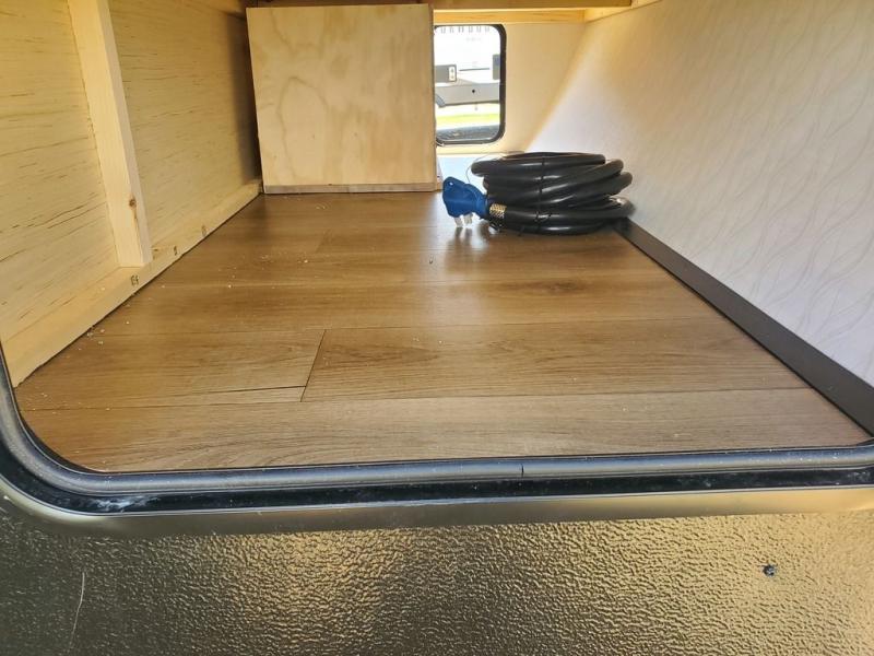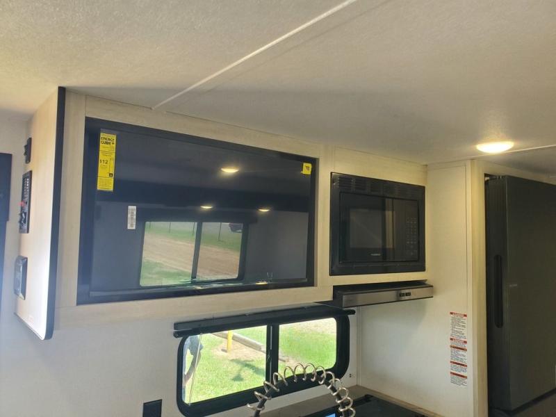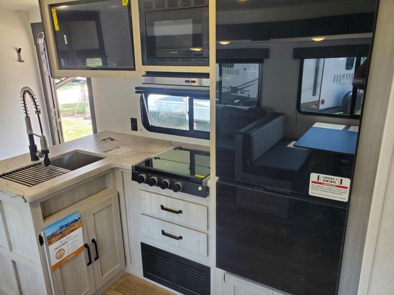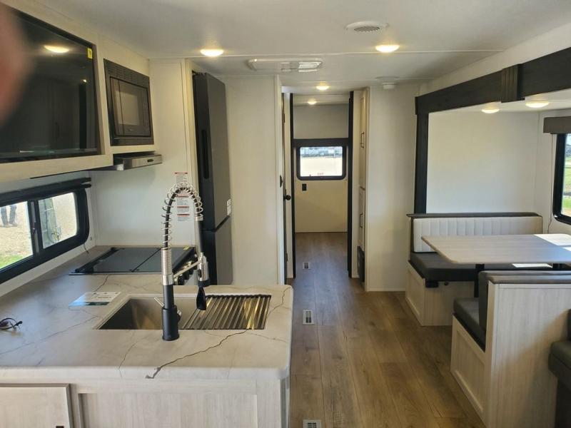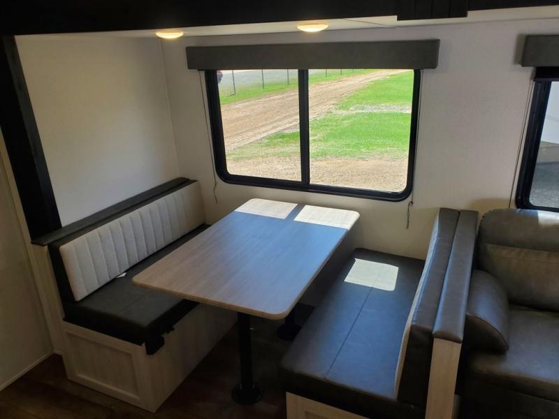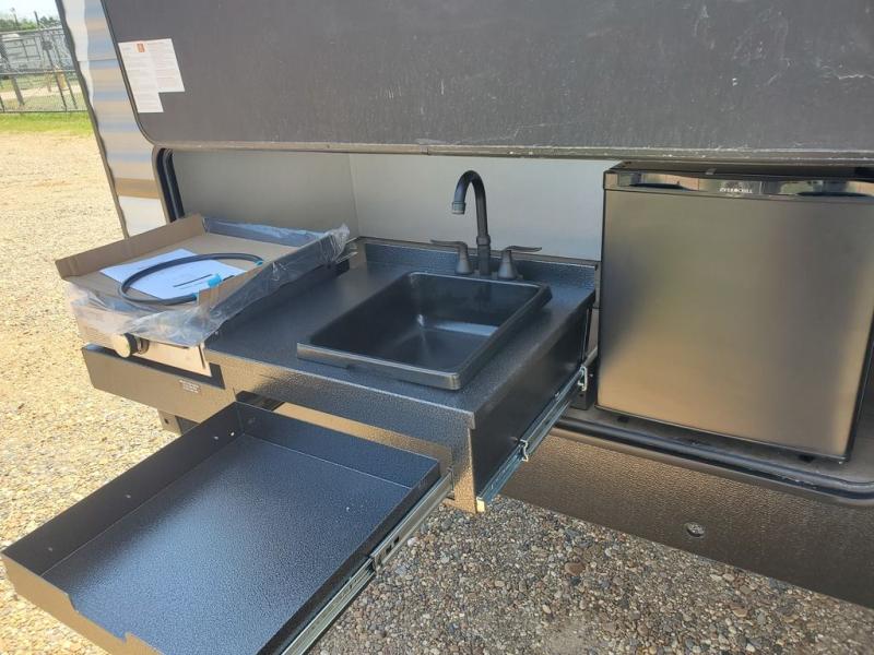 If you're looking for more space, this double axle, double slide out unit is perfect for your group of eight. Within the large slide in the living room, you'll find the booth dinette and sofa, which sit across from the optional TV if you want to enjoy movie nights. The full kitchen includes a stainless microwave and three burner cooktop to make meals, plus a pantry and 12V refrigerator for food storage. And an optional outside kitchen with a griddle can be added if you enjoy cooking outdoors! Your guests or littles are sure to enjoy the rear private bunkhouse that features a set of 38" x 76" bunks across from the third bunk and jiffy sofa within a slide out!