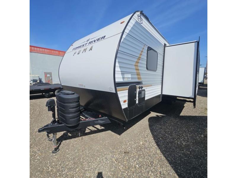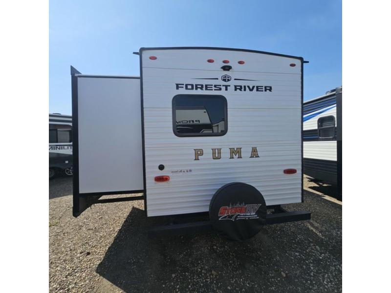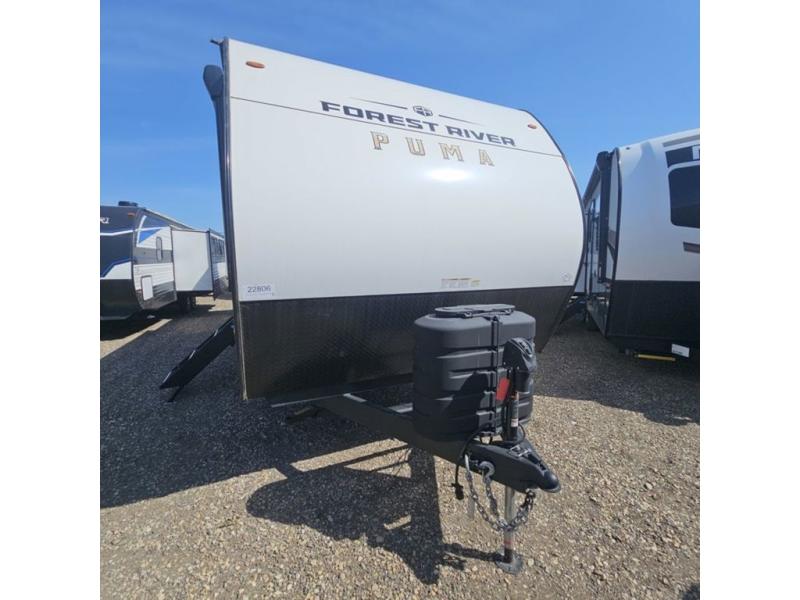 The Puma Camping Edition by Palomino offer an affordable travel trailer for rookie campers or seasoned RVers! They are built with 5/8" tongue and groove plywood flooring and a front diamond plate for added protection. There are also exterior clamp style door latches, back up camera prep, and 20 lb. LP bottles. Head inside to find Thermofoil countertops with a smooth drop edge, bedroom USB ports and outlets, and a GE appliance and kitchen package.