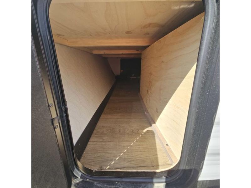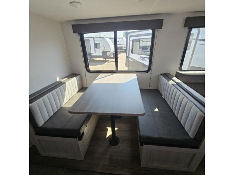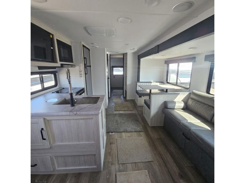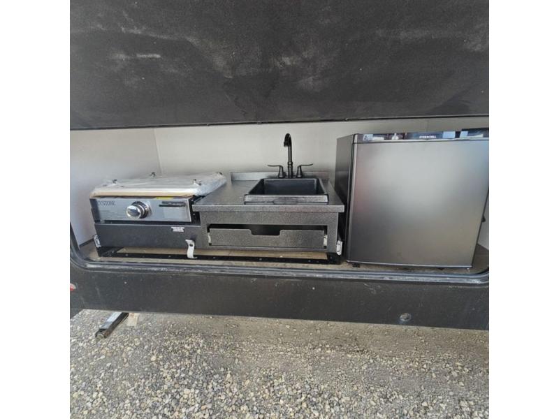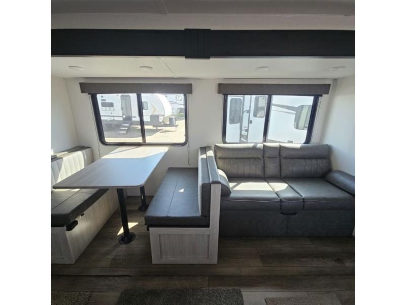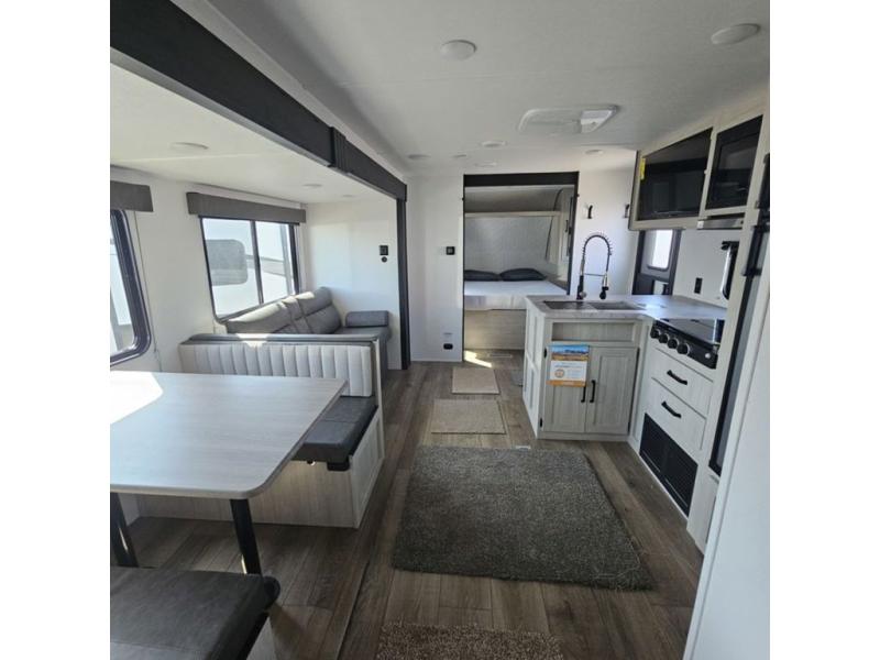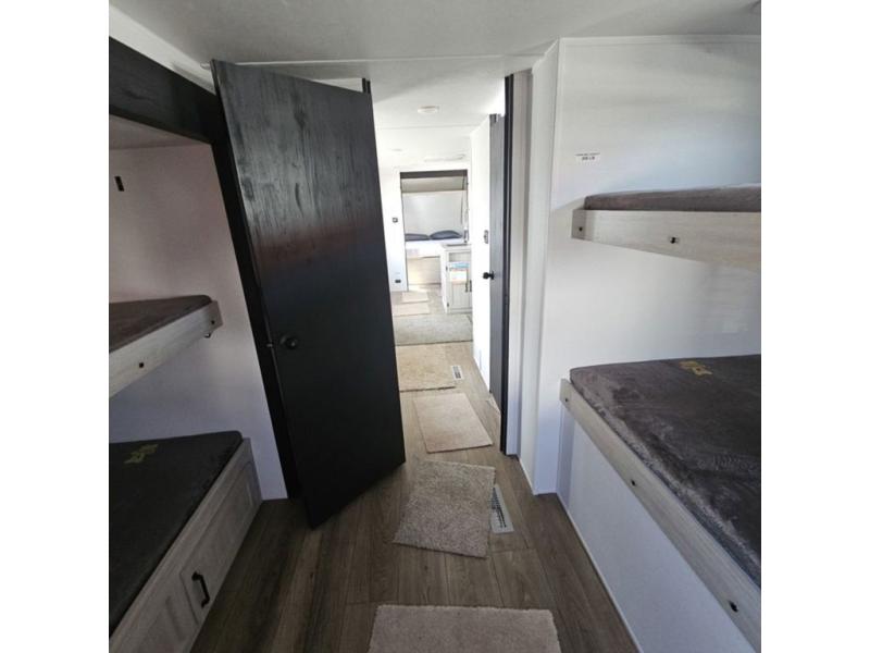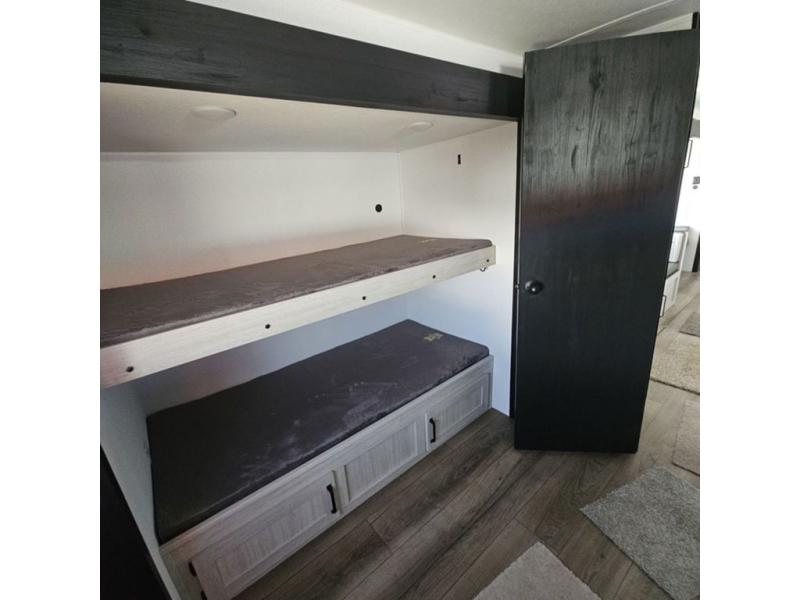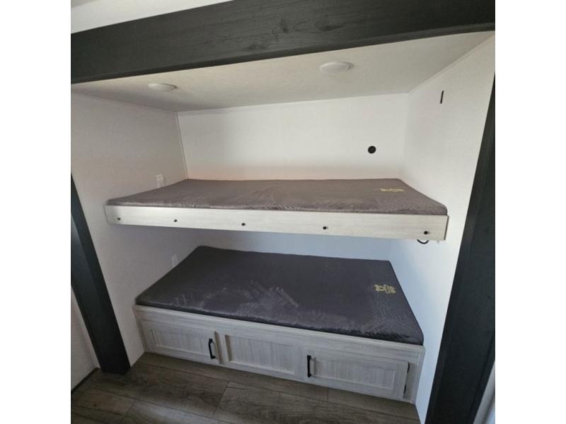 If you're looking for more space, this double axle, double slide out unit is perfect for your group of eight. Within the large slide in the living room, you'll find the booth dinette and sofa, which sit across from the optional TV if you want to enjoy movie nights. The full kitchen includes a stainless microwave and three burner cooktop to make meals, plus a pantry and 12V refrigerator for food storage. And an optional outside kitchen with a griddle can be added if you enjoy cooking outdoors! Your guests or littles are sure to enjoy the rear private bunkhouse that features a set of 38" x 76" bunks across from the third bunk and jiffy sofa within a slide out!