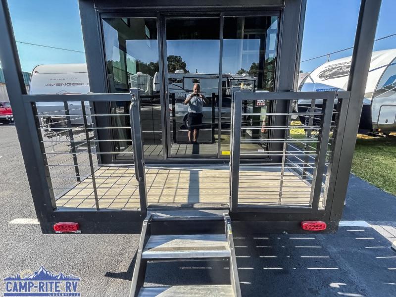 Additional features include 50 AMP service, solid surface countertops, a 5,100 BTU color-changing fireplace, a patio door, and washer/dryer prep for added convenience. Exterior amenities include an outside shower, four stabilizer jacks, three A/Cs, a roof ladder, and pre-wiring for solar. Enjoy the entertainment of a stereo system with Bluetooth and two exterior speakers.
