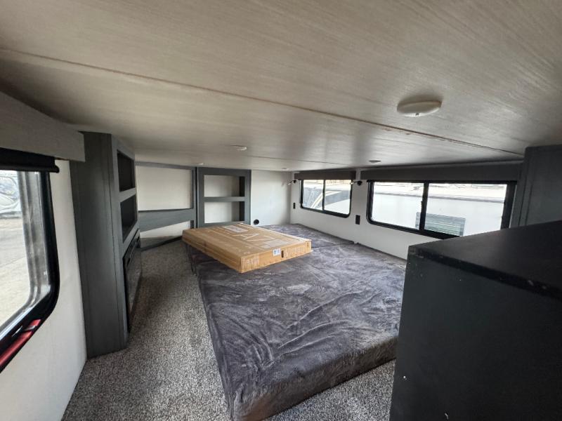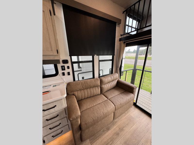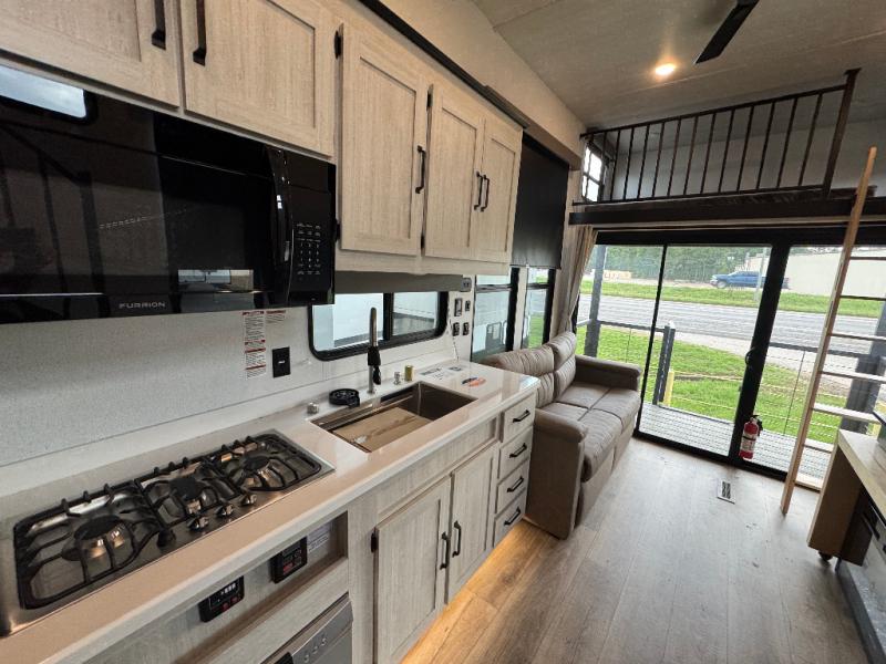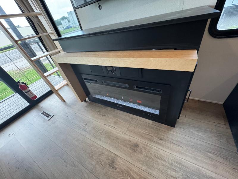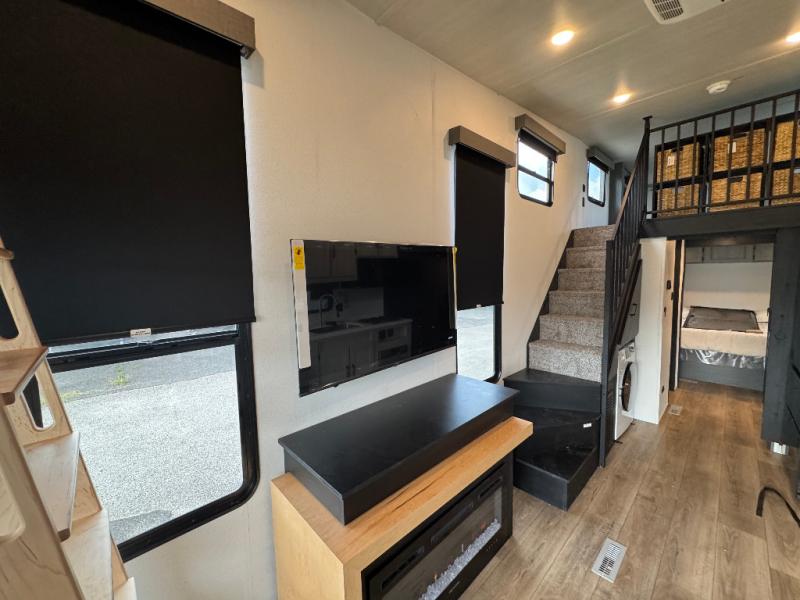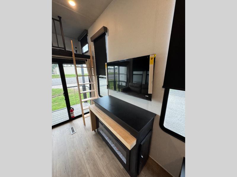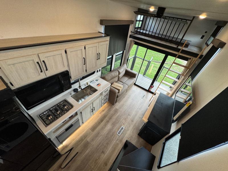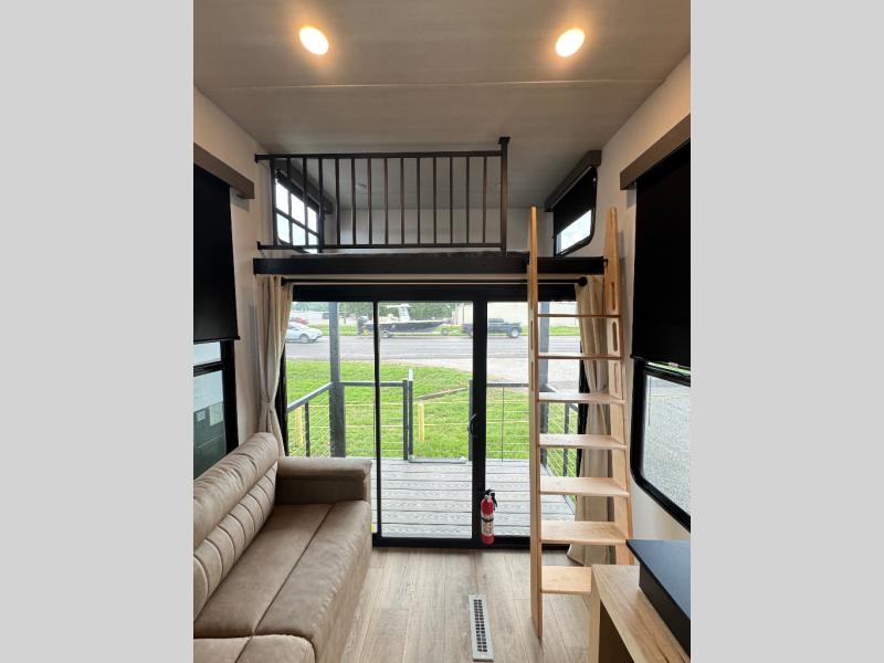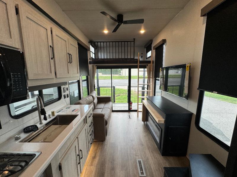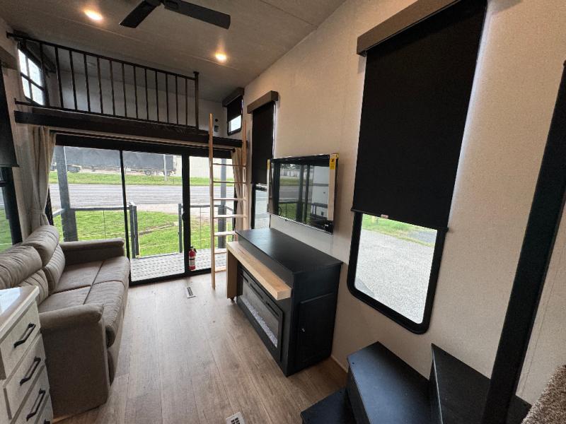 Extended stays are easier than ever with this destination trailer with a mini loft! There is a king-size bed in the large loft space, along with a shirt closet and shelves, an entertainment center with TV prep, and an optional fireplace. On the lower level you'll find a sofa where you can relax and let guests stay over, a 12V ceiling fan to keep you comfortable, and a fireplace. The kitchen includes a bar top with two stools for dining space, and the front full bath is spacious and accommodating. There are two linen closets here, shelves, plus a 34" x 40" shower. We've saved the best for last; the rear covered porch with sliding doors! Your crew can enjoy evenings out back with a cold drink, and the second loft is found above this space for more sleeping or storage space; how convenient!