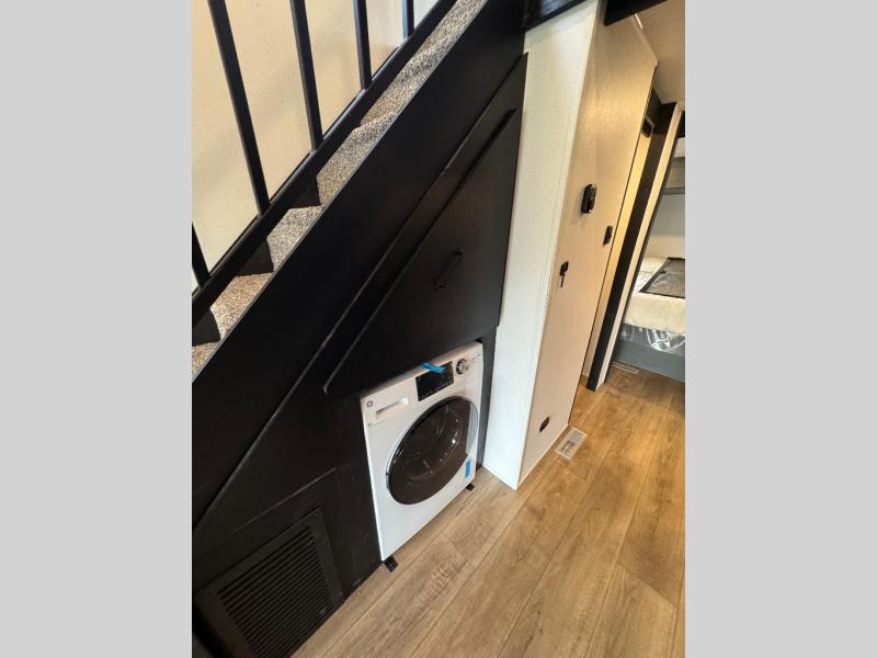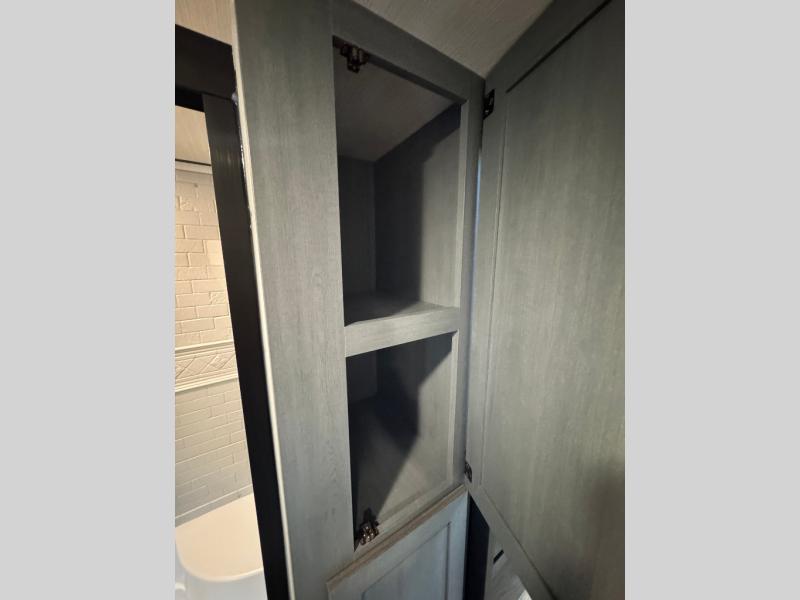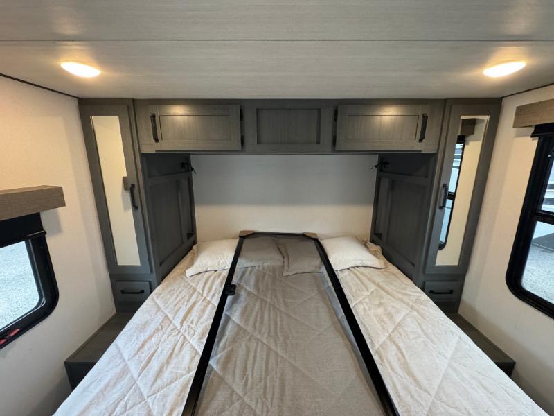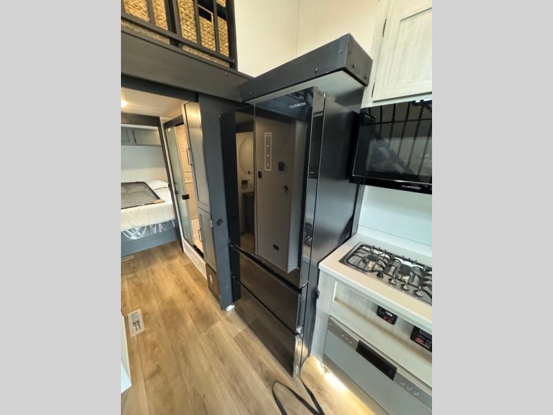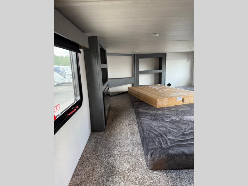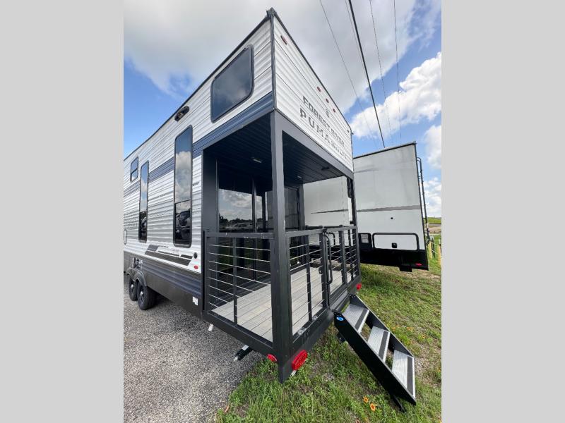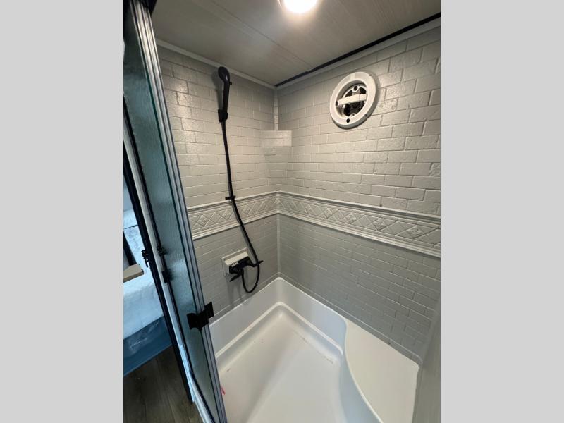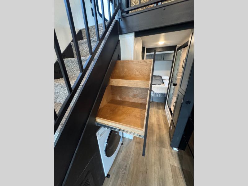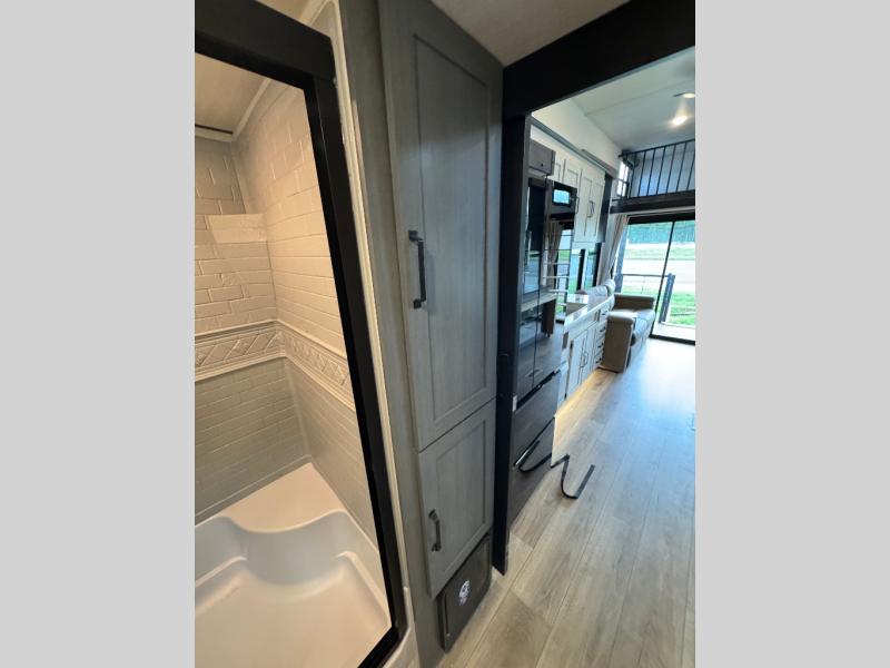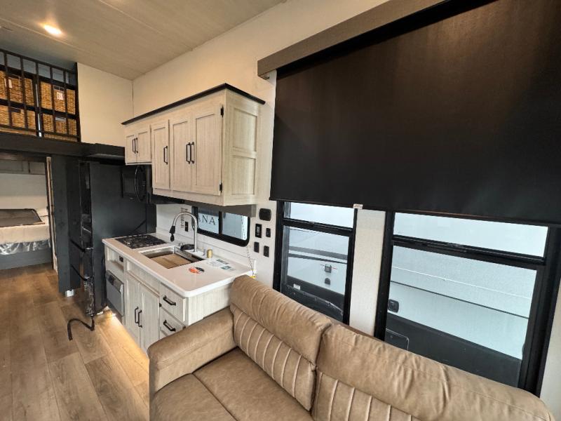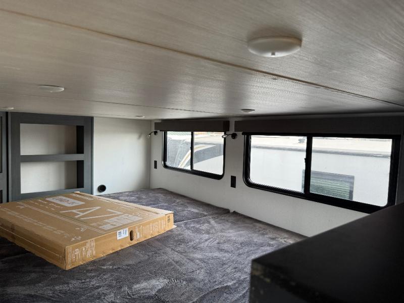 Extended stays are easier than ever with this destination trailer with a mini loft! There is a king-size bed in the large loft space, along with a shirt closet and shelves, an entertainment center with TV prep, and an optional fireplace. On the lower level you'll find a sofa where you can relax and let guests stay over, a 12V ceiling fan to keep you comfortable, and a fireplace. The kitchen includes a bar top with two stools for dining space, and the front full bath is spacious and accommodating. There are two linen closets here, shelves, plus a 34" x 40" shower. We've saved the best for last; the rear covered porch with sliding doors! Your crew can enjoy evenings out back with a cold drink, and the second loft is found above this space for more sleeping or storage space; how convenient!
