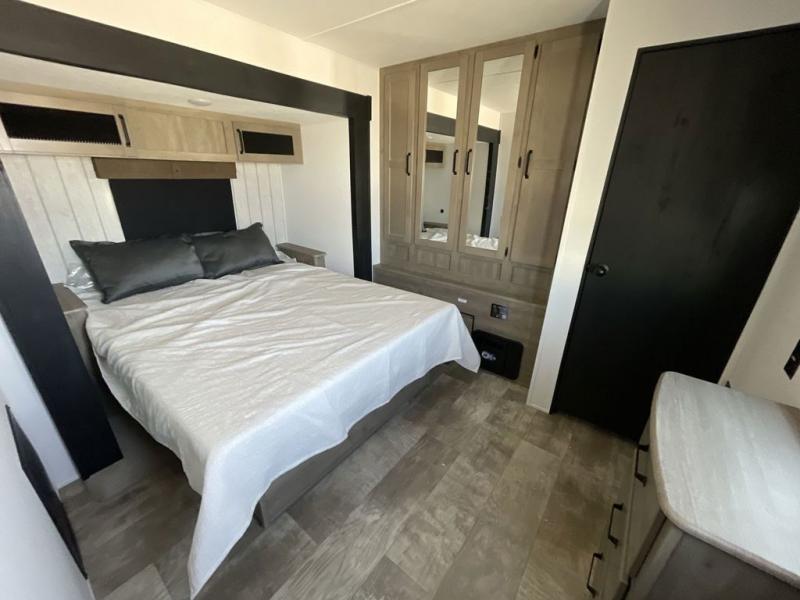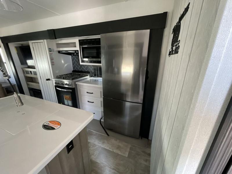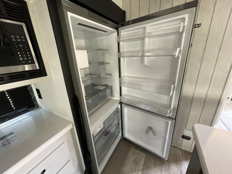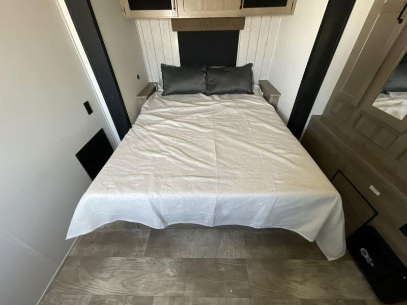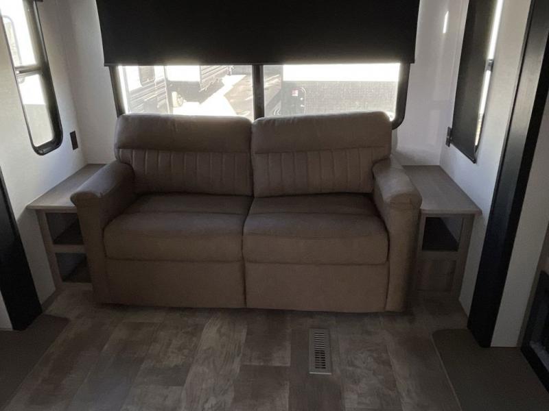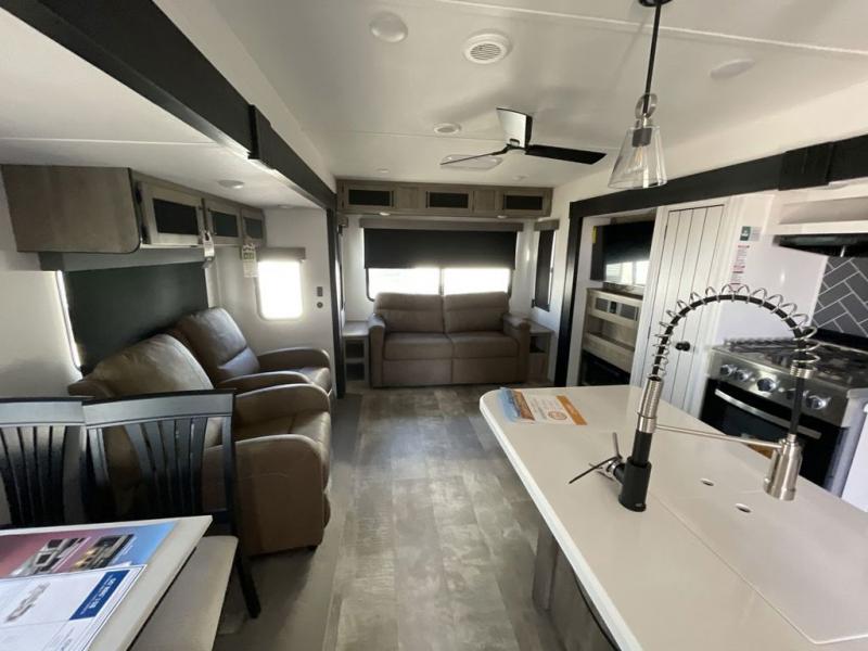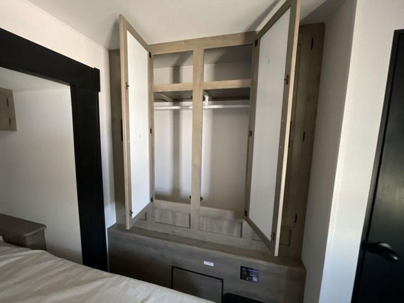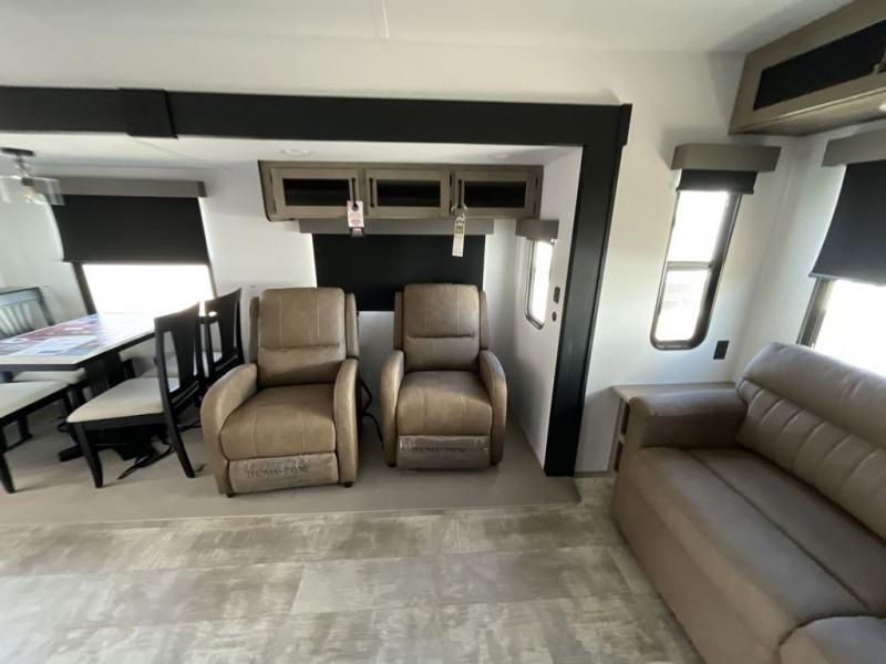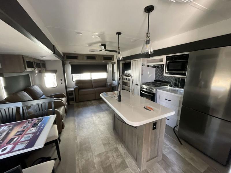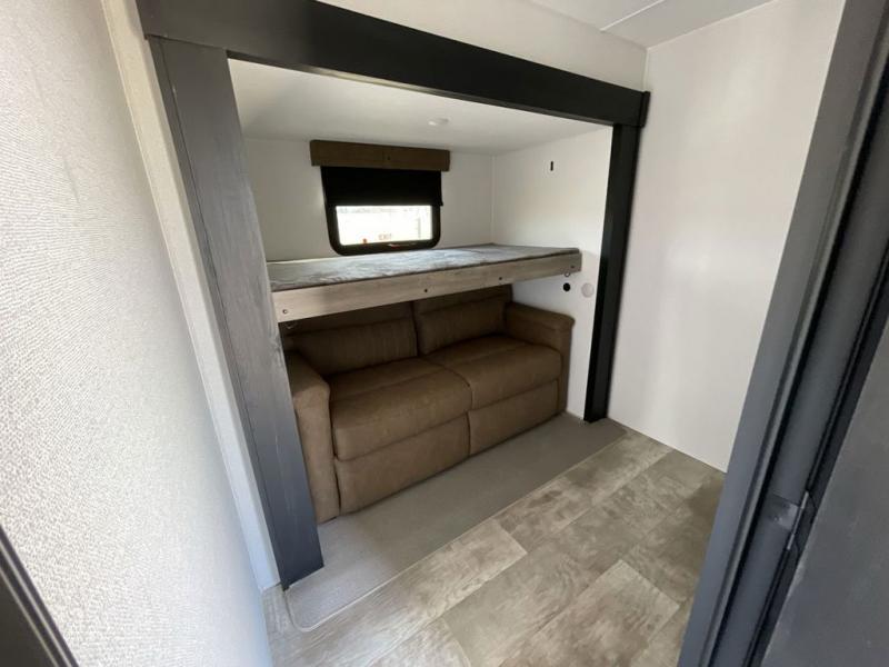 Everyone will want to join you when you head back out to the lake to stay in this trailer! With the middle bunkhouse that includes a bunk above a jiffy sofa and a closet, this can be your kids room or guests headquarters. You will have your own privacy when needed in the front bedroom which includes a queen bed slide and two closets. There is also a dresser and a space within a closet for a washer/dryer prep option. The full bathroom is conveniently located between the two rooms, and the rear of the destination trailer offers a combined living and kitchen area. The dual slides give you lots of floor space around the kitchen island to relax on the booth dinette or sofa, and the cook will have full kitchen amenities including a residential style refrigerator.