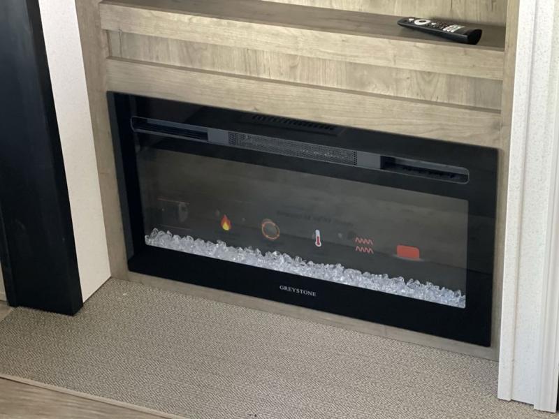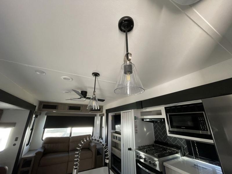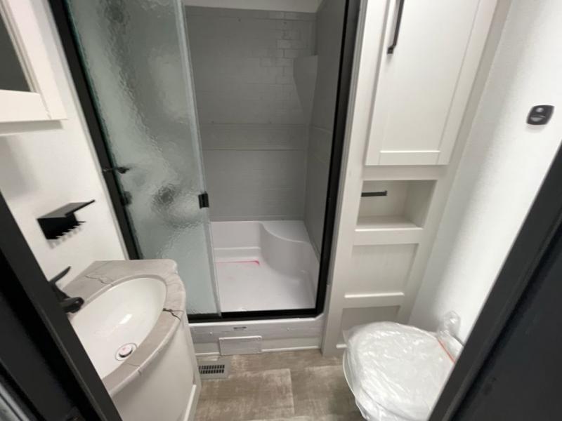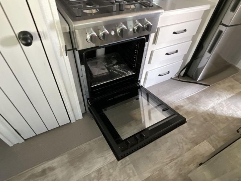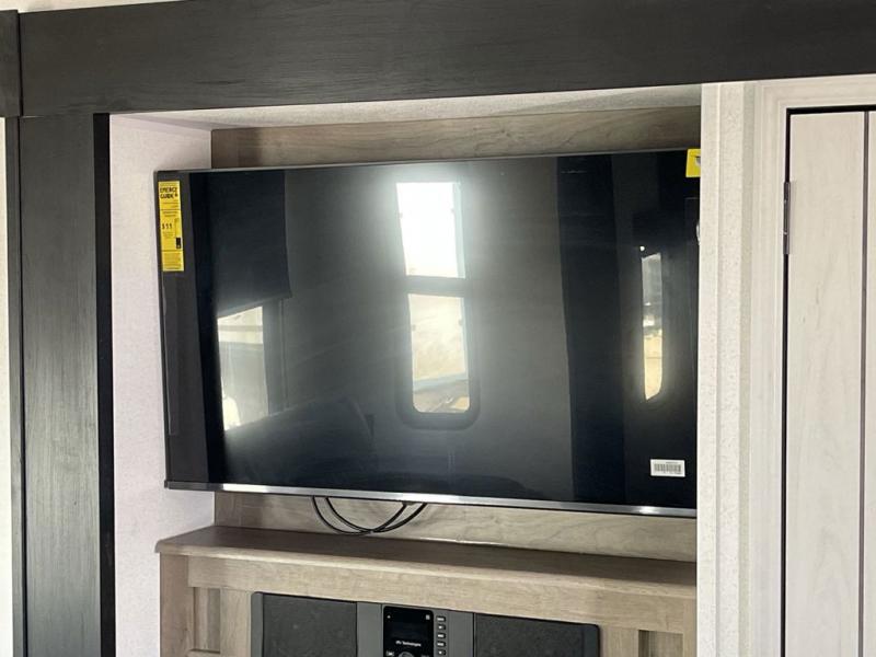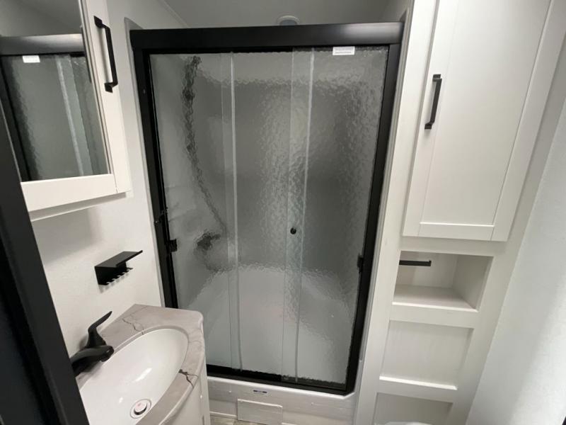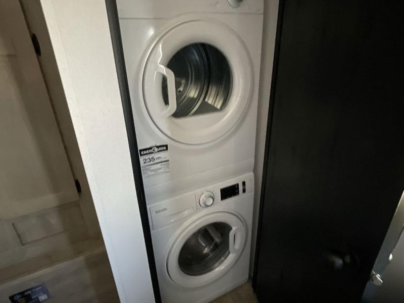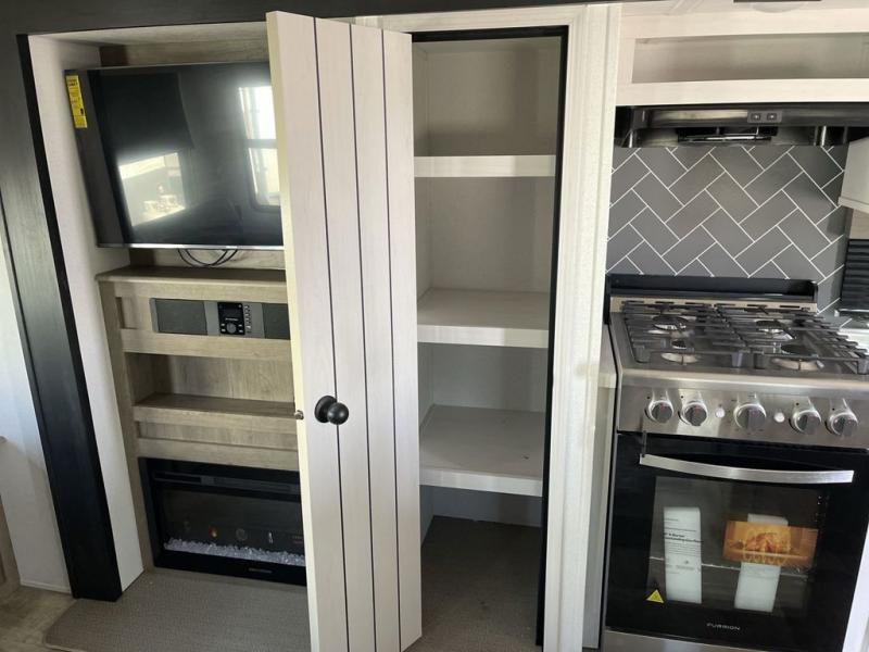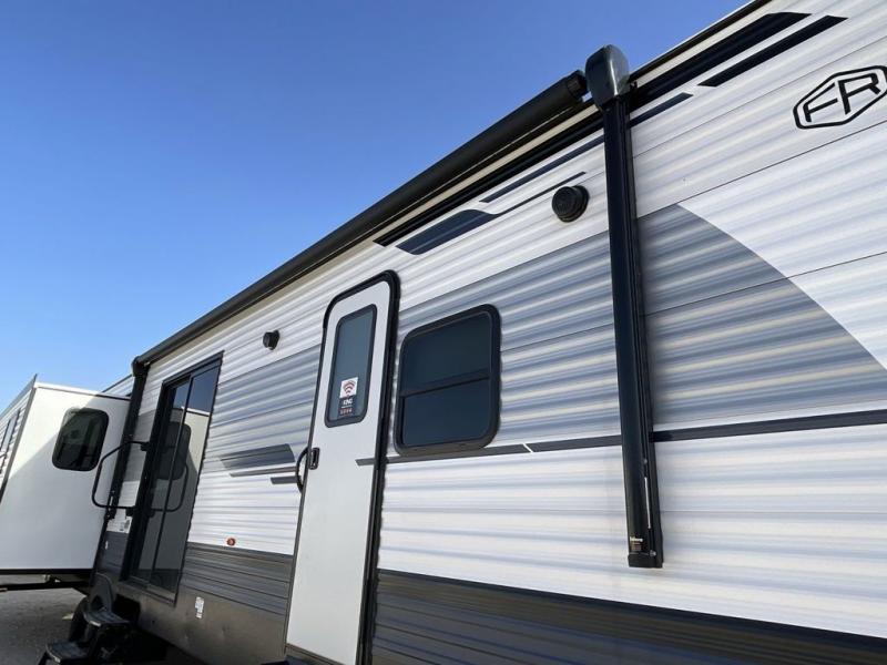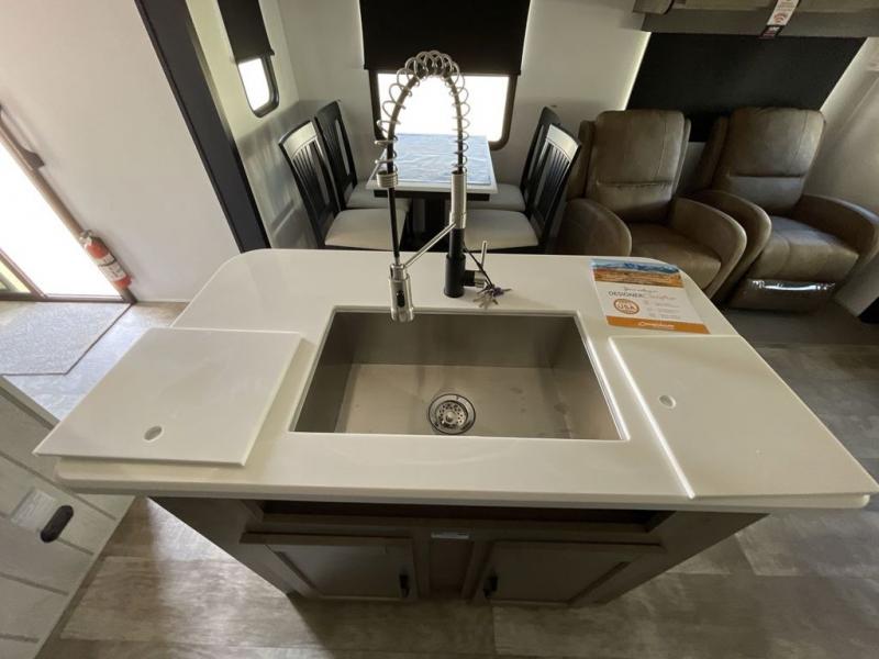 Everyone will want to join you when you head back out to the lake to stay in this trailer! With the middle bunkhouse that includes a bunk above a jiffy sofa and a closet, this can be your kids room or guests headquarters. You will have your own privacy when needed in the front bedroom which includes a queen bed slide and two closets. There is also a dresser and a space within a closet for a washer/dryer prep option. The full bathroom is conveniently located between the two rooms, and the rear of the destination trailer offers a combined living and kitchen area. The dual slides give you lots of floor space around the kitchen island to relax on the booth dinette or sofa, and the cook will have full kitchen amenities including a residential style refrigerator.