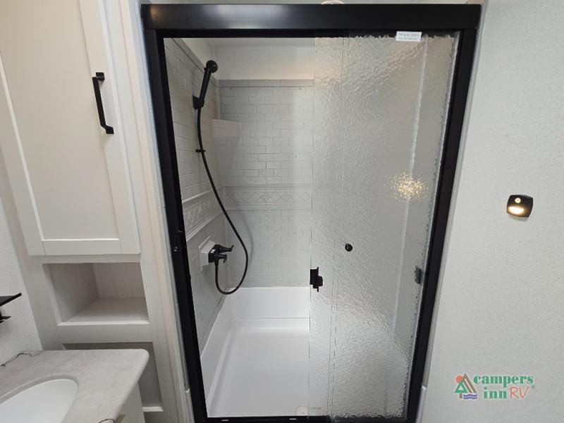 The 2025 Palomino Puma Destination 39DBT is a spacious, feature-rich destination trailer designed for extended stays and comfortable living. With a length of 42 feet 4 inches and three slide-outs, it offers a roomy interior that sleeps up to seven people. The layout includes two full bathrooms and two bedrooms: a front bedroom with a king bed slide, and a rear bedroom with a queen bed slide, vanity, and wardrobe. The kitchen is equipped with a residential-style 18 cu. ft. stainless steel refrigerator with an ice maker, a 24" oven with a cooktop and range hood, and a 13,500 BTU ducted A/C. Additional amenities include a 21-foot electric awning with an LED light strip, a patio door, and WiFi prep for connectivity on the go.
