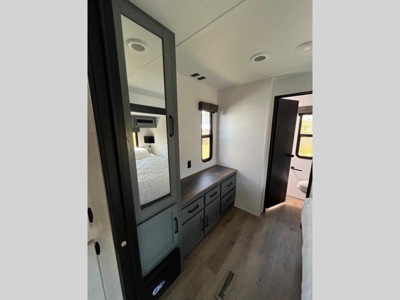Get out of town and start enjoying the beautiful weather and scenery where you have chosen to place this Puma Destination. This spacious trailer has three slide outs for lots of interior floor space, plus two entries for convenience. The front bedroom offers a king bed slide, two closets, and a dresser. The rear bedroom suite includes a full bathroom and a queen bed slide, a vanity and a wardrobe. In between you can relax in the combined living and kitchen area on the sofa or booth dinette while visiting with the cook with full amenities.