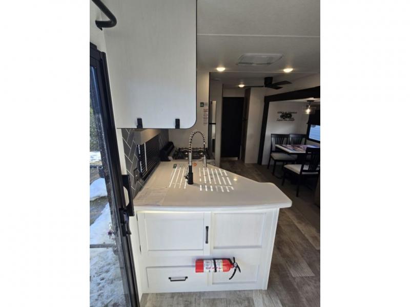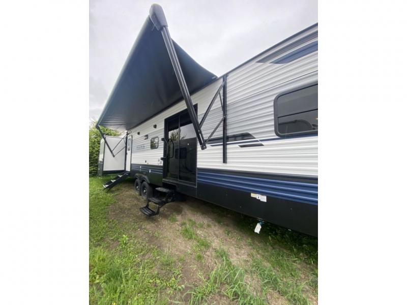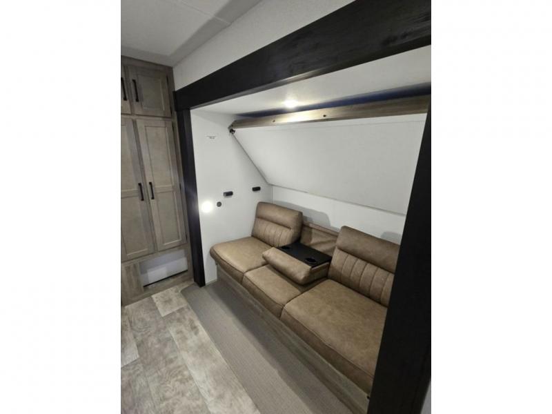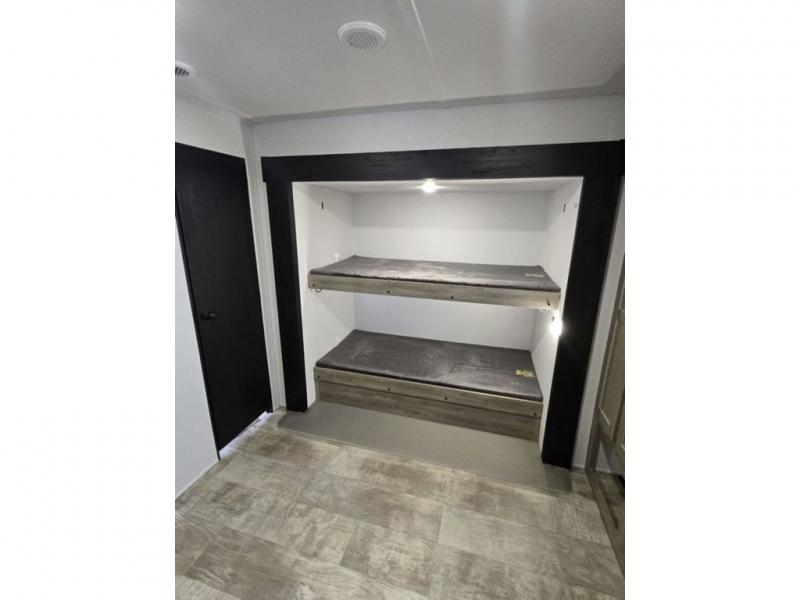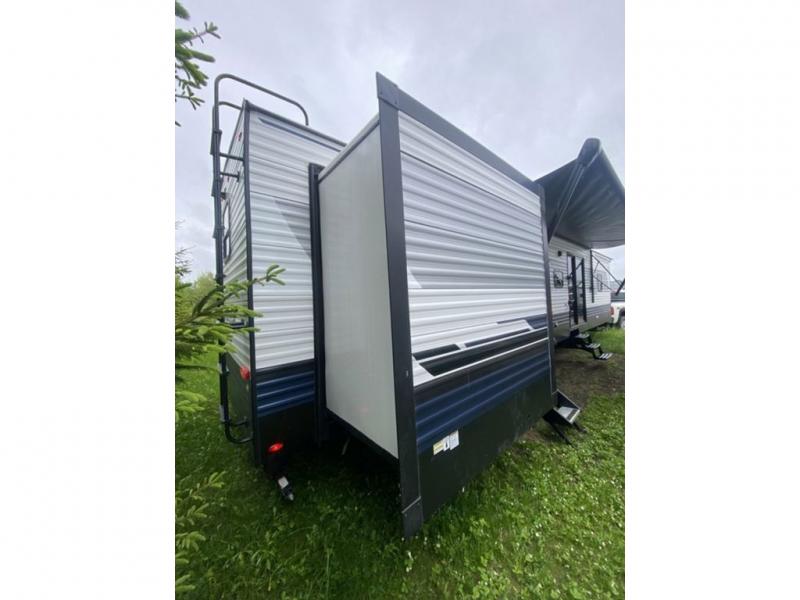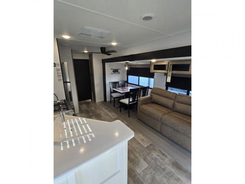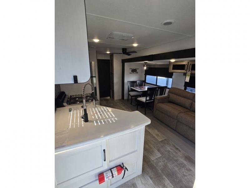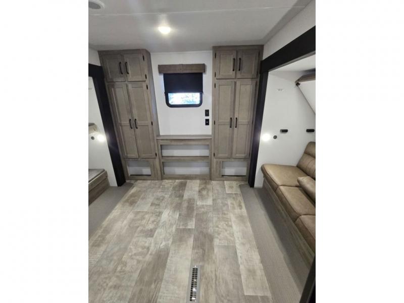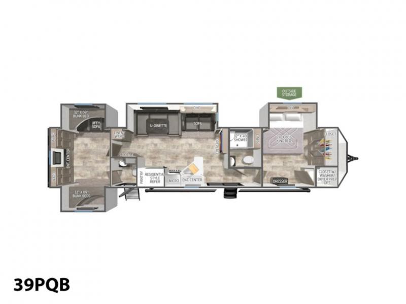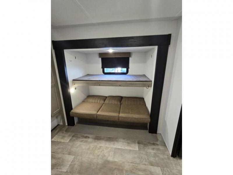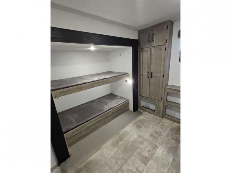This destination trailer will probably be in the family for years to come with all of its features and amenities such as the rear private bunkhouse with a half bath attached, the dual entry doors for a smooth flow of traffic, and the spacious bedroom with a slide out king-size bed. There is even a closet with the option to add washer and dryer prep. The bunkhouse includes a slide out bunk with a jiffy sofa below, a slide out set of bunks, plus an entertainment center in between two wardrobes. The main living and kitchen area offers full amenities, a U-shaped dinette to dine at, and a sofa to relax on. You even have an optional outside kitchen to cook meals in the great outdoors!