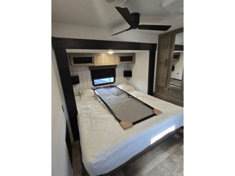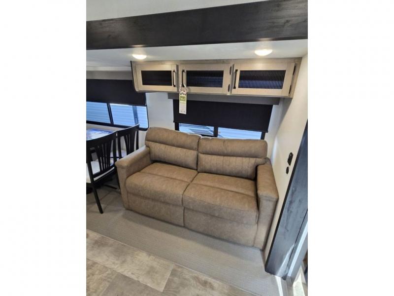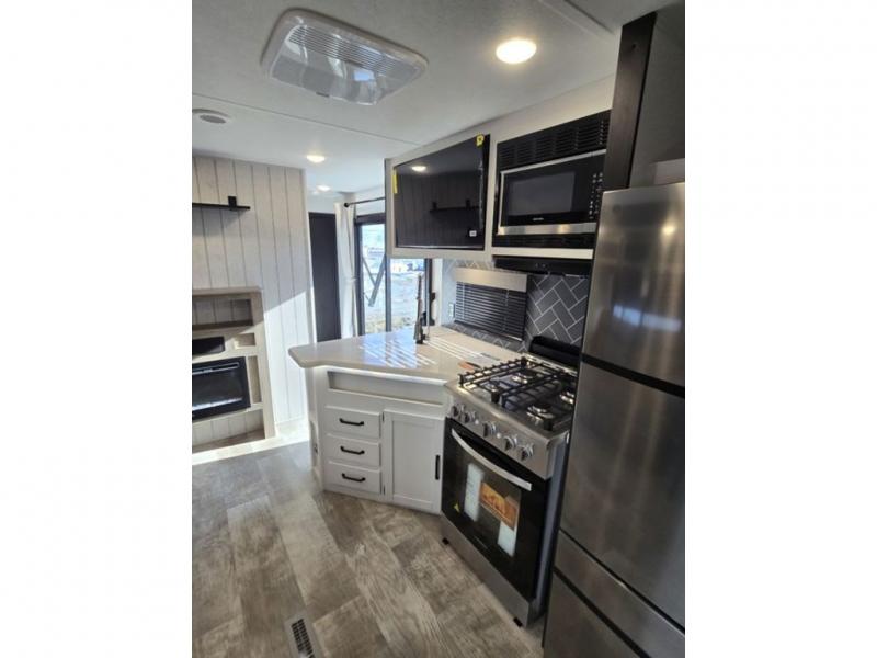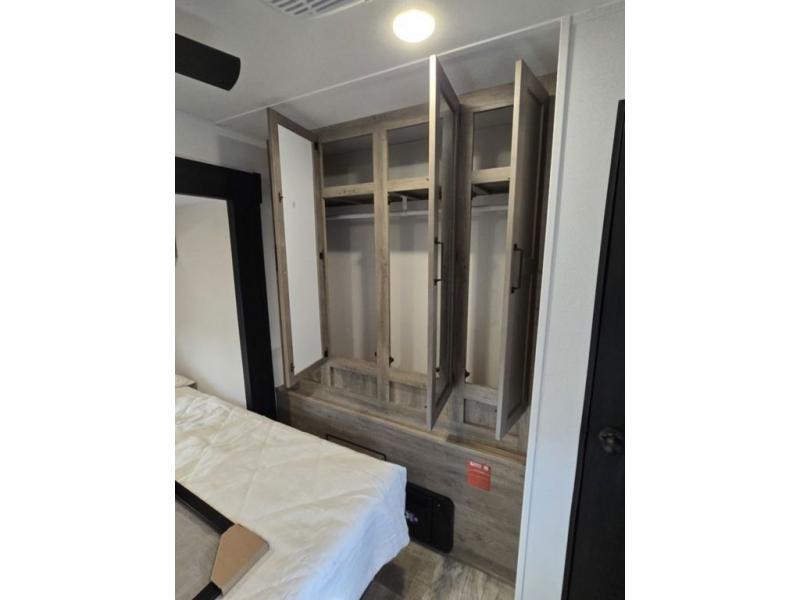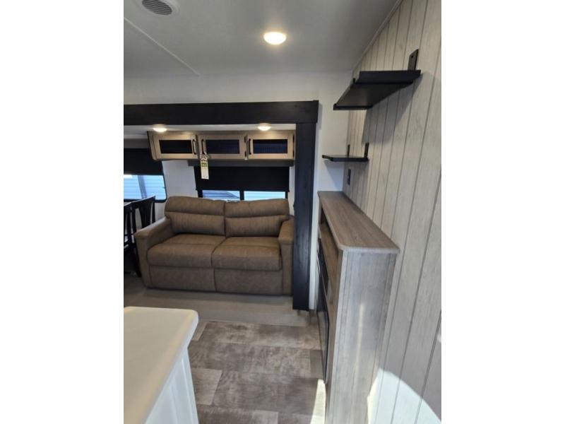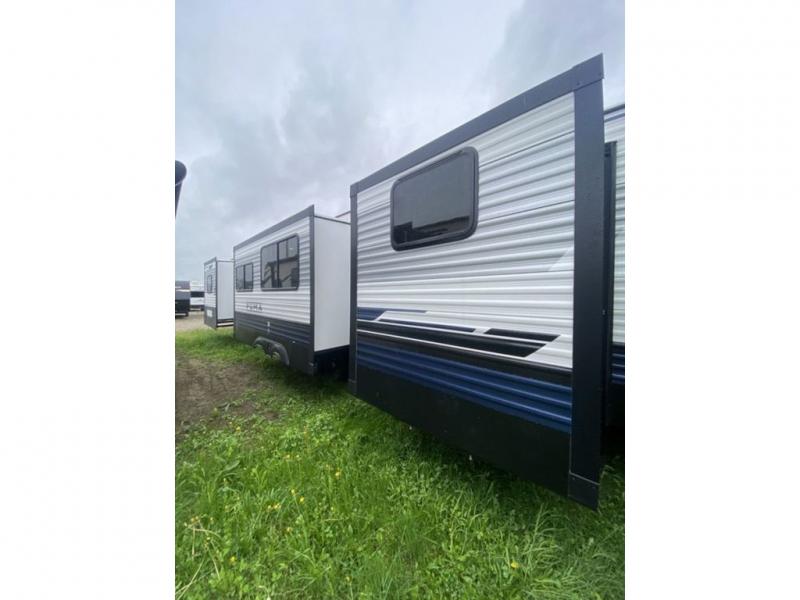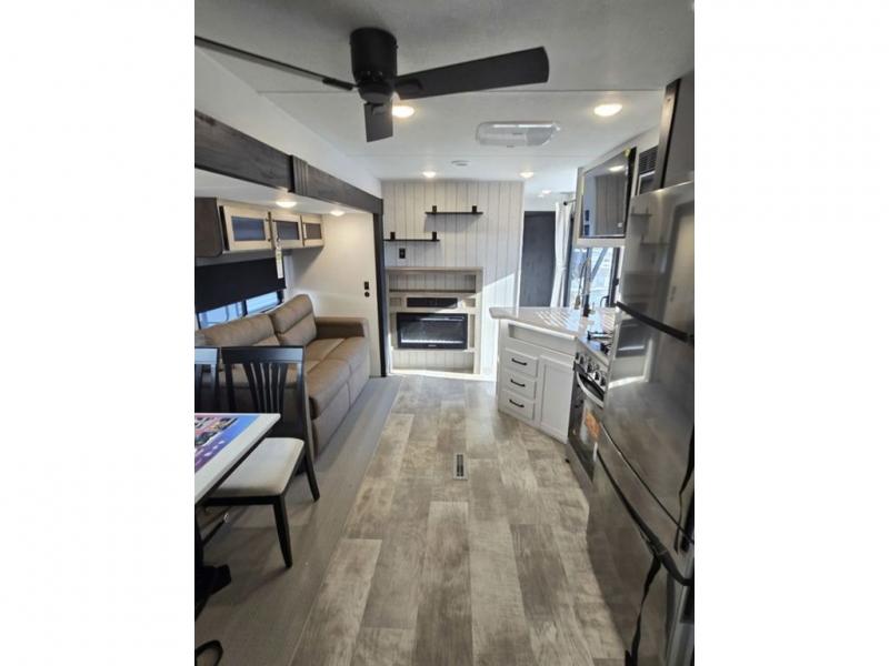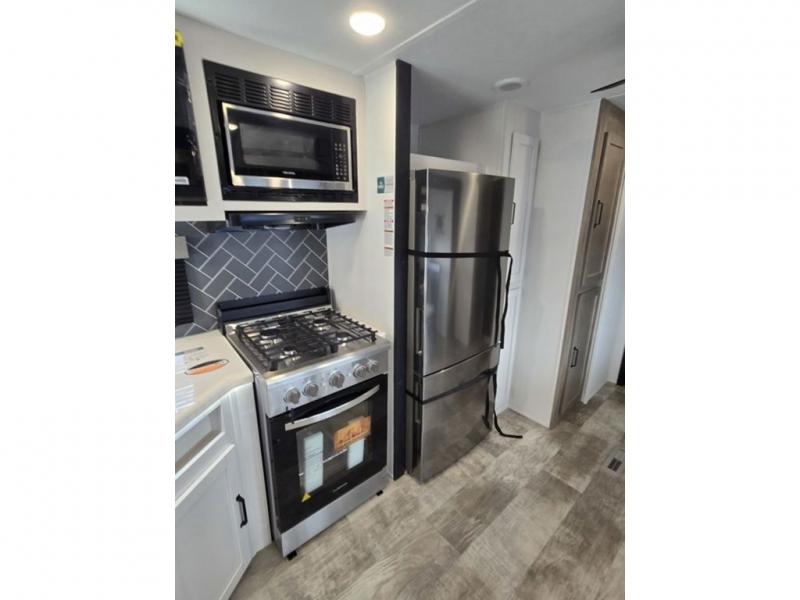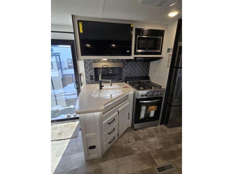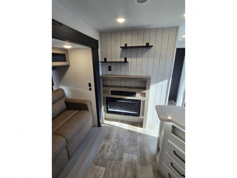 This destination trailer will probably be in the family for years to come with all of its features and amenities such as the rear private bunkhouse with a half bath attached, the dual entry doors for a smooth flow of traffic, and the spacious bedroom with a slide out king-size bed. There is even a closet with the option to add washer and dryer prep. The bunkhouse includes a slide out bunk with a jiffy sofa below, a slide out set of bunks, plus an entertainment center in between two wardrobes. The main living and kitchen area offers full amenities, a U-shaped dinette to dine at, and a sofa to relax on. You even have an optional outside kitchen to cook meals in the great outdoors!