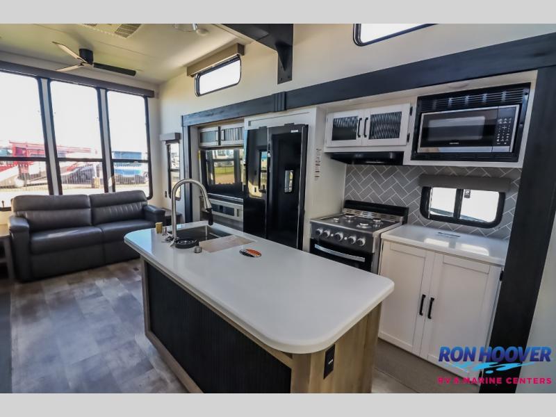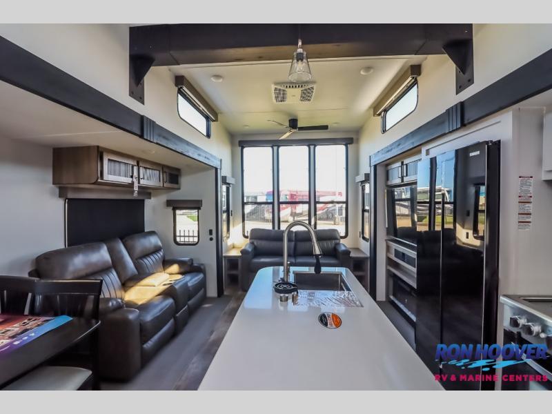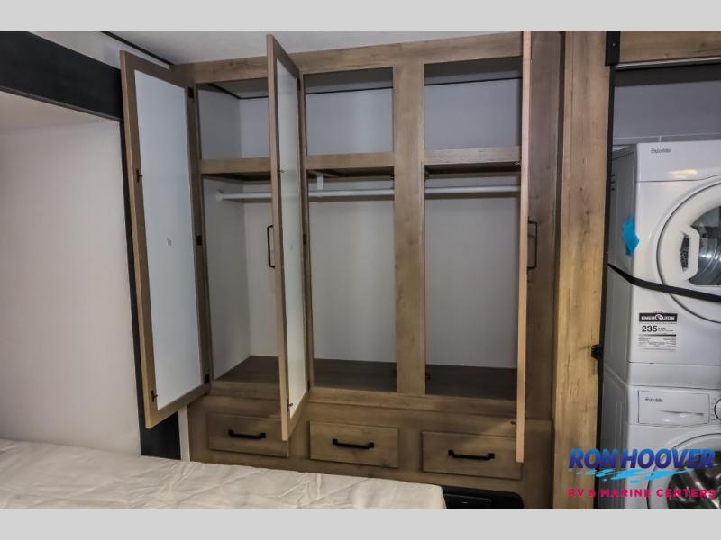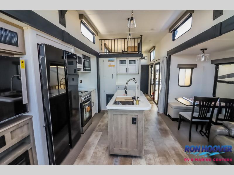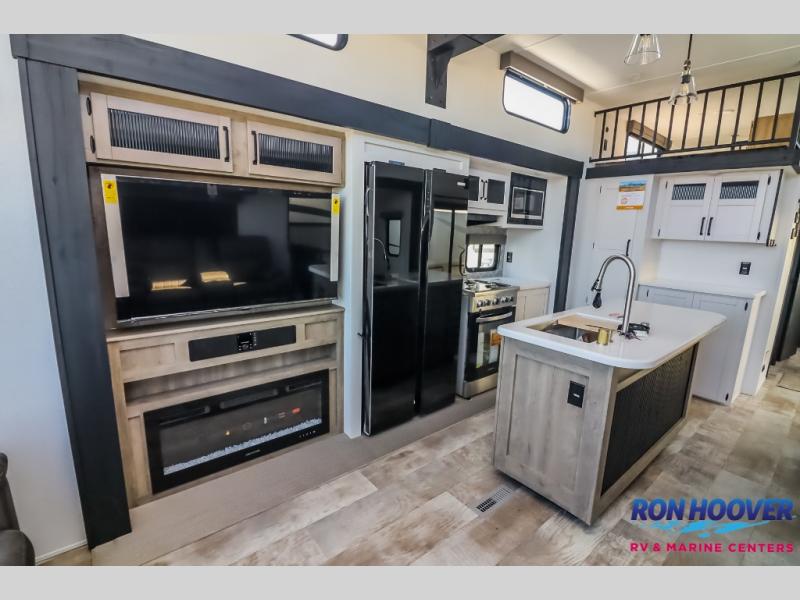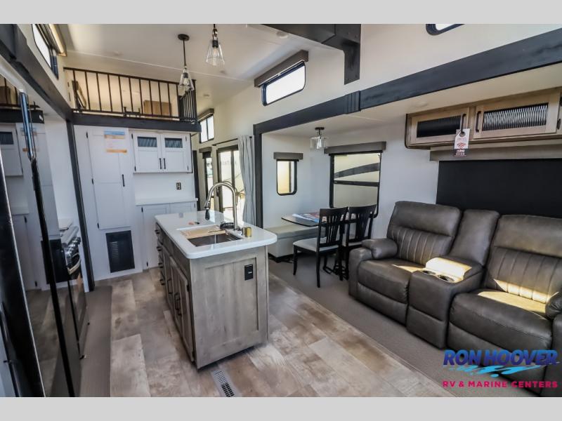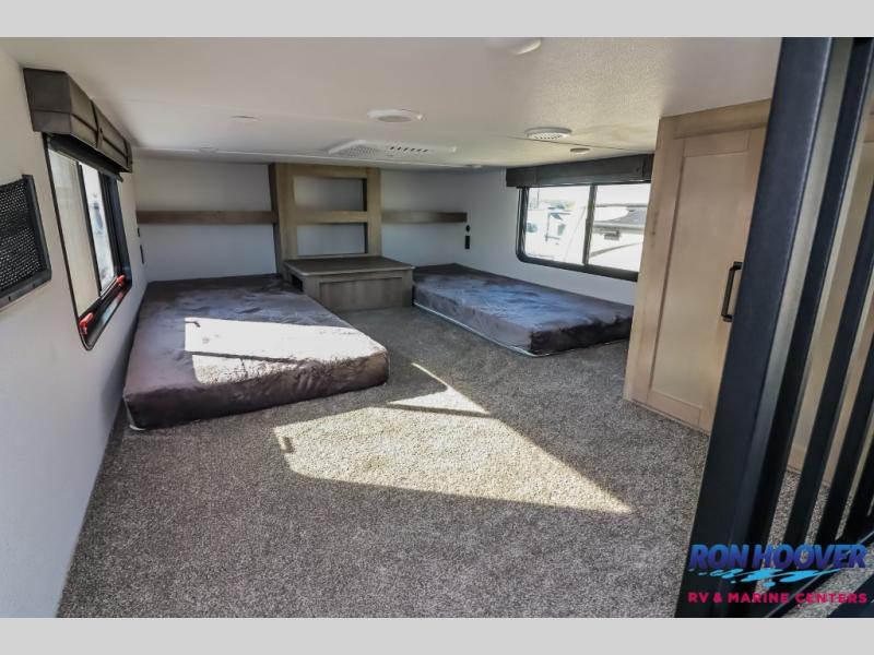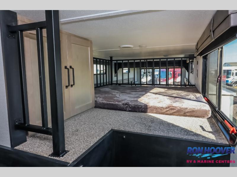 Wherever your destination may be, you can be sure to enjoy it to the fullest with this trailer in tow! With two entry doors, you can enter in through the front private bedroom or the main living area. The bedroom includes a king bed slide out, a desktop if you need to work from home, and a wardrobe/closet to keep your clothes organized. There is also a closet with the option to add washer and dryer prep. Just outside this room are steps that lead to the large loft area with a 58" x 58" bunk mat and a cabinet on one side, plus two 32" x 80" bunk mats on the other. There is also a front cabinet and a wardrobe/closet for plenty of storage space. Once you've headed back downstairs, you can relax on the dual recliners, rear sofa, or free-standing table with a bench and two seats. And the chef of your group will love the kitchen with its residential style refrigerator and pantry, kitchen island, and four burner cooktop!