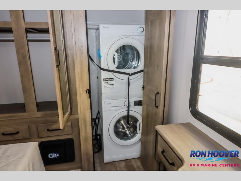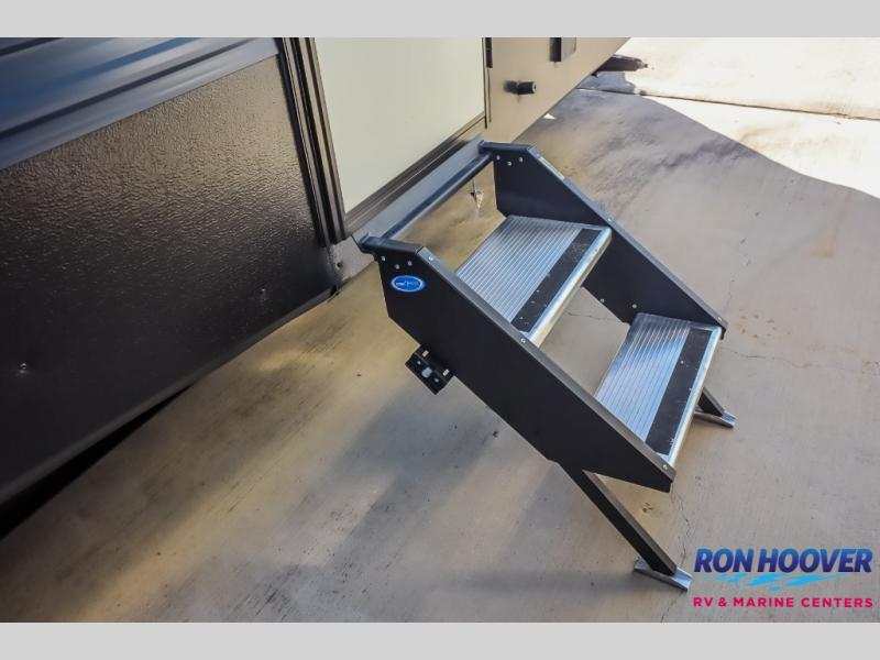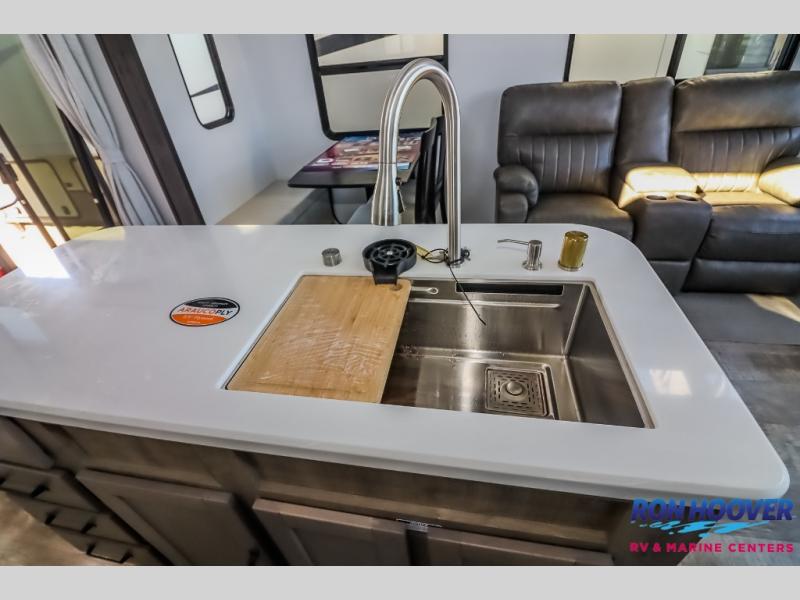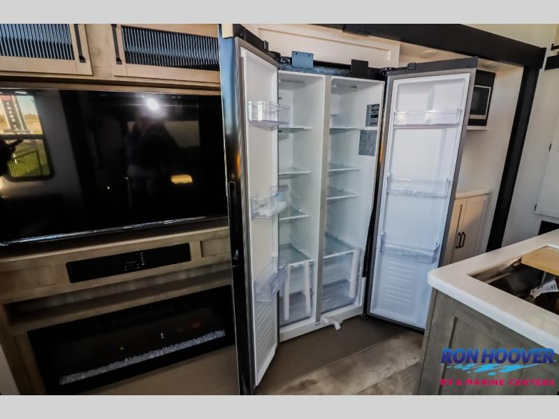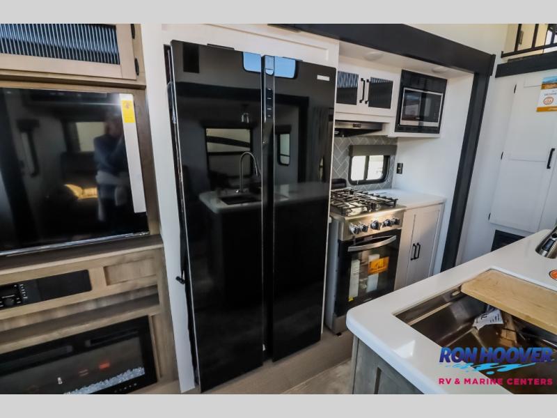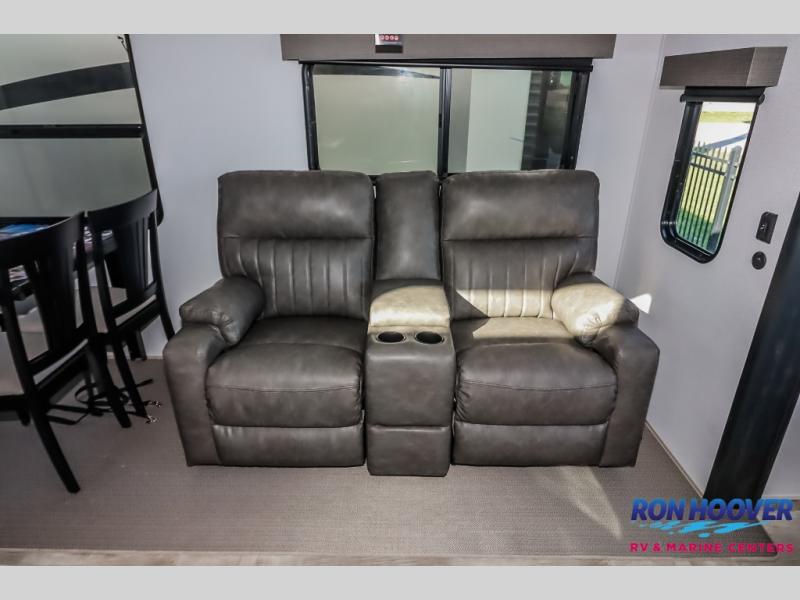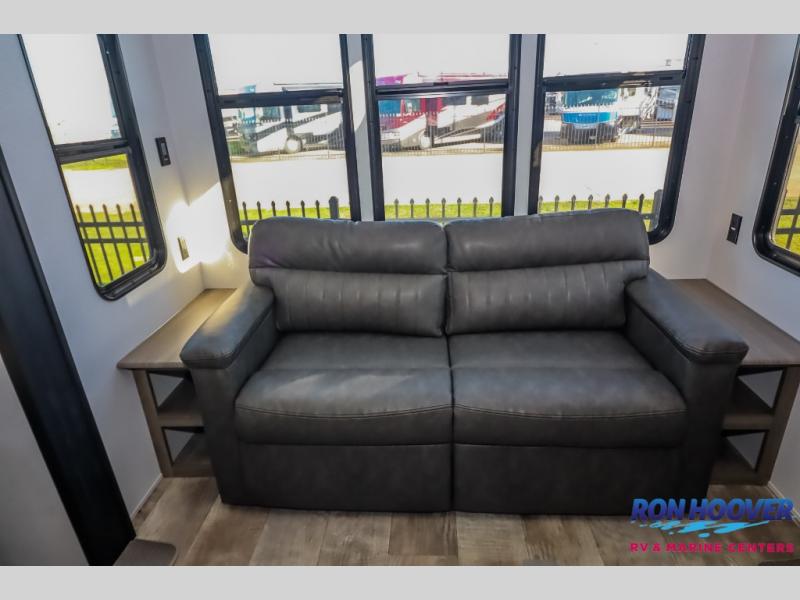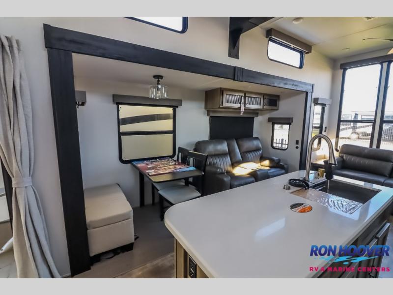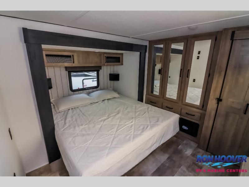 Wherever your destination may be, you can be sure to enjoy it to the fullest with this trailer in tow! With two entry doors, you can enter in through the front private bedroom or the main living area. The bedroom includes a king bed slide out, a desktop if you need to work from home, and a wardrobe/closet to keep your clothes organized. There is also a closet with the option to add washer and dryer prep. Just outside this room are steps that lead to the large loft area with a 58" x 58" bunk mat and a cabinet on one side, plus two 32" x 80" bunk mats on the other. There is also a front cabinet and a wardrobe/closet for plenty of storage space. Once you've headed back downstairs, you can relax on the dual recliners, rear sofa, or free-standing table with a bench and two seats. And the chef of your group will love the kitchen with its residential style refrigerator and pantry, kitchen island, and four burner cooktop!