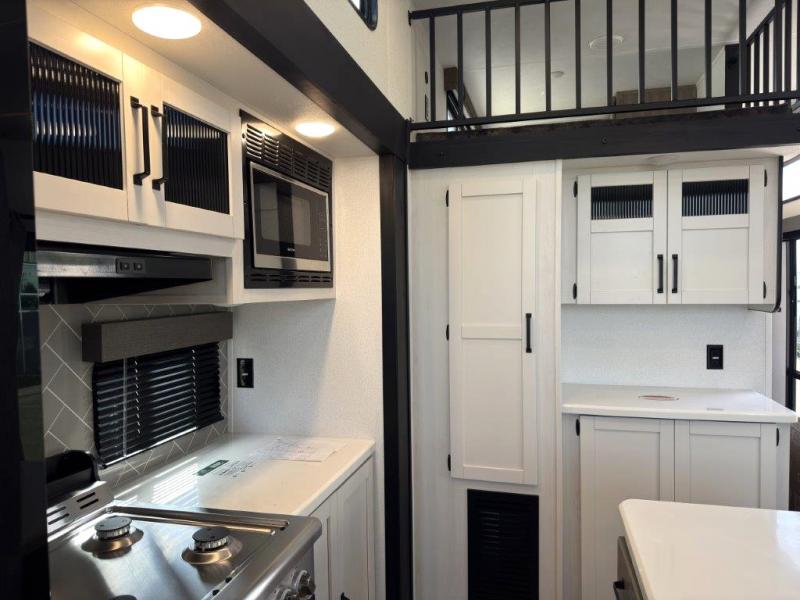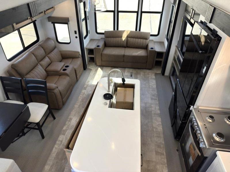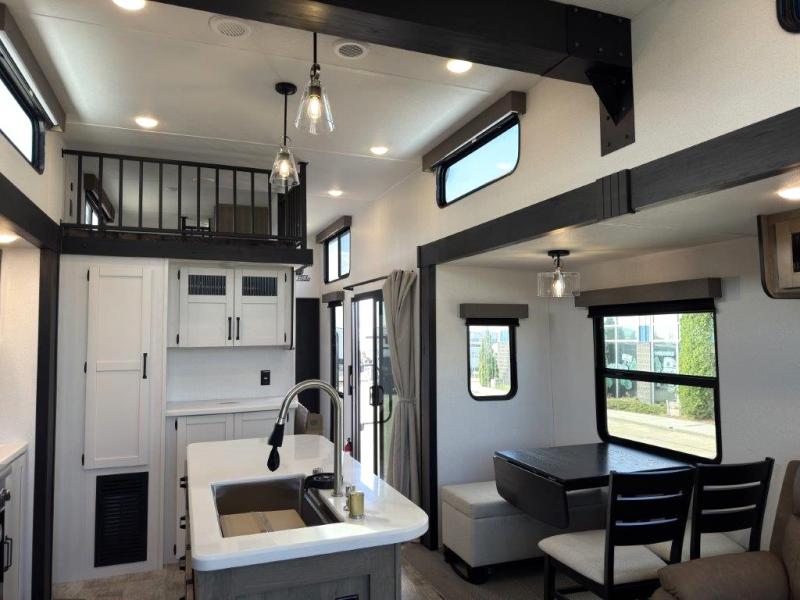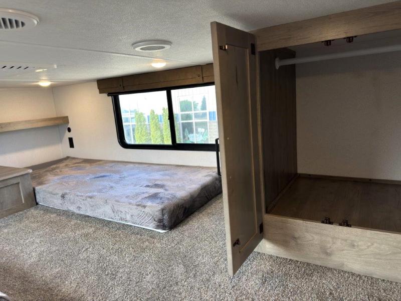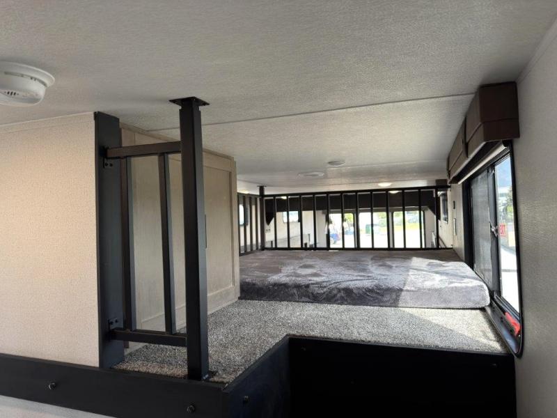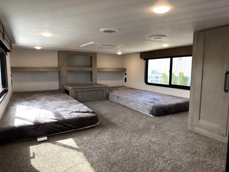 Wherever your destination may be, you can be sure to enjoy it to the fullest with this trailer in tow! With two entry doors, you can enter in through the front private bedroom or the main living area. The bedroom includes a king bed slide out, a desktop if you need to work from home, and a wardrobe/closet to keep your clothes organized. There is also a closet with the option to add washer and dryer prep. Just outside this room are steps that lead to the large loft area with a 58" x 58" bunk mat and a cabinet on one side, plus two 32" x 80" bunk mats on the other. There is also a front cabinet and a wardrobe/closet for plenty of storage space. Once you've headed back downstairs, you can relax on the dual recliners, rear sofa, or free-standing table with a bench and two seats. And the chef of your group will love the kitchen with its residential style refrigerator and pantry, kitchen island, and four burner cooktop!