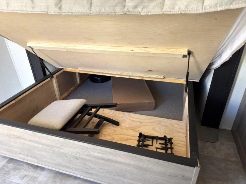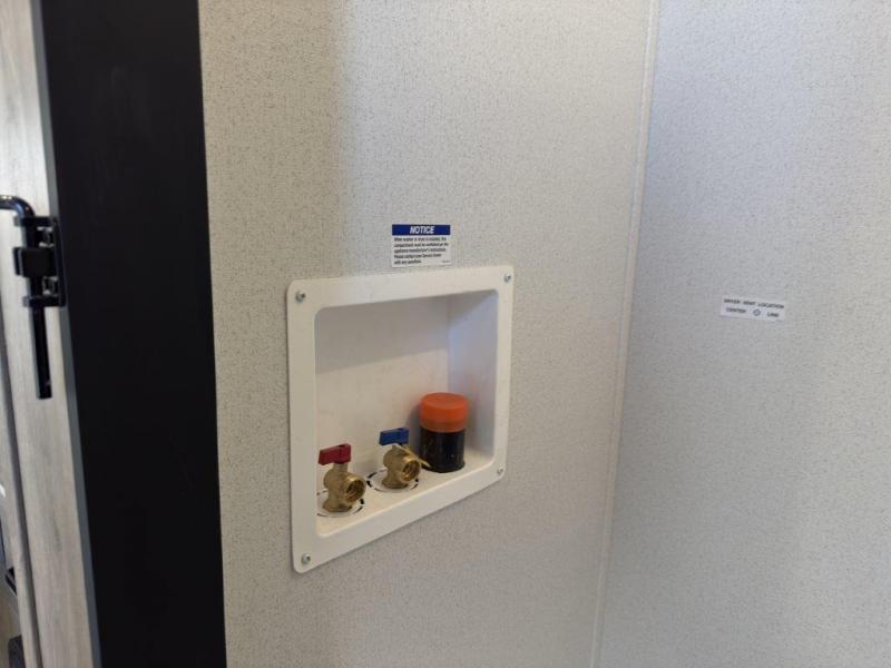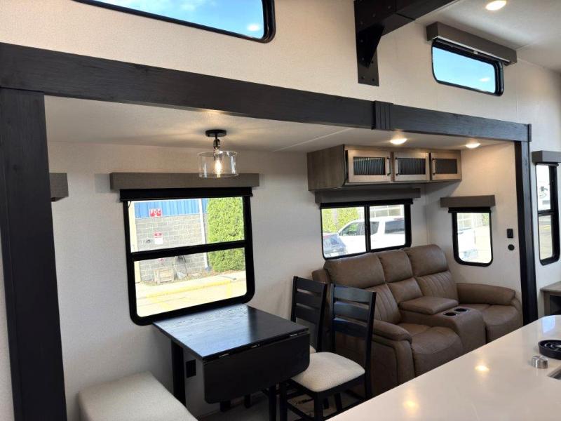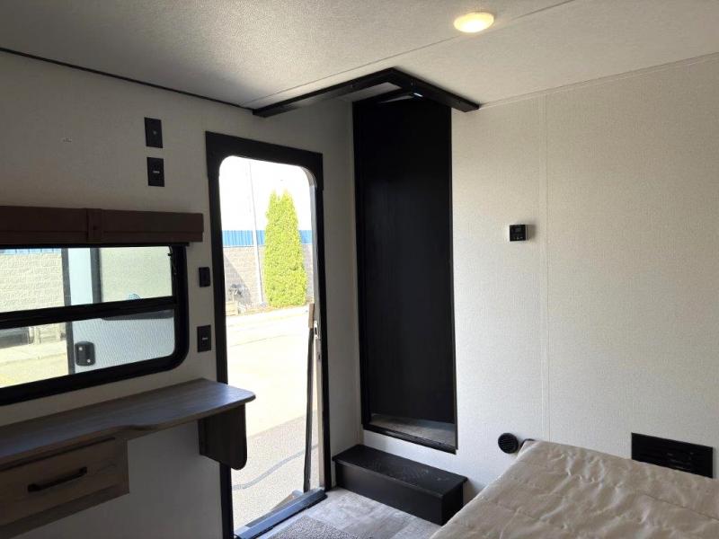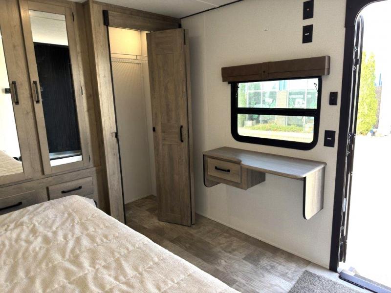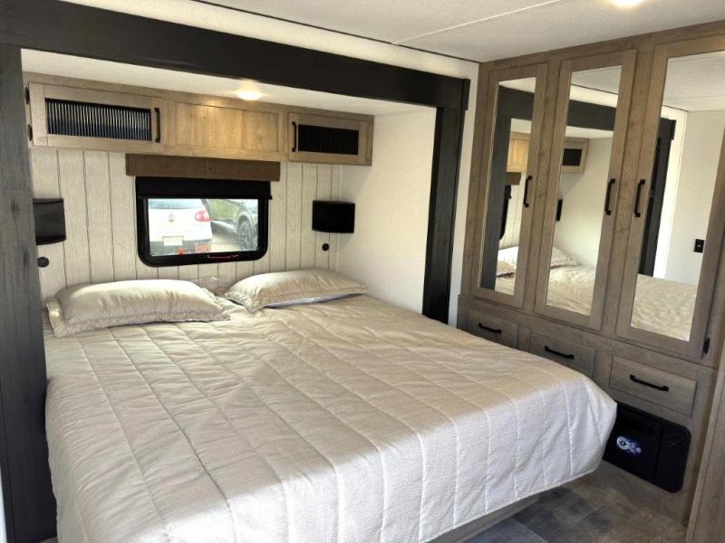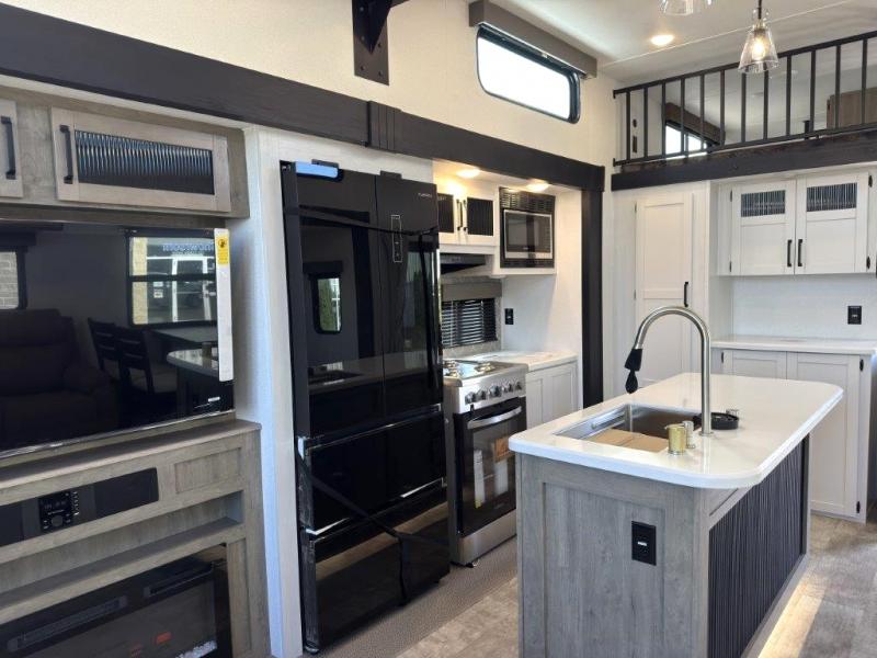 Wherever your destination may be, you can be sure to enjoy it to the fullest with this trailer in tow! With two entry doors, you can enter in through the front private bedroom or the main living area. The bedroom includes a king bed slide out, a desktop if you need to work from home, and a wardrobe/closet to keep your clothes organized. There is also a closet with the option to add washer and dryer prep. Just outside this room are steps that lead to the large loft area with a 58" x 58" bunk mat and a cabinet on one side, plus two 32" x 80" bunk mats on the other. There is also a front cabinet and a wardrobe/closet for plenty of storage space. Once you've headed back downstairs, you can relax on the dual recliners, rear sofa, or free-standing table with a bench and two seats. And the chef of your group will love the kitchen with its residential style refrigerator and pantry, kitchen island, and four burner cooktop!