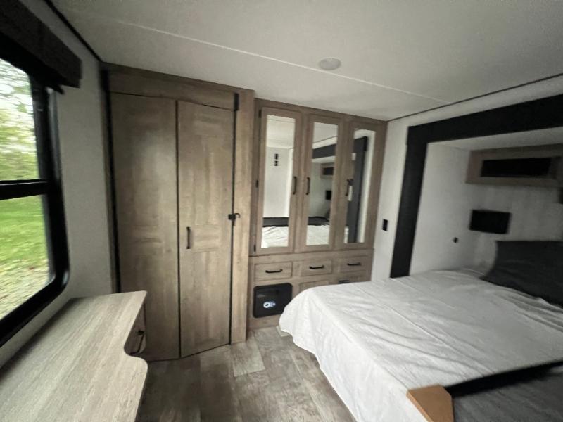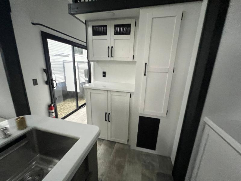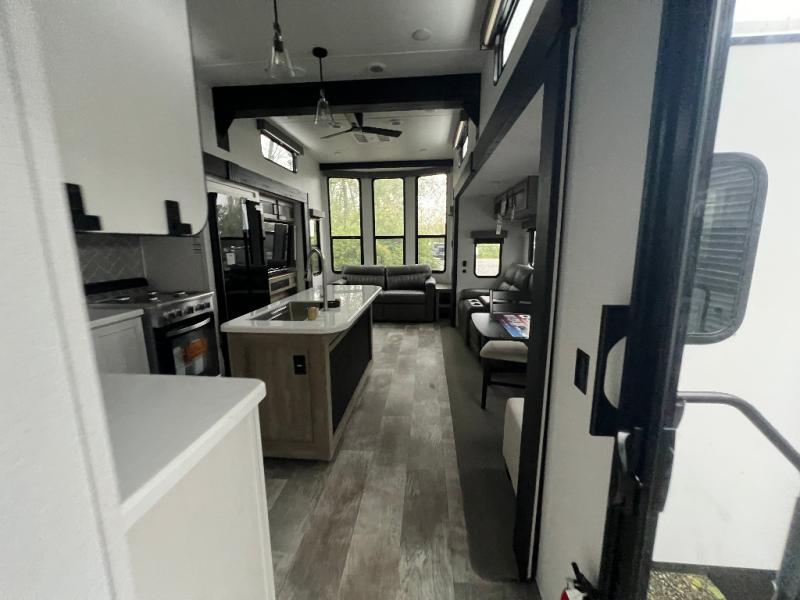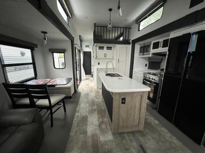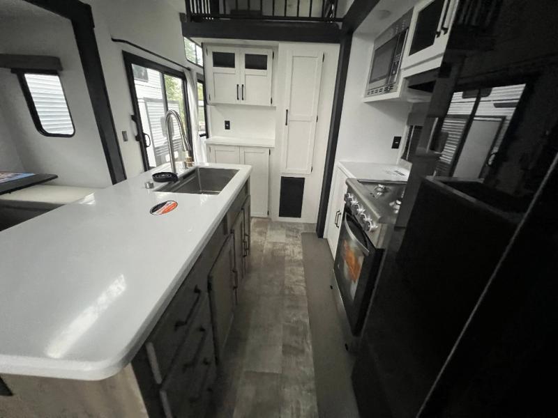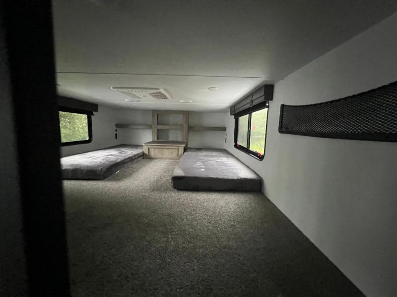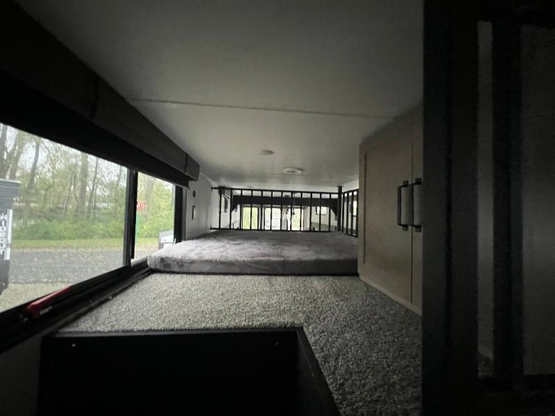 This loft model is the perfect destination trailer for a family of six or more! The upper loft is over the rear bedroom and mid-coach bath featuring two 32" x 69" beds and a 58" x 58" bed over the bath portion with cabinets and a wardrobe/closet for your things. On the lower level in back, a private bedroom with private entry/exit includes a king bed slide, plenty of closet space with one featuring a washer/dryer prep option. The full bath offers a 32" x 40" shower, double linen cabinets, plus a toilet and vanity. In the combined kitchen and living area, the dual opposing slides really open up the space. Here you will find a kitchen island with a large sink, a free standing table with one bench and two chairs, plus two recliners along the curb side slide. Opposite, your kitchen appliances and entertainment center with a residential style refrigerator for your perishables. The very front of the unit features a sofa, and there are plenty of storage spaces between overhead cabinets, pantry/linen and wardrobe storage, plus outside compartments for your things as well.