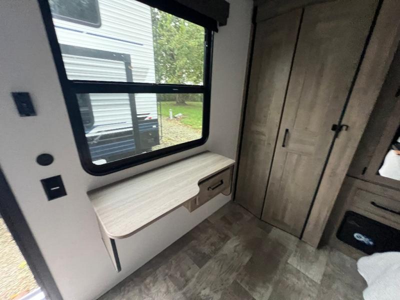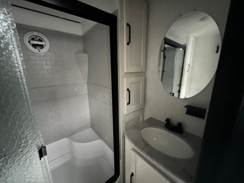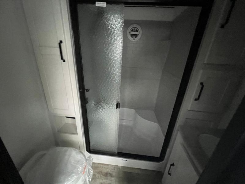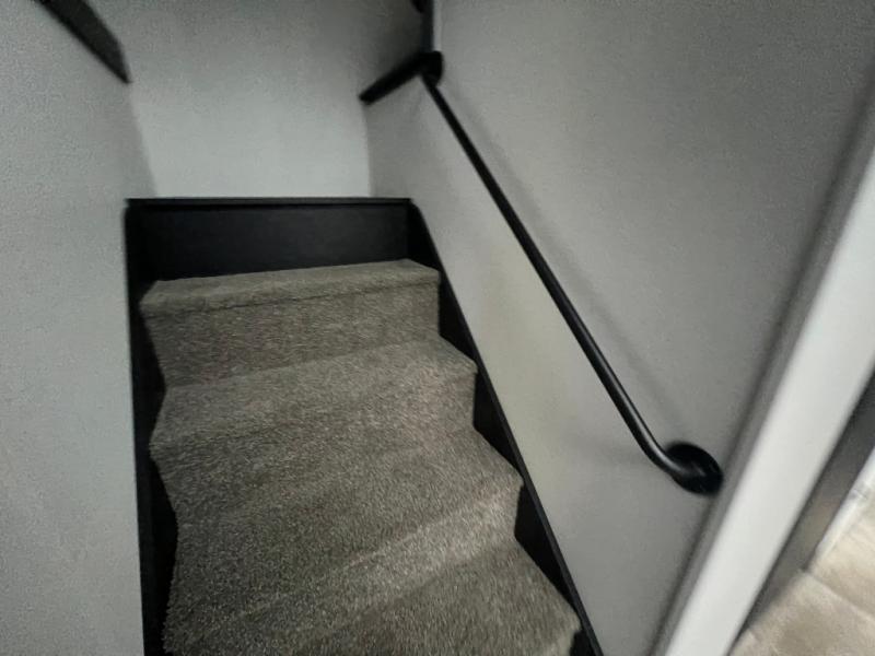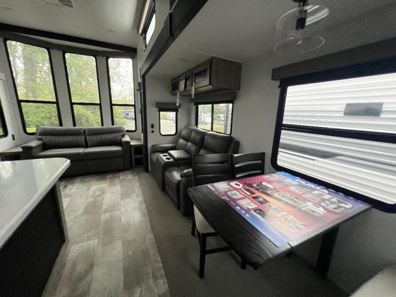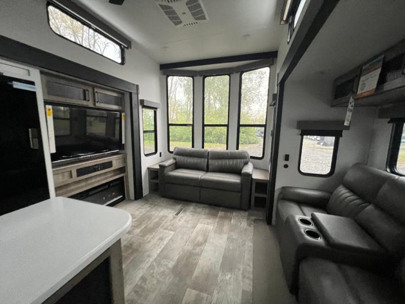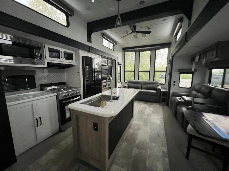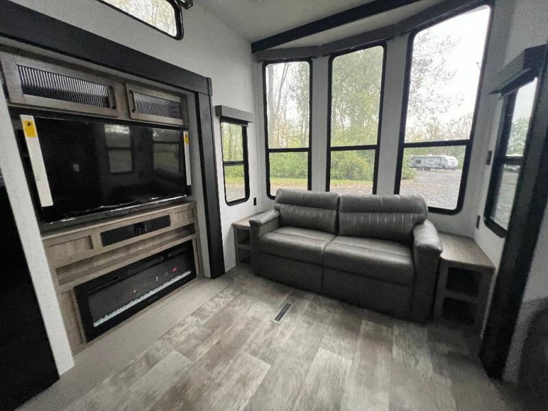 This loft model is the perfect destination trailer for a family of six or more! The upper loft is over the rear bedroom and mid-coach bath featuring two 32" x 69" beds and a 58" x 58" bed over the bath portion with cabinets and a wardrobe/closet for your things. On the lower level in back, a private bedroom with private entry/exit includes a king bed slide, plenty of closet space with one featuring a washer/dryer prep option. The full bath offers a 32" x 40" shower, double linen cabinets, plus a toilet and vanity. In the combined kitchen and living area, the dual opposing slides really open up the space. Here you will find a kitchen island with a large sink, a free standing table with one bench and two chairs, plus two recliners along the curb side slide. Opposite, your kitchen appliances and entertainment center with a residential style refrigerator for your perishables. The very front of the unit features a sofa, and there are plenty of storage spaces between overhead cabinets, pantry/linen and wardrobe storage, plus outside compartments for your things as well.