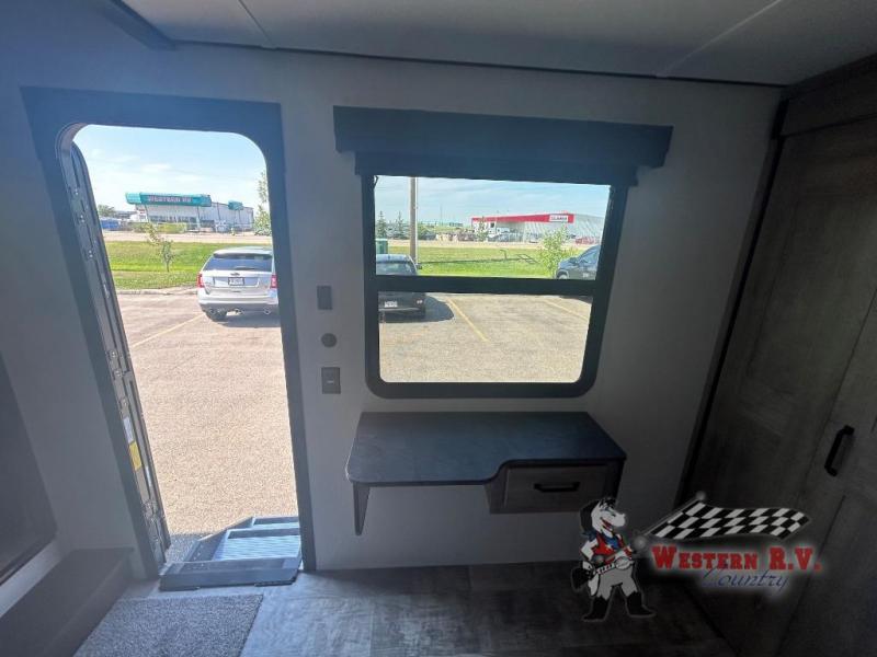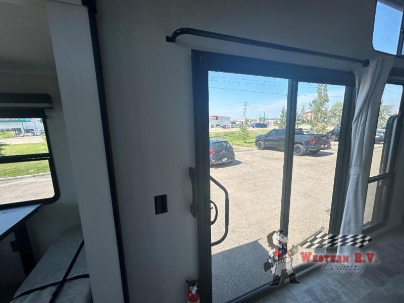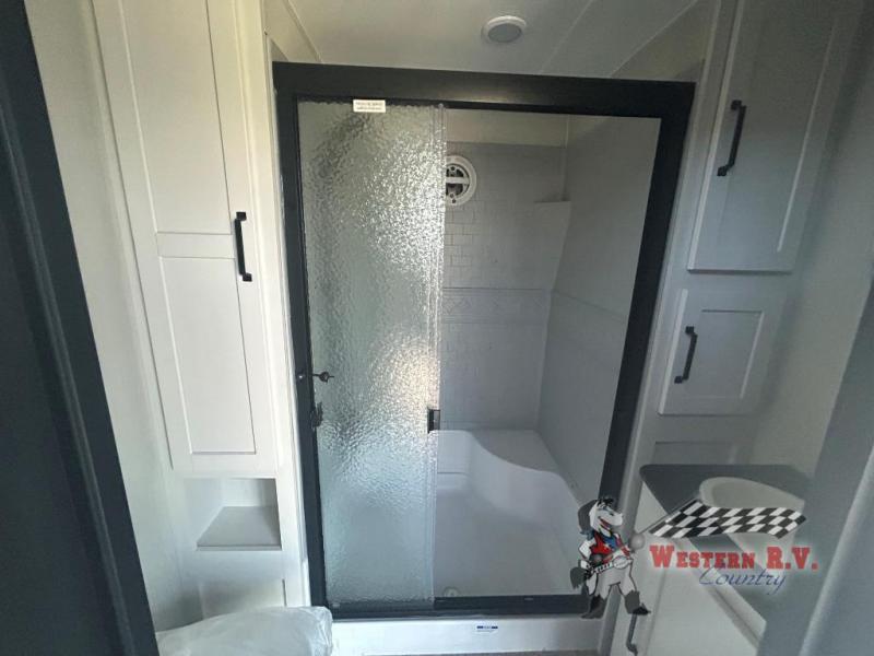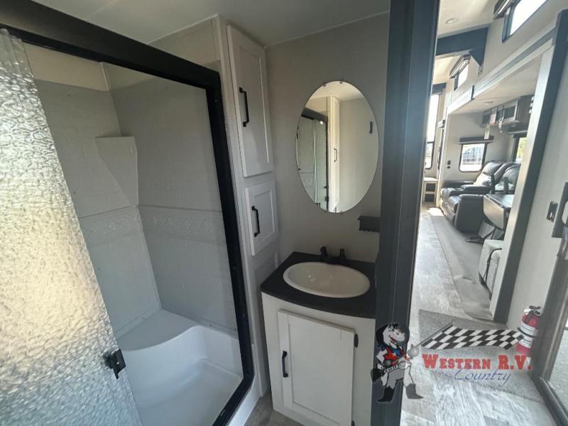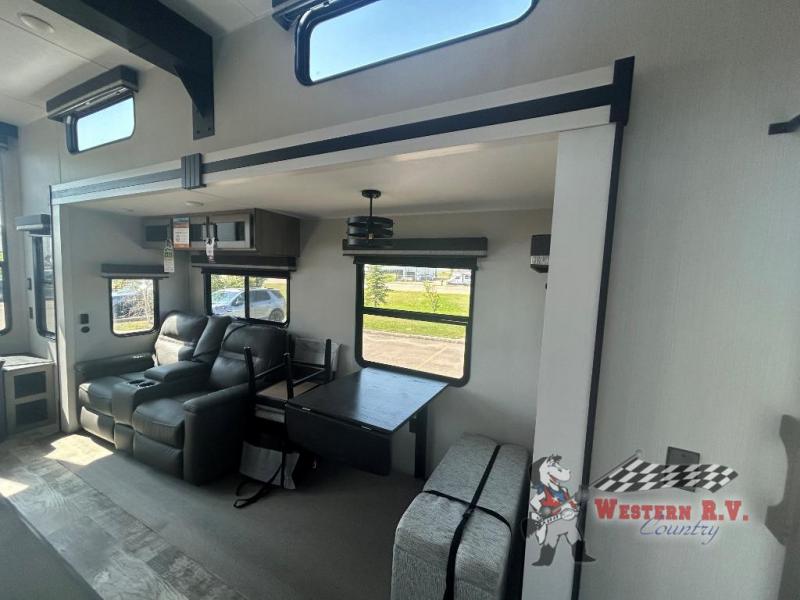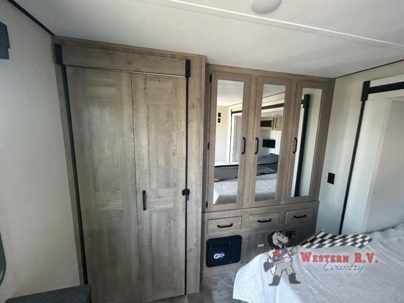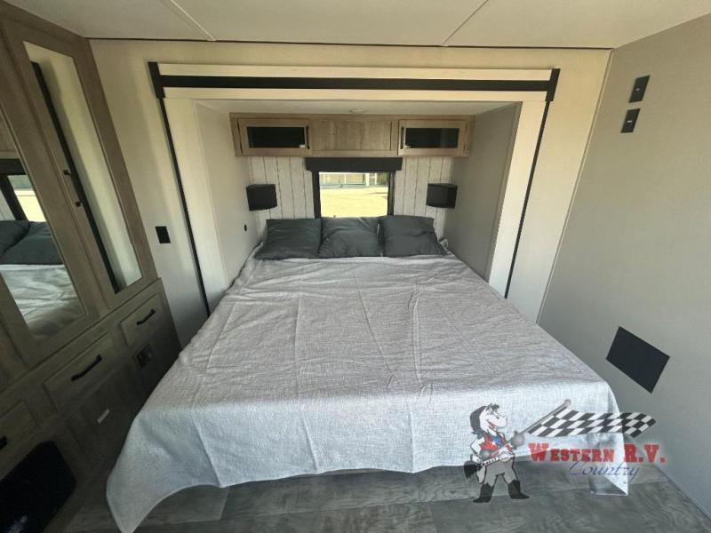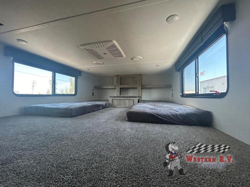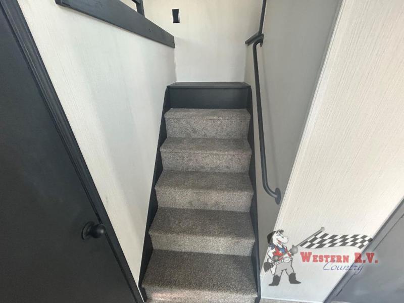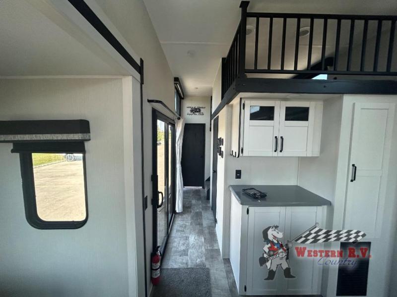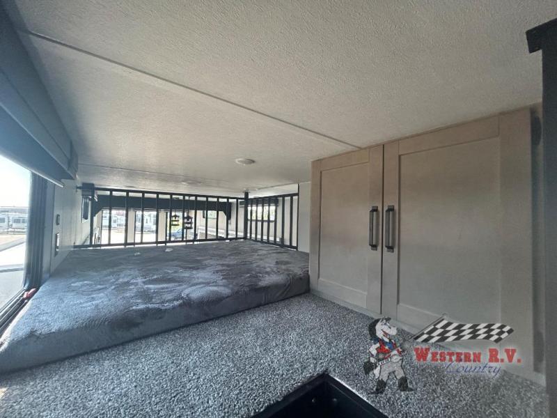Wherever your destination may be, you can be sure to enjoy it to the fullest with this trailer in tow! With two entry doors, you can enter in through the rear private bedroom or the main living area. The bedroom includes a king bed slide out, a wardrobe/closet to keep your clothes organized, plus a closet with the option to add washer and dryer prep. Just outside this room are steps that lead to the large loft area with a 58" x 58" bunk mat and a cabinet on one side, plus two 32" x 69" bunk mats on the other. There is also a cabinet and a wardrobe/closet for plenty of storage space. Once you've headed back downstairs, you can relax on the dual recliners, front sofa, or free-standing table with a bench and two seats. And the chef of your group will love the kitchen with its residential style refrigerator and pantry, kitchen island, and four burner cooktop!